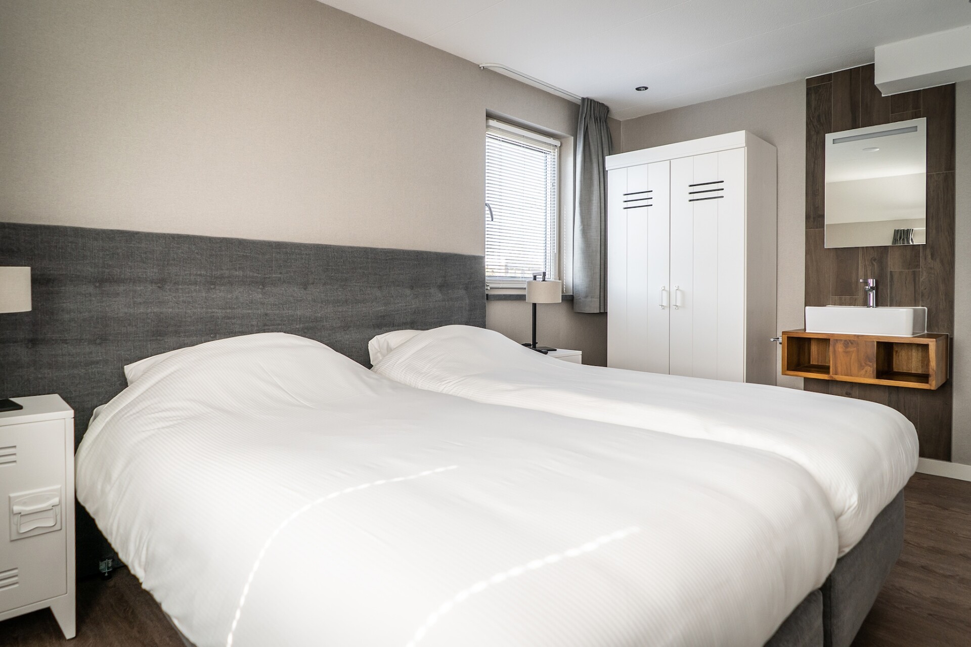 De entree van de woning is een ruime hal met toilet. Hier is ook de bijkeuken met wasmachine gesitueerd. De ruime woonkamer heeft comfortabele banken en een fauteuil. Aan de woonkamer grenst de halfopen keuken. Een ruime slaapkamer op de begane grond heeft twee éénpersoonsbedden, flatscreen televisie en een wastafel. Vanuit de hal gaat een open trap naar boven. Hier zijn twee ruime slaapkamers gesitueerd, beiden met twee éénpersoonsbedden en een flatscreen televisie. De luxe badkamer heeft een inloopdouche, ligbad en dubbele wastafel. Daarnaast is er een apart toilet.
