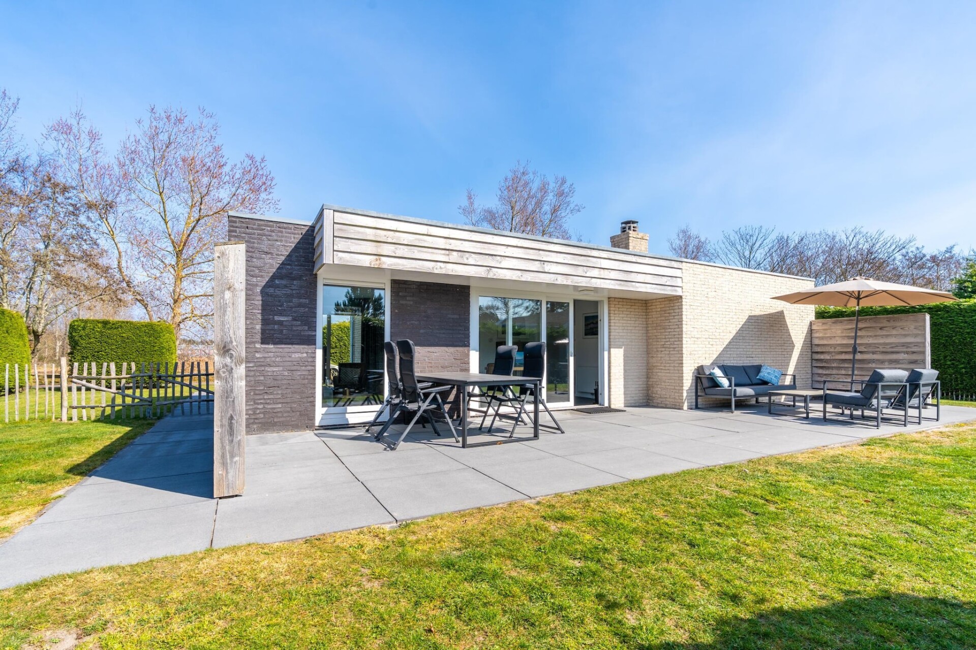 Via een schuifpui in de woonkamer komt je op het terras en in de riante tuin, waar je heerlijk de vakantiedagen kunt doorbrengen. De tuin is geheel omheind en uitermate geschikt om de kinderen of huisdieren vrij rond te laten lopen. Tuinmeubilair, een loungeset en een parasol zijn aanwezig.