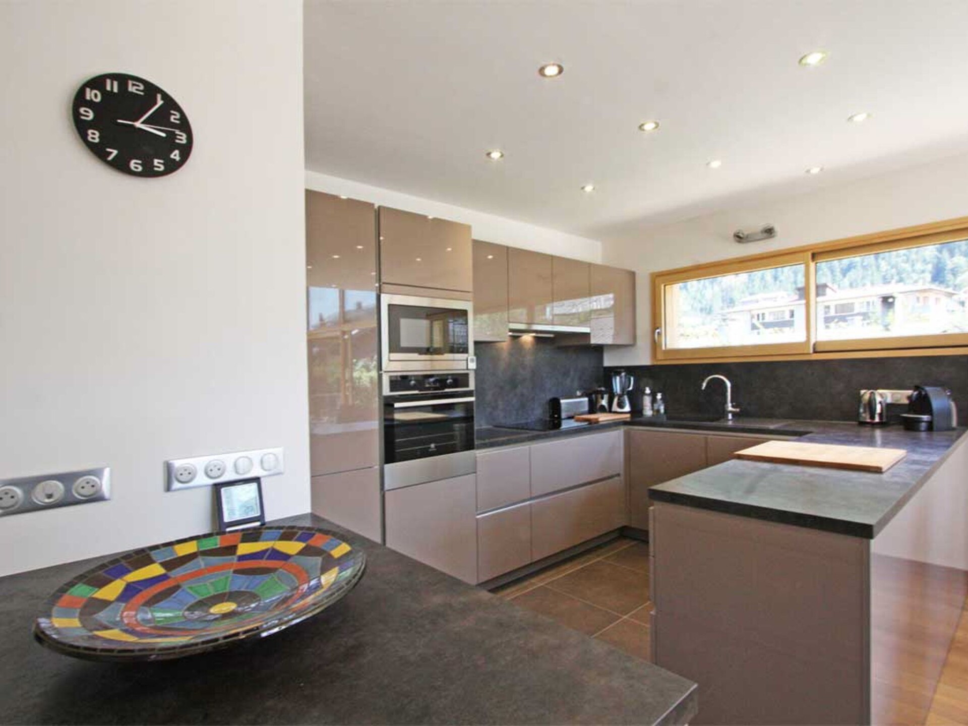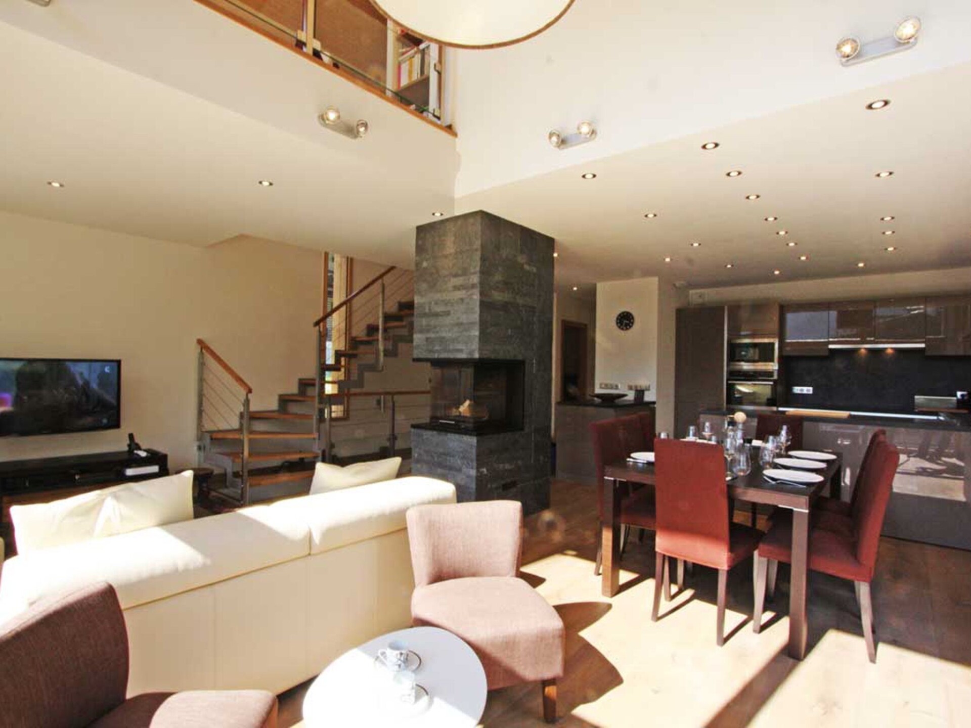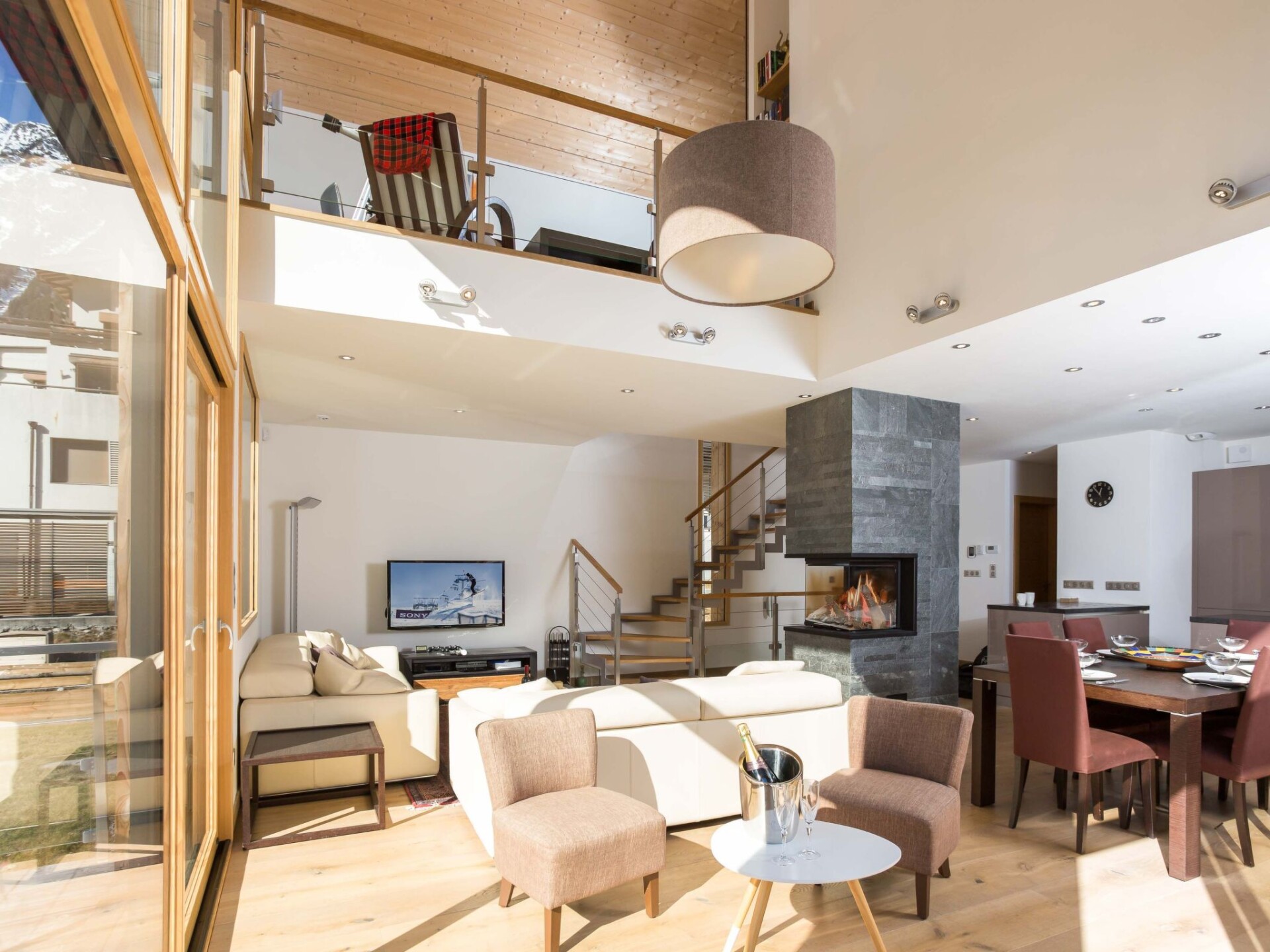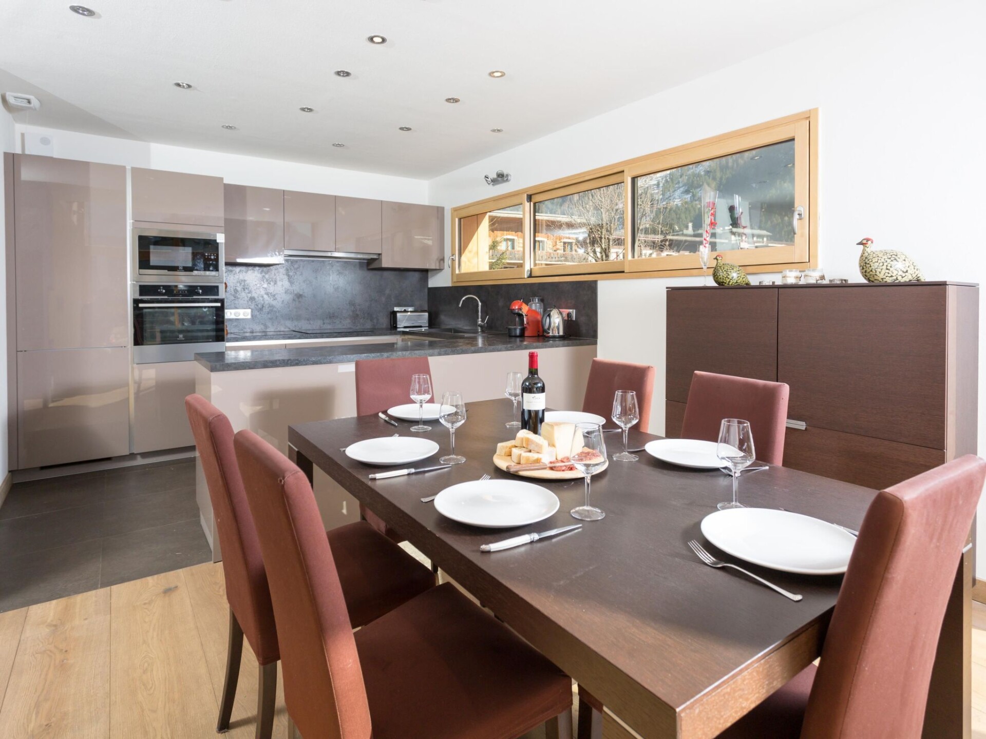 Chalet Raphael is situated right in the centre of Chamonix, just alongside the Aiguille Du Midi train station and is the perfect location for a Chamonix chalet. The town centre starts only 150m from the chalet for shops, bars and restaurants, with the closest eateries just at the end of the street, and a large supermarket is accessible even on foot in less than 10 minutes. The closest main bus stop is 400m away for access throughout the valley for skiing and summer activities.Chalet Raphael is a stunning, newly built, luxury Chamonix chalet, located right in the centre of Chamonix town centre, which benefits from a sunny terrace and garden facing Mont Blanc. The large picture windows from the living area and spacious terrace and garden offer unrivalled views of Mont Blanc, Aiguille du Midi and Glacier des Bossons. The Chamonix chalet has 4 bedrooms and 3 bathrooms, plus open-plan living and dining area centred around a log fire, as well as a peaceful separate reading snug on the first floor. The kitchen is well-equipped to make your stay comfortable, with oven / microwave, raclette and Nespresso coffee machine, and the dining table seats 8. There is a telescope provided at Chalet Raphael for your enjoyment in the living room, as well as French satellite TV channels, Apple TV, Playstation 4 and DVD player. There are DVDs and CDs to choose from, and an upright piano.The lower ground level also offers gym equipment for your use and there is ski storage in the garage, while the driveway offers external parking. Key Features Sleeps 8 Approx. 200 sqm of living space 4 bedrooms, 3 bathrooms 2 x King bedrooms & 2 x Twin or King Bedrooms Sunny terrace and private garden, ideal for families Uninterrupted panoramic views of Mont Blanc Lounge with log fire Flatscreen TV, French satellite channels, Apple TV, DVD player & Playstation 4 Wifi internet access Dining room area with seating for 8 Well-equipped kitchen with dishwasher, raclette & Nespresso coffee machine (pre-order your capsules) Washing machine and dryer Gym room Piano Ski & boot room / storage for bikes Parking on driveway for up to 3 cars