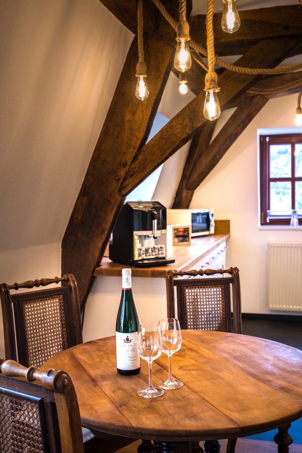 Discover a charming retreat for two in Traben-Trarbach, located in the historic district of Rißbach, which borders directly on the picturesque Moselle. In this lovingly restored half-timbered house dating back to 1734, which has been furnished with care and a sense of history, you will find your perfect holiday home. Here, an ambience steeped in history is combined with modern comforts to make your stay unforgettable.Inside, you can expect high-quality living comfort, equipped with a modern fitted kitchen that leaves nothing to be desired. For your well-being, the sanitary area has been redesigned, complete with shower and bath, to guarantee relaxing moments after a day of discovery. The existing comfort is rounded off by technical amenities such as TV and WLAN, so that you can always stay connected or simply sit back and relax.Enjoy the private outdoor areas of this special holiday flat. A terrace directly in front of the house, adjacent to a small garden for communal use, provides the perfect setting for cosy hours with a glass of local wine. This idyllic corner is ideal for unwinding and savouring the special atmosphere of the Moselle.The surrounding area offers a variety of opportunities to discover the nature and culture of the Moselle region. Just a few steps away, the vineyards begin, inviting you to take long walks. The nearby cycle path along the Moselle also entices you to embark on adventures that will take you right into the heart of Traben in just 20 minutes. Here, in the town centre, which is only 1000m away, you can immerse yourself in the lively hustle and bustle and experience the local gastronomy and culture up close.Make this historic holiday flat in Traben-Trarbach your home away from home and enjoy a unique combination of relaxation, culture and nature. Whether you are looking for relaxation or adventure - here you will find the ideal starting point for a variety of activities in the picturesque Moselle region. Experience an unforgettable time in a domicile that breathes history and yet lacks none of the modern comforts.