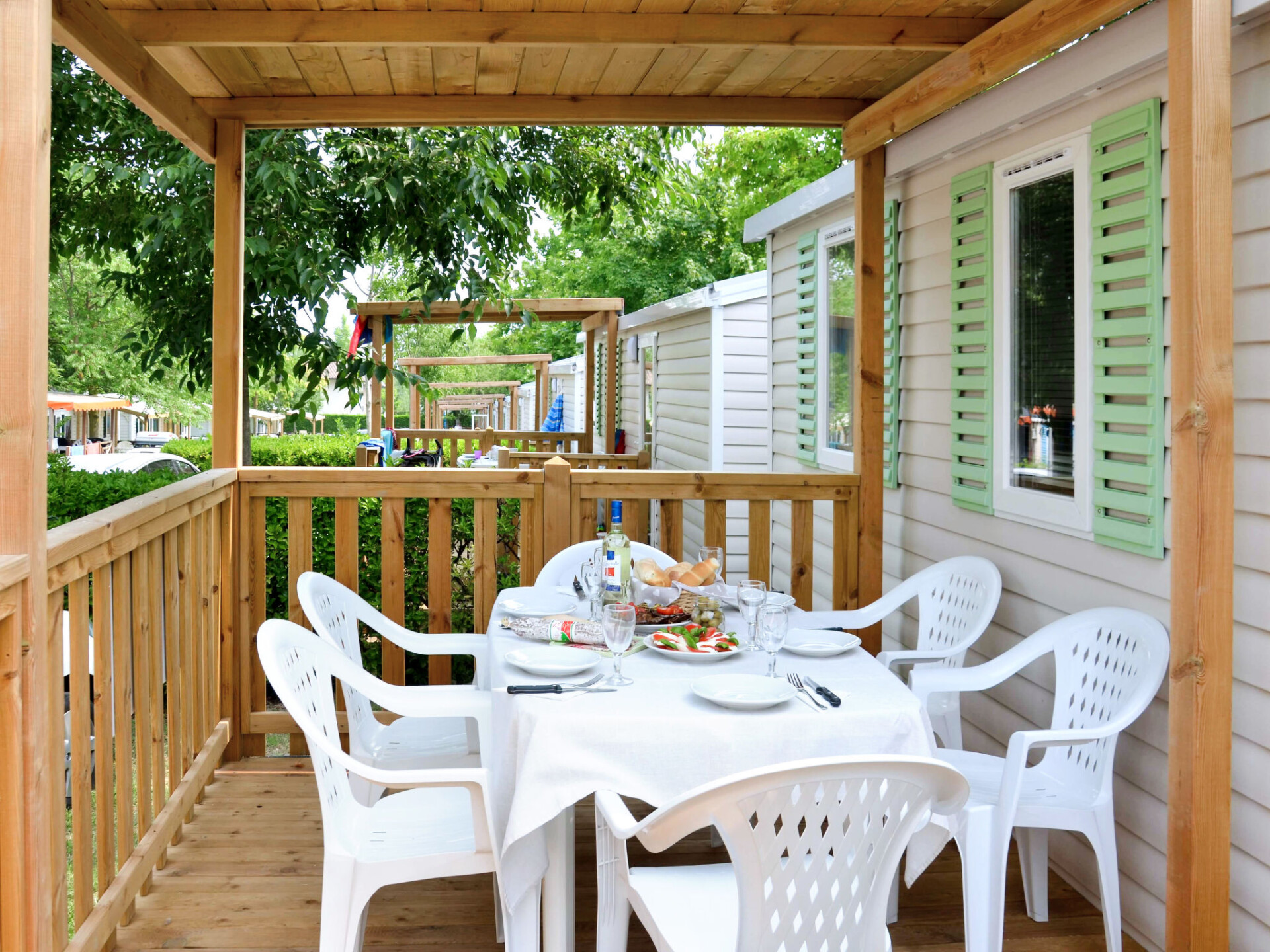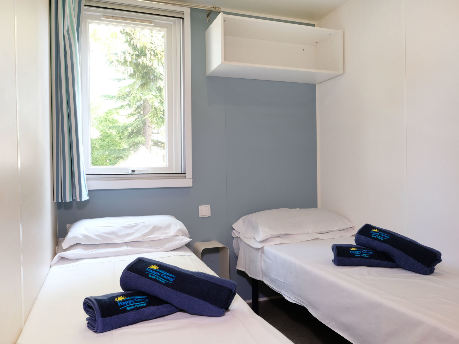 "Happy Premium", 4-kamers mobilhome 30 m2. Comfortabel ingericht: woon-/slaapkamer met eettafel, elektrische verwarming en air-conditioning. 1 kamer met 1 2-pers bed (140 cm, lengte 190 cm). 2 kamers, elke kamer heeft 2 bedden (70 cm, lengte 190 cm). Open keuken (4-pits kookplaat, magnetron, diepvriezer, elektrische koffiemachine). Douche/WC. Air-conditioning (extra). Terras gedeeltelijk overdekt. Terrasmeubelen, elektrische barbecue (verrijdbaar), ligstoelen (2). Ter beschikking: klamboe. Parkeerplaats (1 Auto). Niet rokers woning. IT023006B143AX8QZE