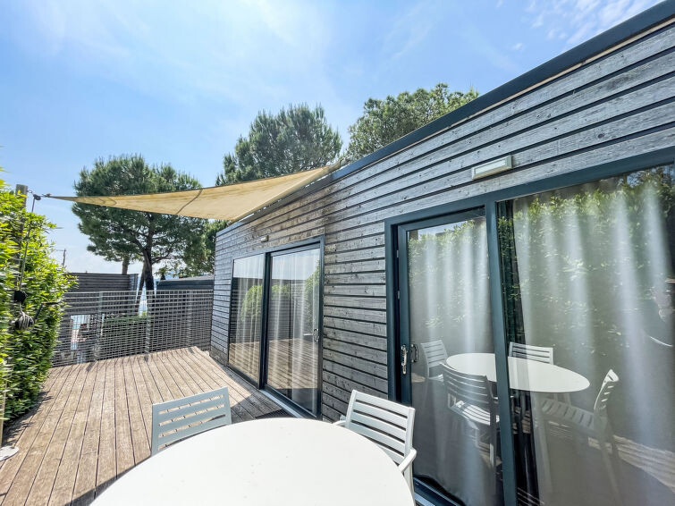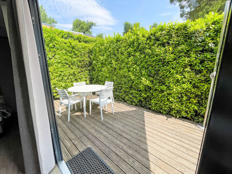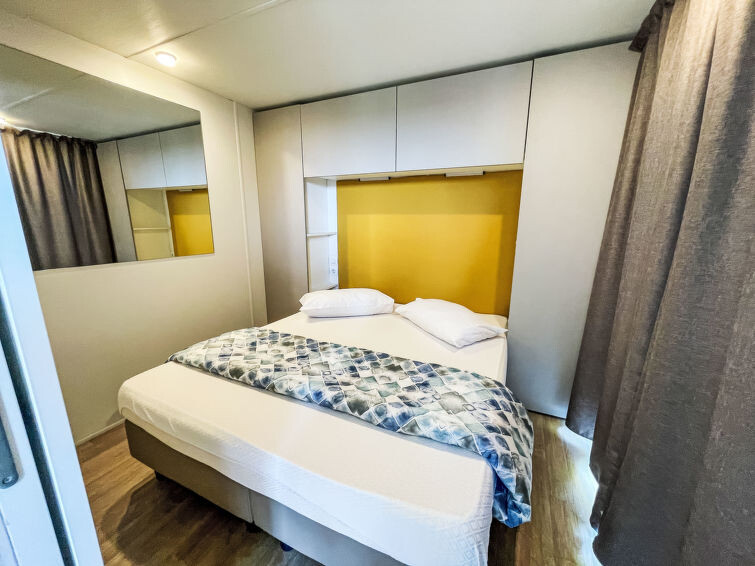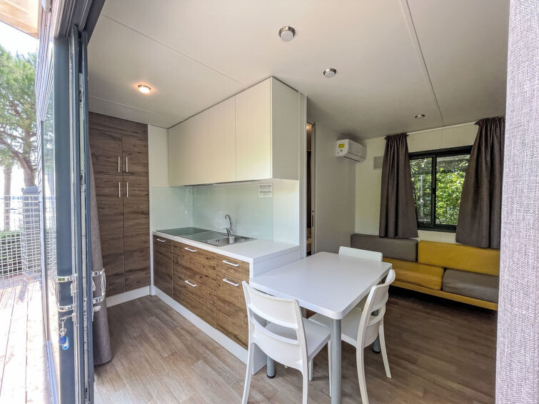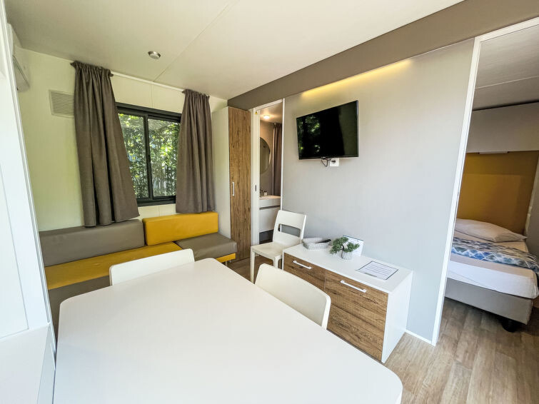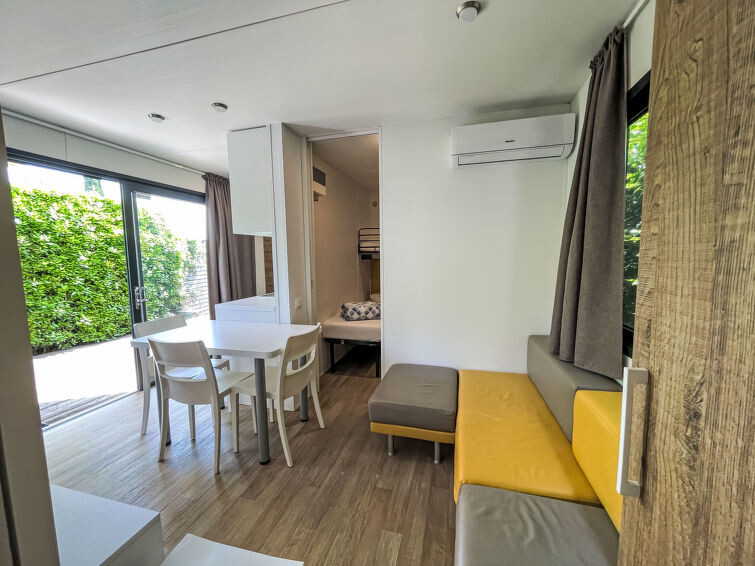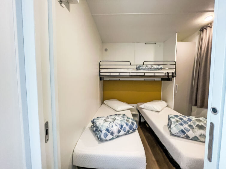 "Baia New Project", 3-kamers mobilhome 34 m2. Modern ingericht: woon-/eetkamer met eethoek en Digitale TV. Uitgang naar het terras. 1 kamer met 1 2-pers bed (140 cm). 1 kamer met 2 bedden (70 cm), 1 x 1 stapelbedden (65 cm, lengte 170 cm). Kookhoek (4 inductiekookplaten, diepvriezer, elektrische koffiemachine). Douche/bidet/WC. Air-conditioning. Terras. Terrasmeubelen. Ter beschikking: kinderbed (extra). Parkeerplaats (1 Auto). Niet rokers woning. Maximaal 2 kleine huisdieren/honden toegestaan. Bedindeling is flexibel. Er zijn meer slaapmogelijkheden beschikbaar dan het maximaal toegestane aantal personen dat echter niet mag worden overschreden. IT017171B1ZJWA3YLE