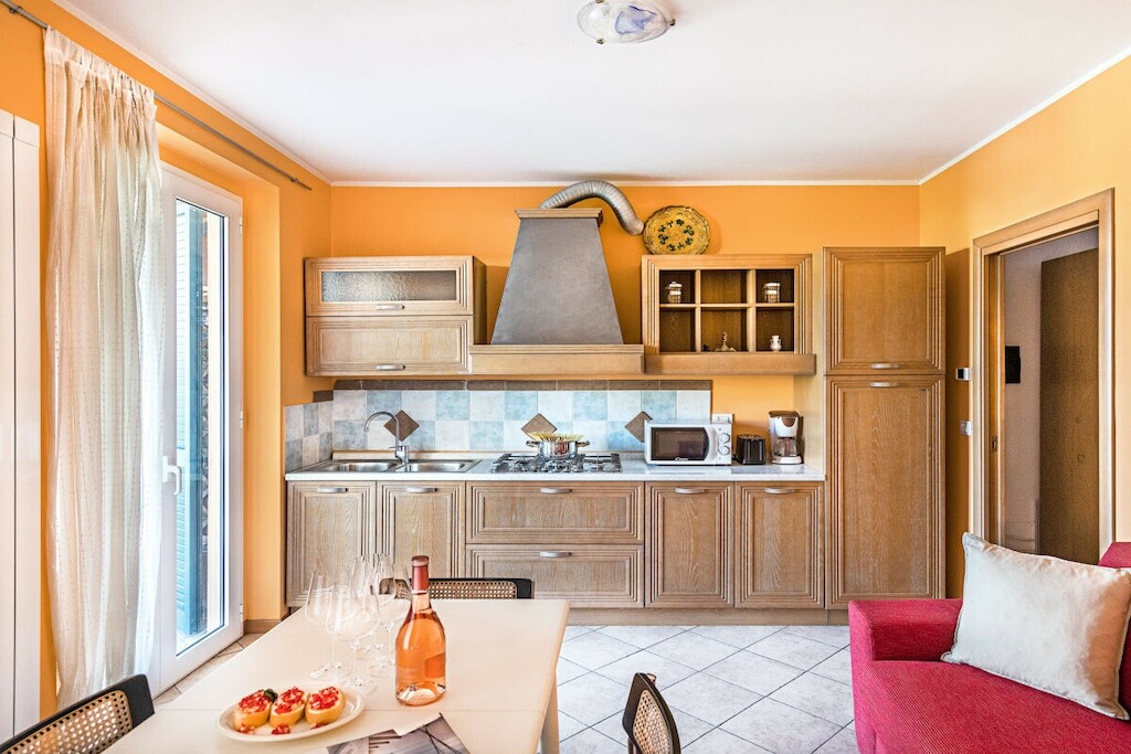 Het appartement, voorzien van gratis Wi-Fi internetverbinding en airconditioning in de woonkamer, verwelkomt zijn gasten met de ruime woonkamer met comfortabele slaapbank voor twee personen, flatscreen-tv, eettafel met stoelen voor 4 personen en open keuken volledig uitgerust met inductiekookplaat, koelkast, vriezer, oven, magnetron, koffiezetapparaat, citruspers, waterkoker en broodrooster. Vanuit de woonkamer ga je naar het terras met een eettafel en stoelen om te ontbijten en buiten te dineren!