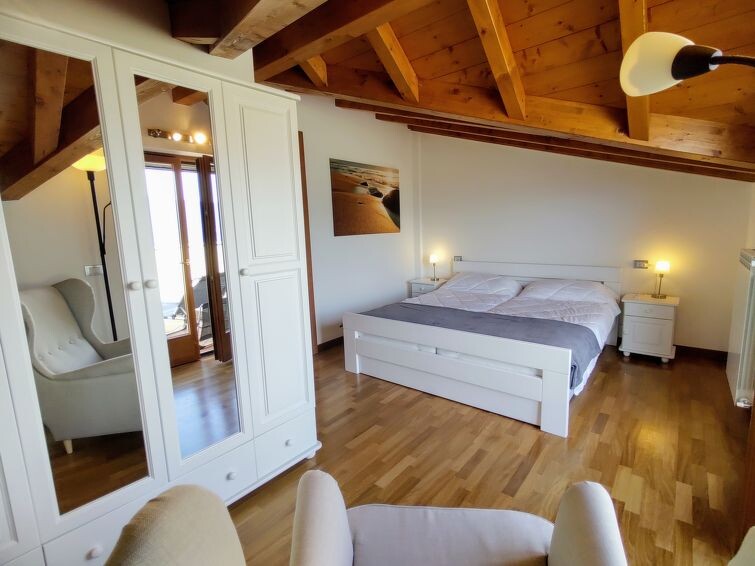Appartement 3-kamers 75 m2, op de bovenste verdieping, op het westen gelegen. Licht, gedeeltelijk afgeschuinde daken, modern en stijlvol ingericht: woon-/eetkamer met eettafel en Sat-TV. Uitgang naar het balkon. 1 2-pers. kamer. Uitgang naar het balkon. 1 kamer met 1 x 2 stapelbedden. Uitgang naar het balkon. Open keuken (oven, afwasmachine, 4 keramische glas kookplaten, broodrooster, waterkoker, magnetron, elektrische koffiemachine). Bad/WC, douche/WC. Gas-verwarming. Parketvloeren. Groot balkon 30 m2, klein balkon. Balkonmeubilair, ligstoelen (2). Zeer mooi uitzicht op het meer. Ter beschikking: wasmachine, kinderstoel, kinderbed. Internet (Internet (WiFi), gratis). Parkeerplaats (1 Auto). Niet rokers woning. Maximaal 1 klein huisdier/hond toegestaan. Privé ingang. IT012114C242WP8TXP