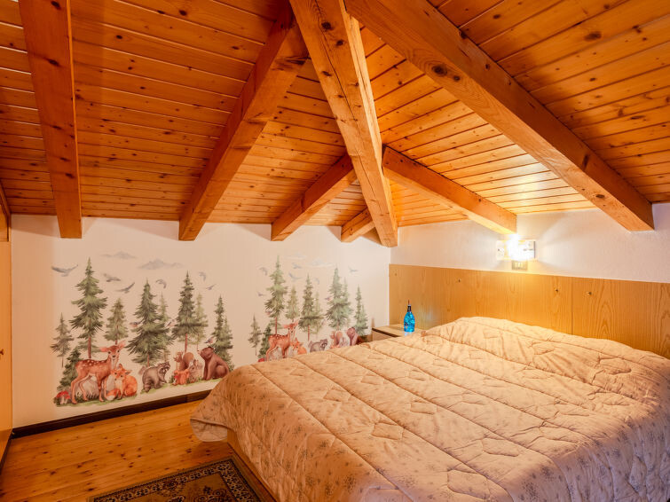 "Ermeti", appartement 4-kamers 95 m2 op 2 verdiepingen, op verhoogde begane grond. Ruim en licht, gedeeltelijk afgeschuinde daken, zeer rustiek en gezellig ingericht: woon-/eetkamer met open haard en TV. Uitgang naar het terras, op het zuiden. Groot keuken (oven, 4 inductiekookplaten, broodrooster, waterkoker) met eettafel. Uitgang naar het terras. Douche/bidet/WC. Verwarming. Bovenverdieping: 2 2-pers. kamers met afgeschuinde daken. 1 kamer met afgeschuinde daken met 1 bed. Bad/bidet/WC. Verwarming. Verwarming alleen beschikbaar van 20.09. tot 23.05. Terrasmeubelen. Panoramazicht op de bergen en het dal. Ter beschikking: wasmachine, strijkijzer, haardroger. Internet (Internet (WiFi), gratis). Garage. Niet rokers woning. Privé ingang, geen lift. IT022173B4GISTVFP6