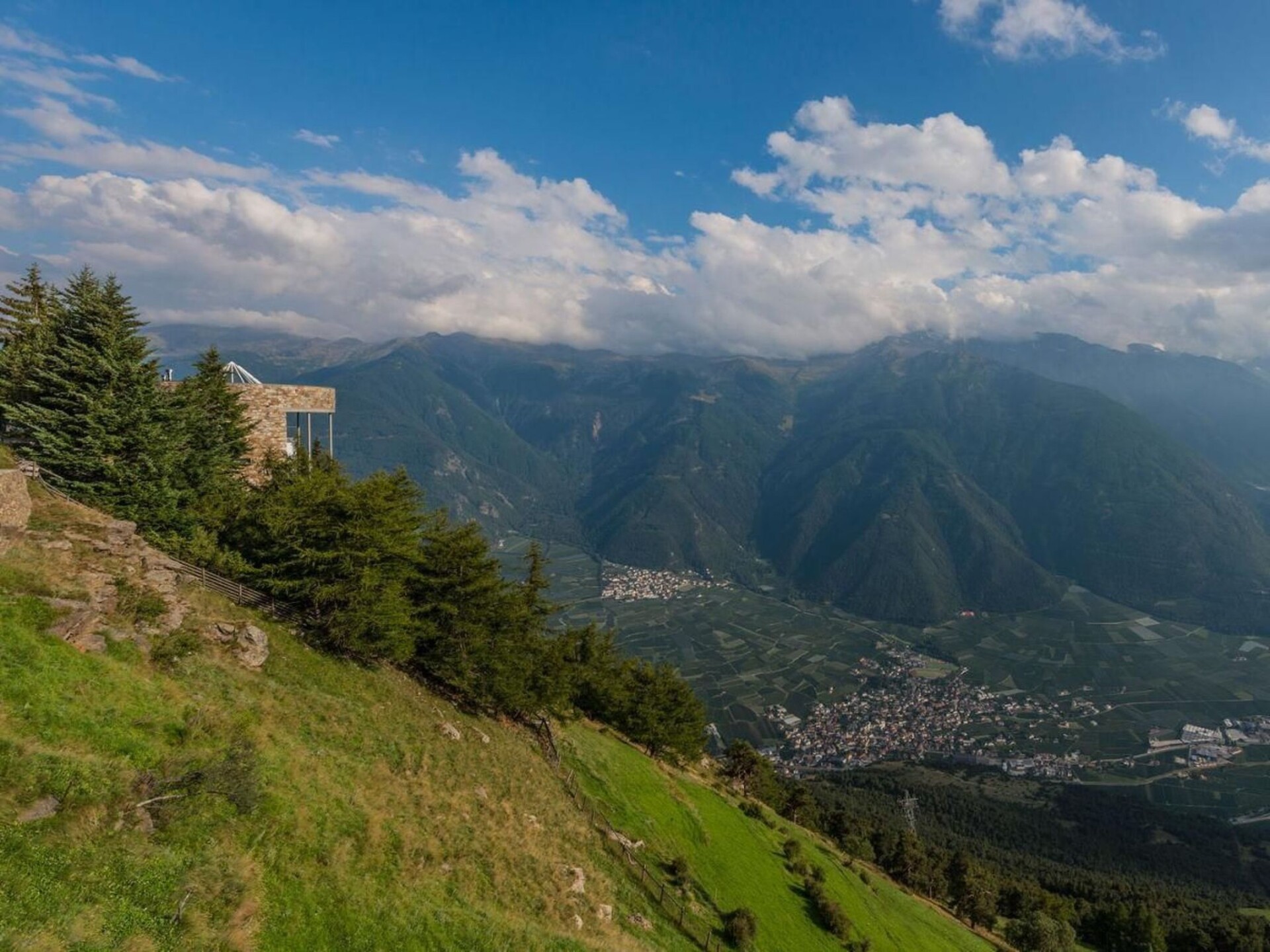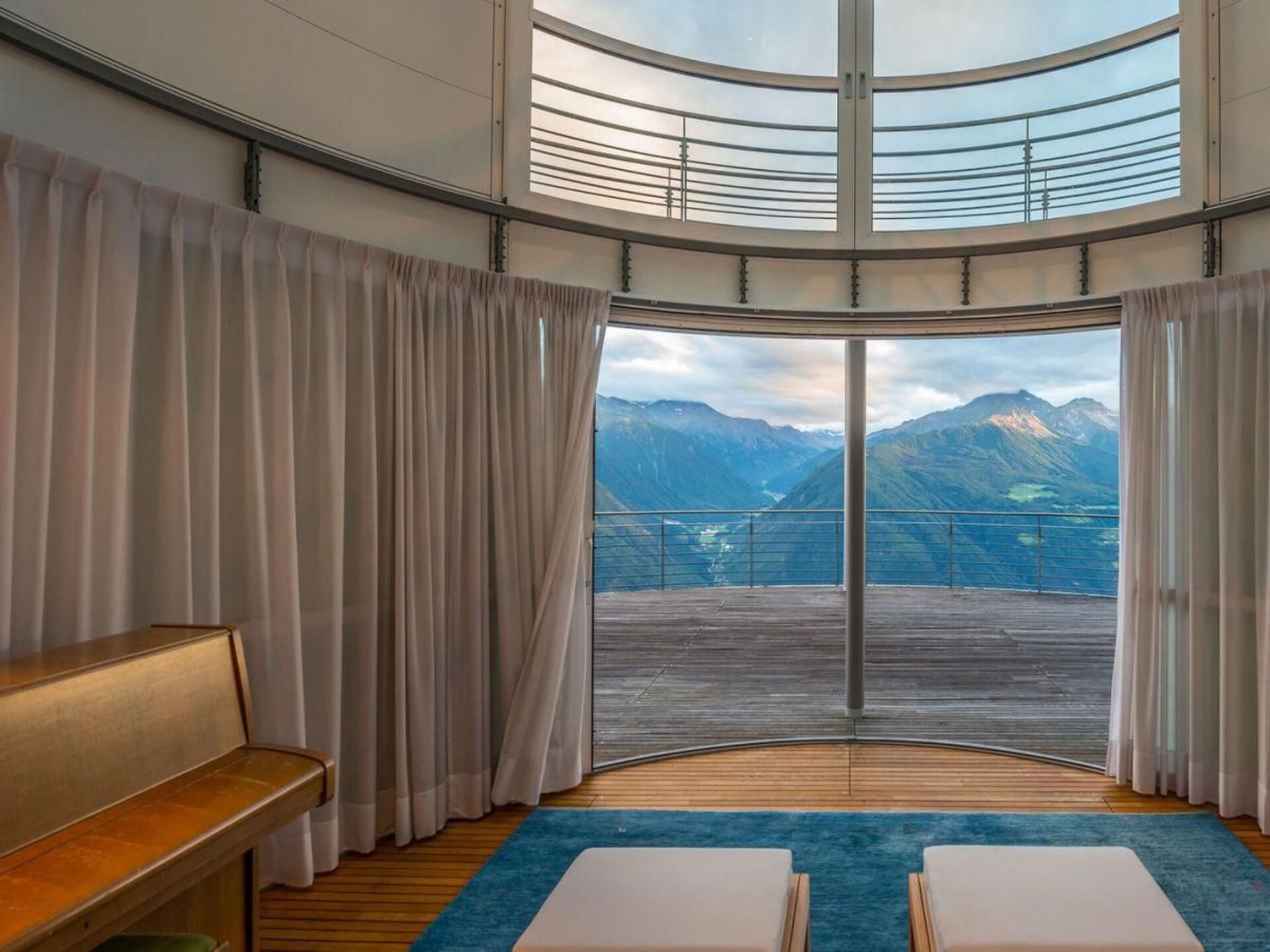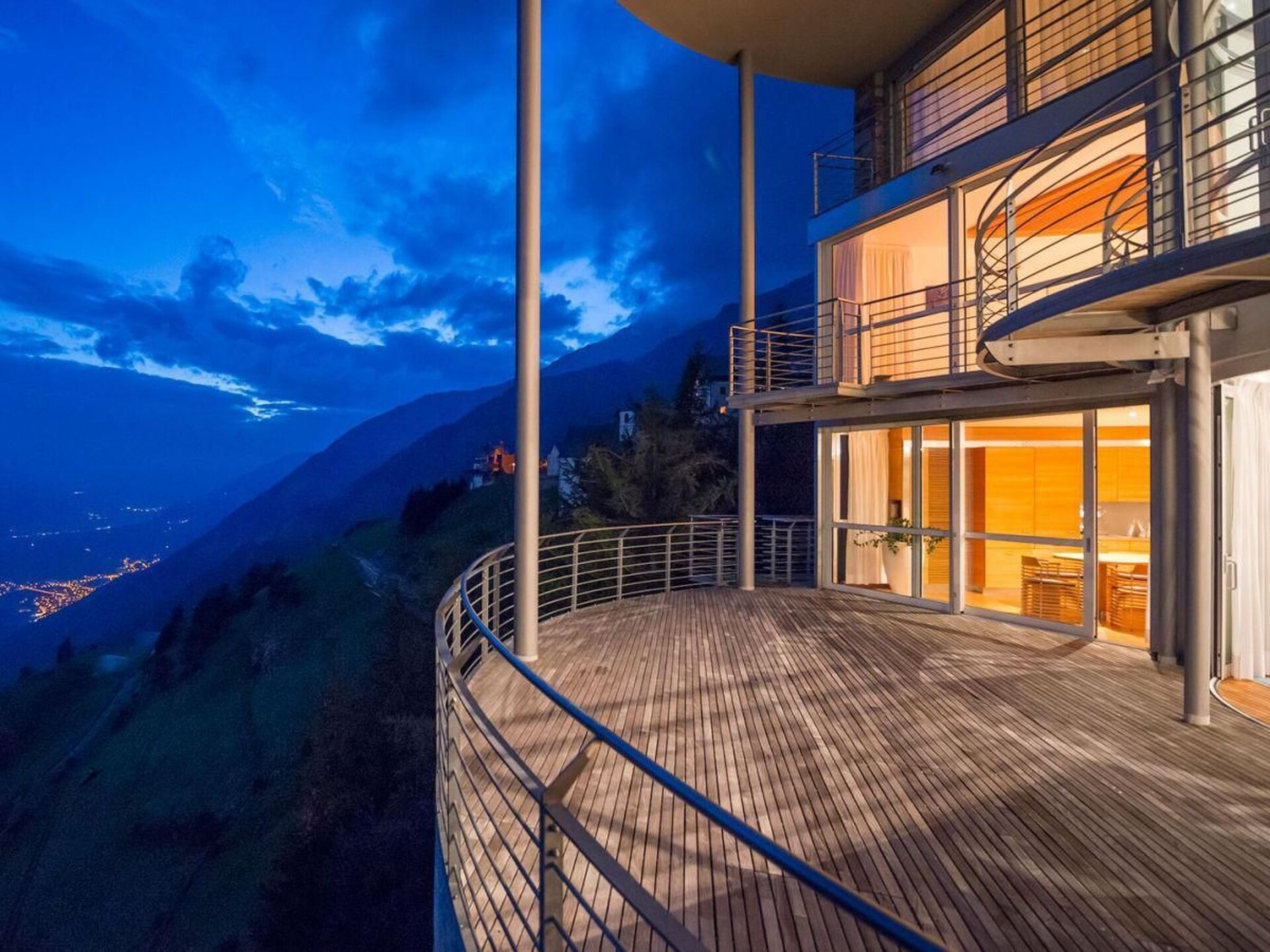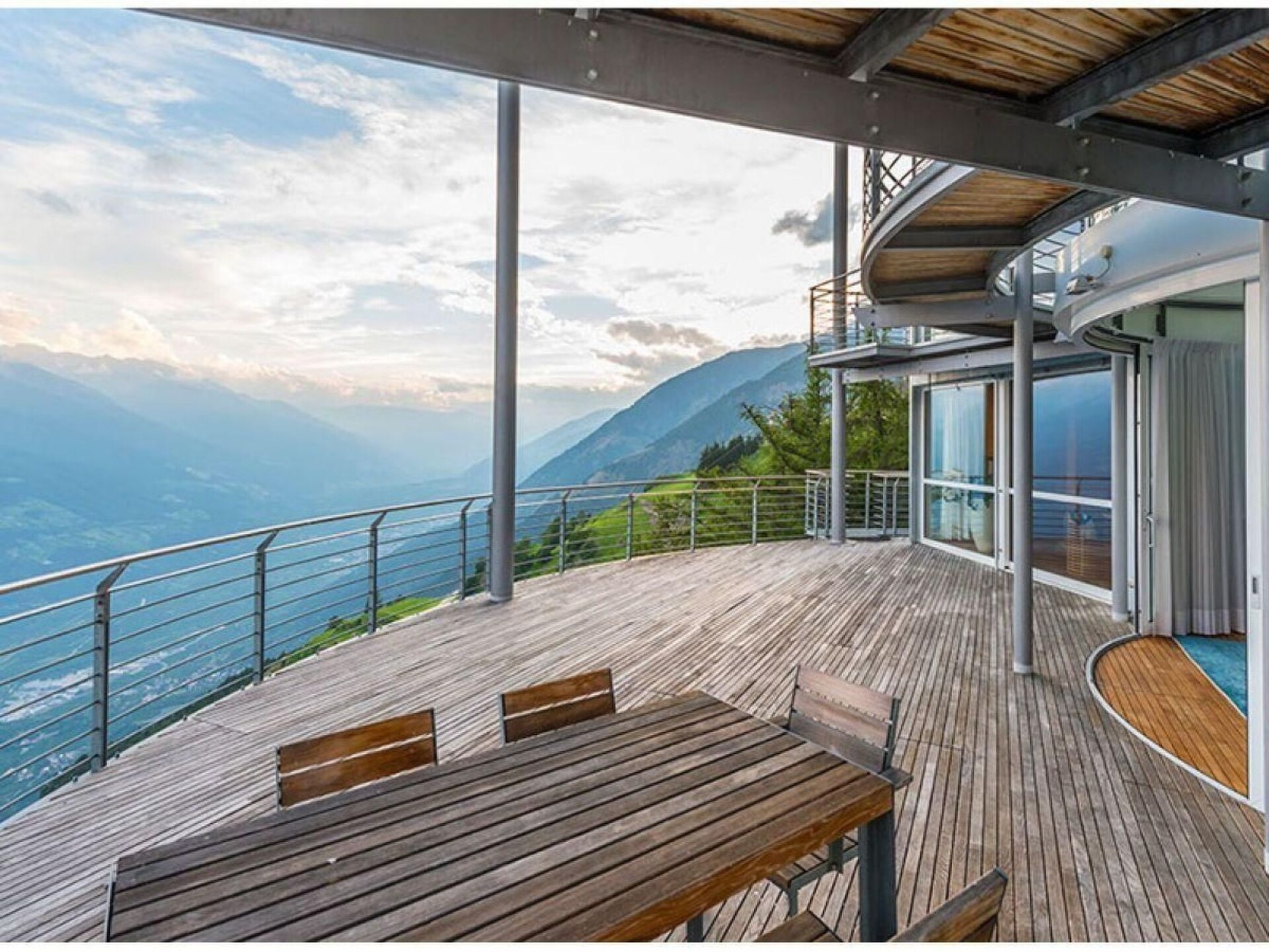The interior of the tower chalet, whose living space of around 500 m² is divided into 4 floors, is accessed via the bold drawbridge. All levels are connected at the rear by a spacious staircase. The guest and children's rooms are located on the entrance level, each with a bathroom/WC and terrace-balcony. Below this is the spacious home office; through the wide glass front at the front, the views extend into the upper Vinschgau Valley as far as the Swiss mountains, in the smaller window Tarsch appears as a "nature picture", a natural still life in the window frame. Living/dining room, visually divided by the large masonry wood-burning stove and the open fireplace on three sides, with satellite TV, video, radio system with CD (ample selection) and stereo, wood-panelled library parlour with masonry stove and lounger, cosy sitting area, TV, binoculars for mounting outdoors, e.g. on the huge terrace that closes the tower circle, with a completely linear table and chairs, naturally made of steel and wood. Two guest and children's bedrooms, each with double beds and an additional pull-out bed; in the toilet rooms with bath or shower, the crystalline white marble stone stands out. A natural swimming pool with a length of 18 m, width of 4 / 6 m and depth of min. 1.30 m/max. 1.80 m, massage grotto and waterfall, like a mysterious mountain lake. Sauna area with Finnish wooden cabin and view of the Val Martello, Roman steam sauna completely encased in white Lasa marble, as are the walls of the shower. The whirlpool with a view of the mountain scenery opposite and the bar can be separated from the swimming area by a "rounded" sliding element (always made of the same chestnut wood); from this area you can access another terrace, secluded and sheltered from the wind, with an open-air shower, enclosed gas barbecue area with chimney flue, dining table and chairs. The sheltered balconies in front of the rooms have an almost meditative character due to the force of the landscape. Short description Miscellaneous : Non-smoking house Short description 1 Number of kitchens : 1 Other rooms : Pool & pool bar, sauna, conservatory, parlour, office Living room 1 Other living room facilities : TV, DVD player, surroundings Sports facilities in the area : Mountaineering, mountain biking, cycling tours Surroundings 1 Excursions : Numerous hiking trails Other sports and leisure facilities : Hiking Garden and outdoor facilities Leisure facilities at the property : Sauna, swimming pool, whirlpool Garden facilities : Garden furniture available, barbecue.