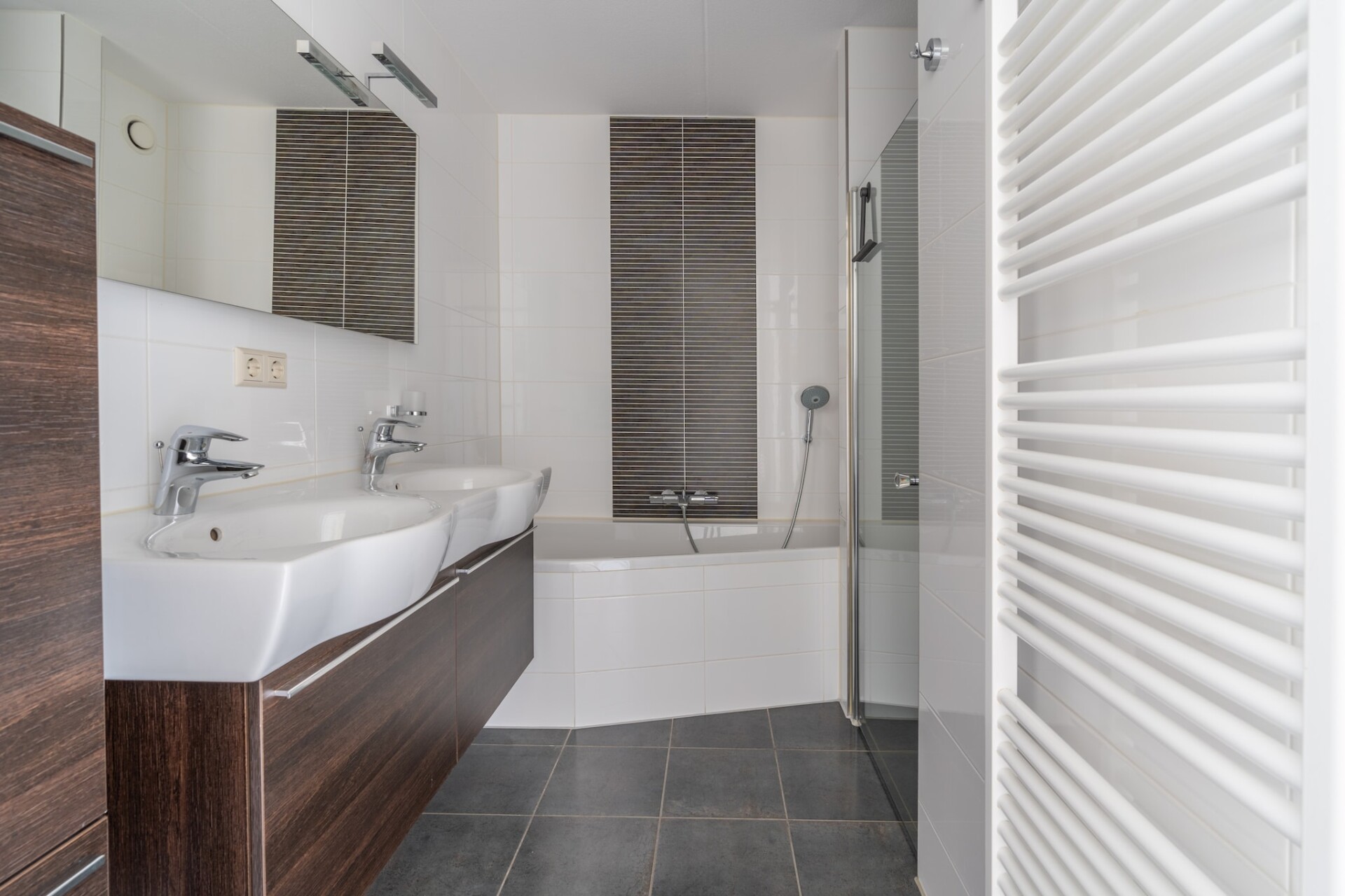 Er zijn 2 slaapkamers in het appartement, de grote slaapkamer is voorzien van een tweepersoons bed met 2 eenpersoons Auping matrassen en een tv. De kleine slaapkamer heeft 2 eenpersoons boxspringbedden en is gelegen in het midden van het appartement en beschikt daardoor niet over een raam met uitzicht naar buiten. De badkamer is voorzien van een inloopdouche met rainshower en een wastafel. In de hal bevindt zich een separaat toilet.