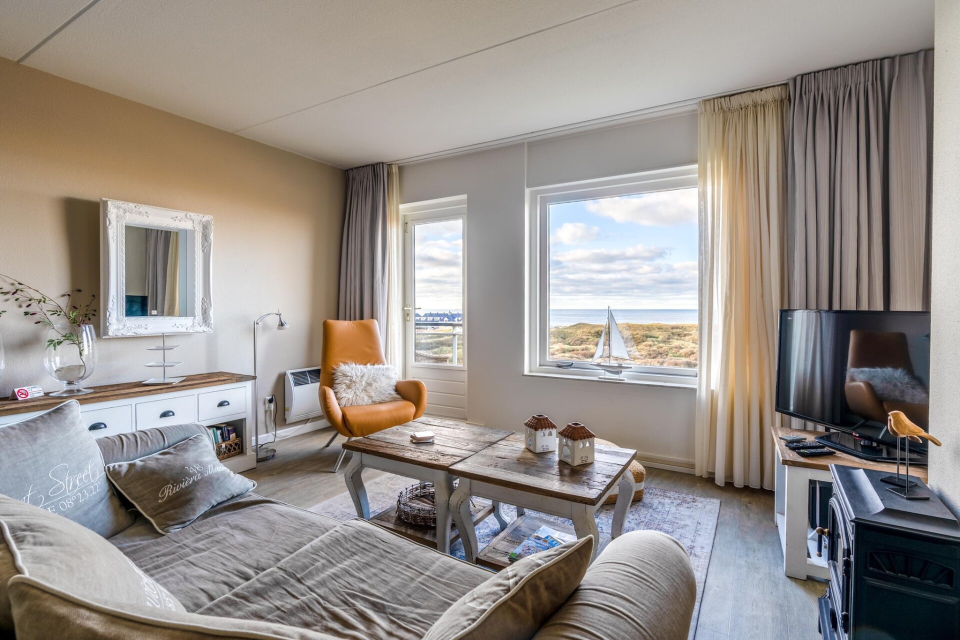 De slaapkamer is voorzien van 2 eenpersoons boxspring bedden en een tv. Vanuit de slaapkamer heeft u tevens ook uitzicht over de Noordzee.