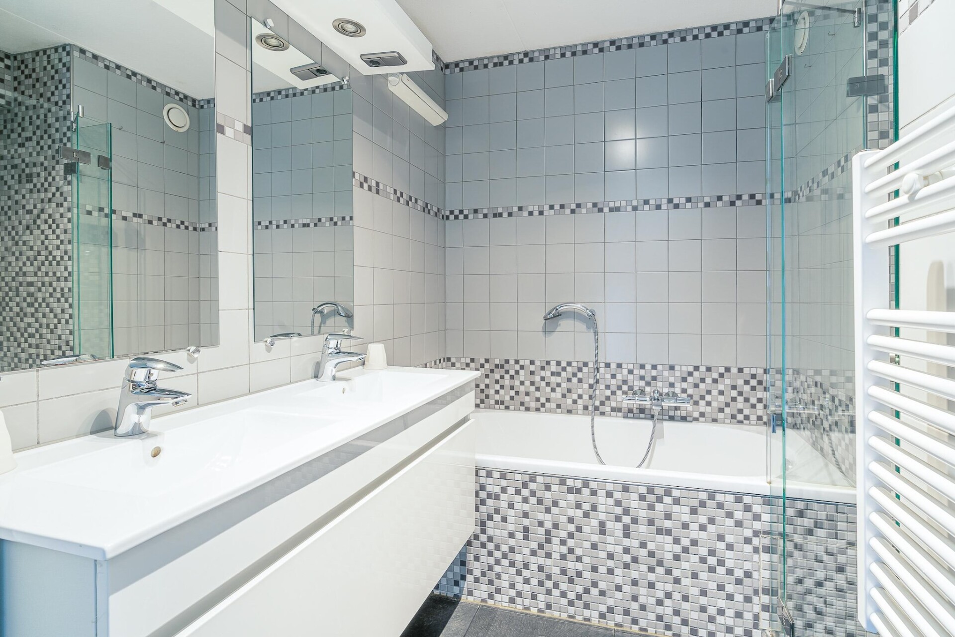 De badkamer is voorzien van een bad, douche en een wastafel. Het toilet is apart gesitueerd.