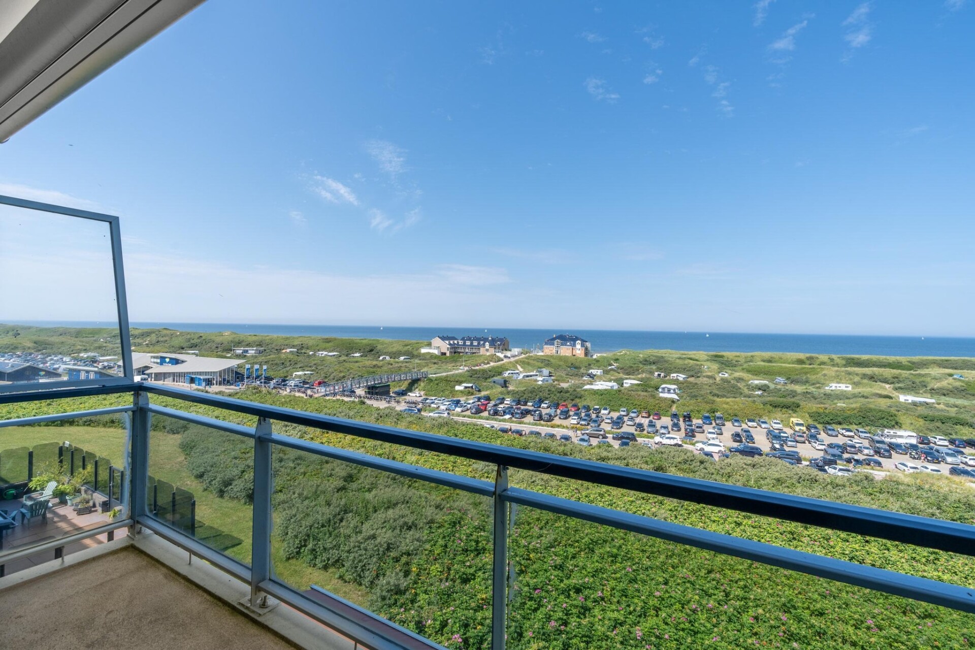 Het grote balkon is voorzien van tuinmeubilair en er is uitzicht op de duinen en de Noordzee.