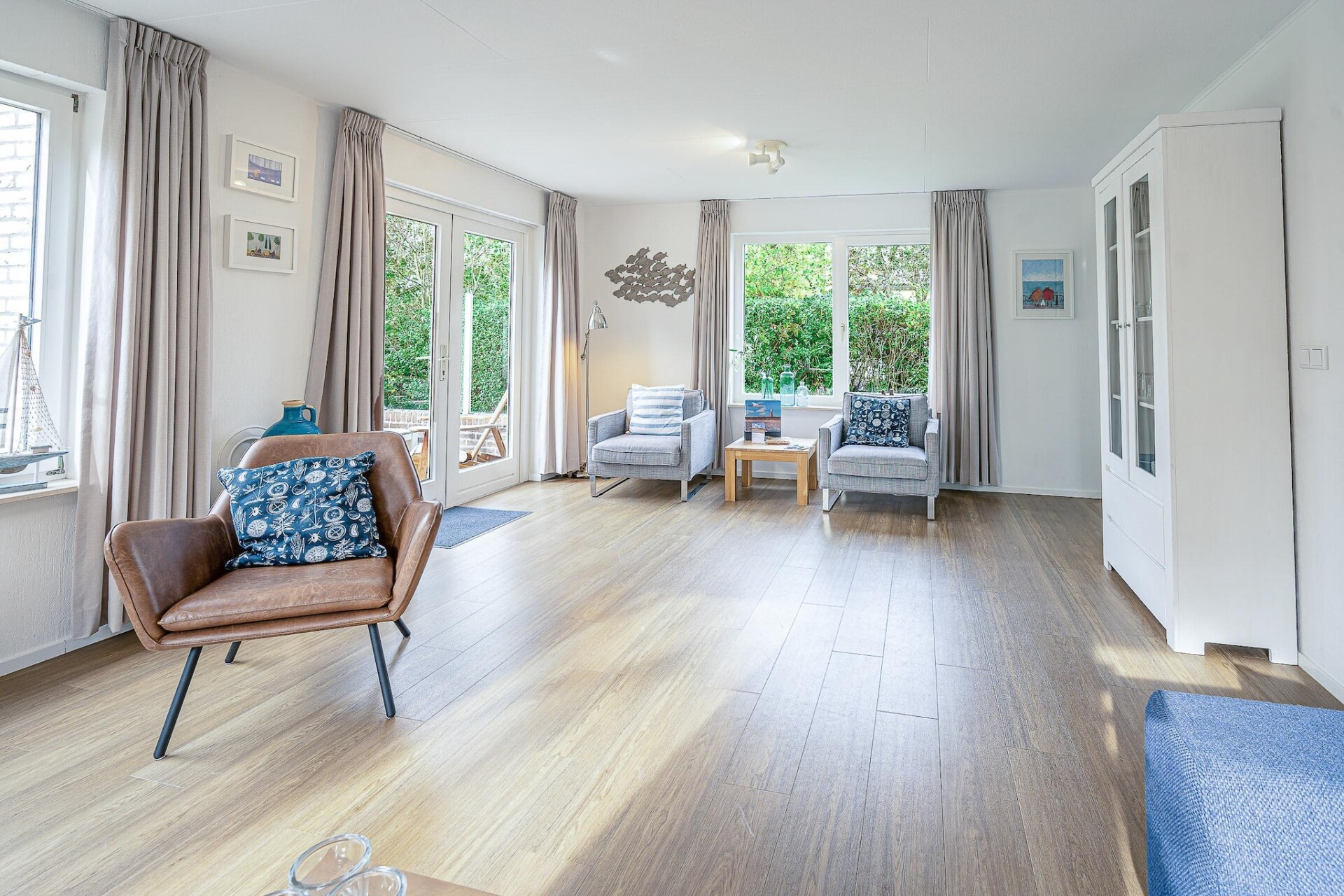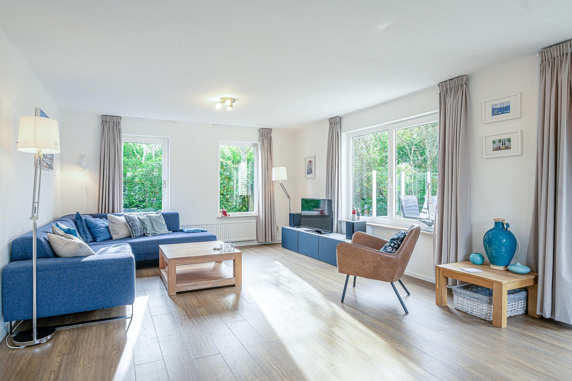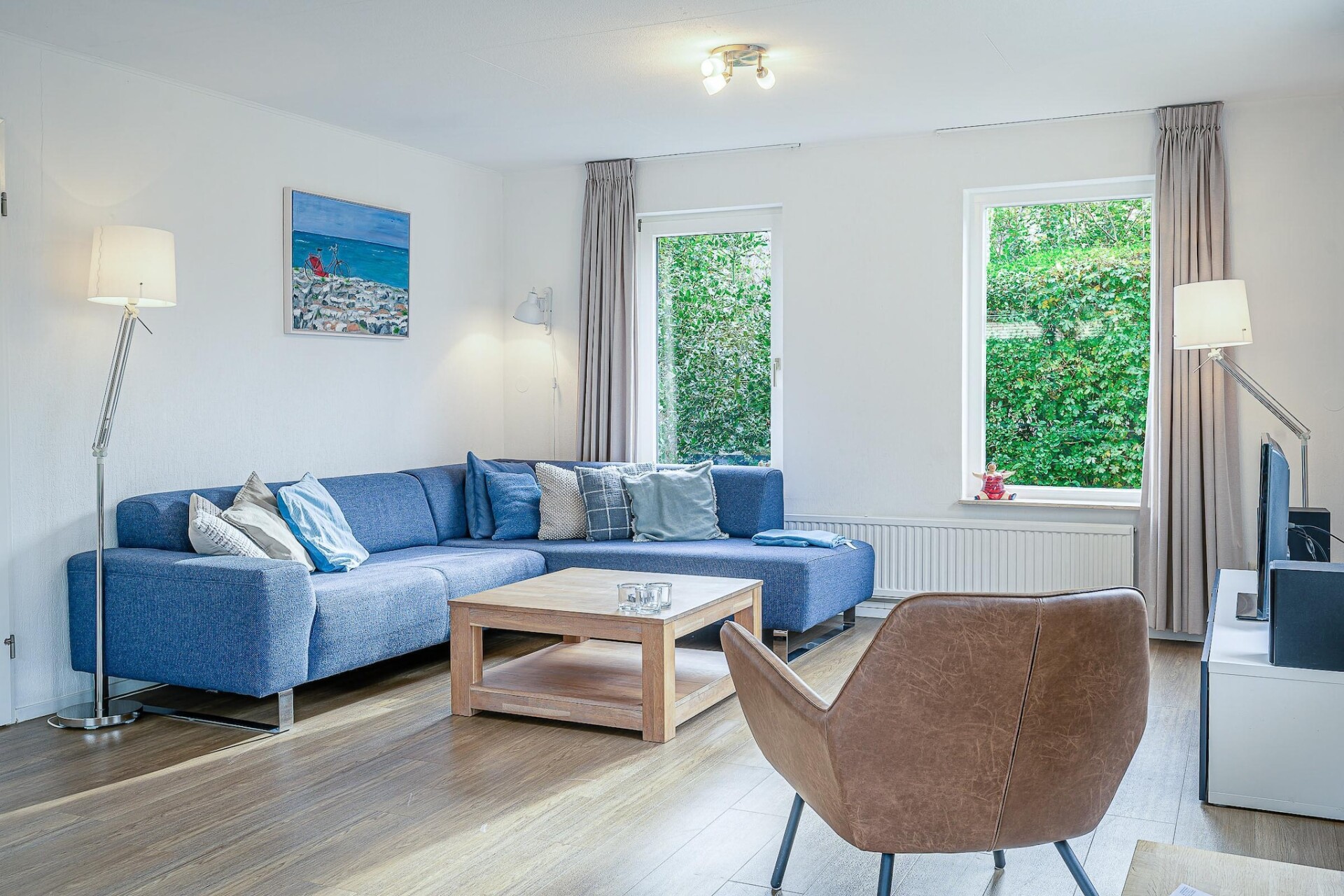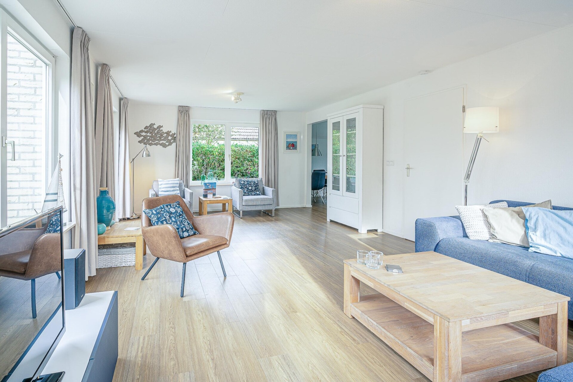 De ruime lichte woonkamer is voorzien van een zithoek, TV, muziekinstallatie en leeshoek. De ruime open keuken is van alle gemakken voorzien. Er zijn in totaal twee slaapkamers aanwezig. Beide bevinden zich op de eerste verdieping en zijn voorzien van een twee eenpersoons boxspringbedden en uitgerust met een TV. De badkamer is voorzien van een douche, whirlpool, dubbele wastafel en een toilet. Op de begane grond bevindt zich tevens een apart toilet.