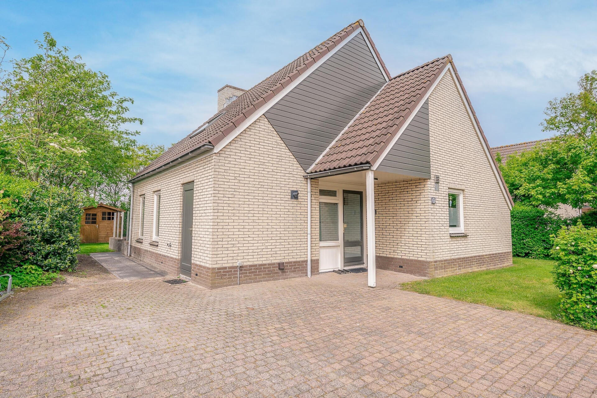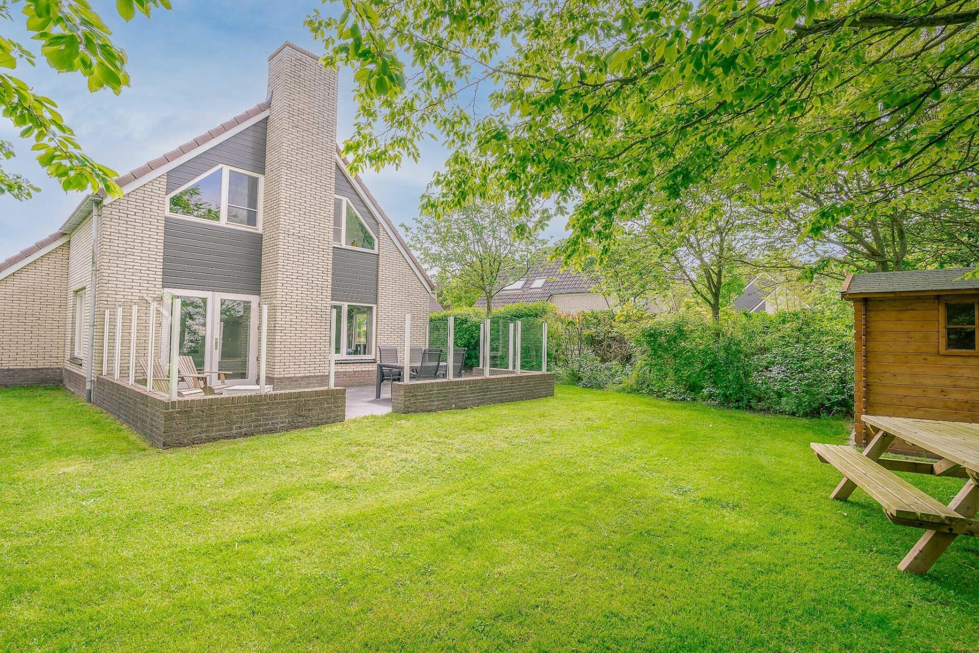 Vanuit de woonkamer kom je via de openslaande deuren op het terras en in de riante tuin, welke op het zuidwesten gelegen is. Het terras is voorzien van tuinmeubilair waaronder een loungeset. Voor kinderen is er een algemene speeltuin met een verschillende speeltoestellen nabij de villa. Er zijn twee privé parkeerplaatsen aanwezig,