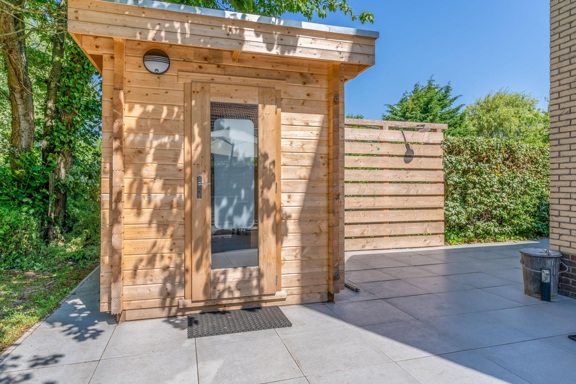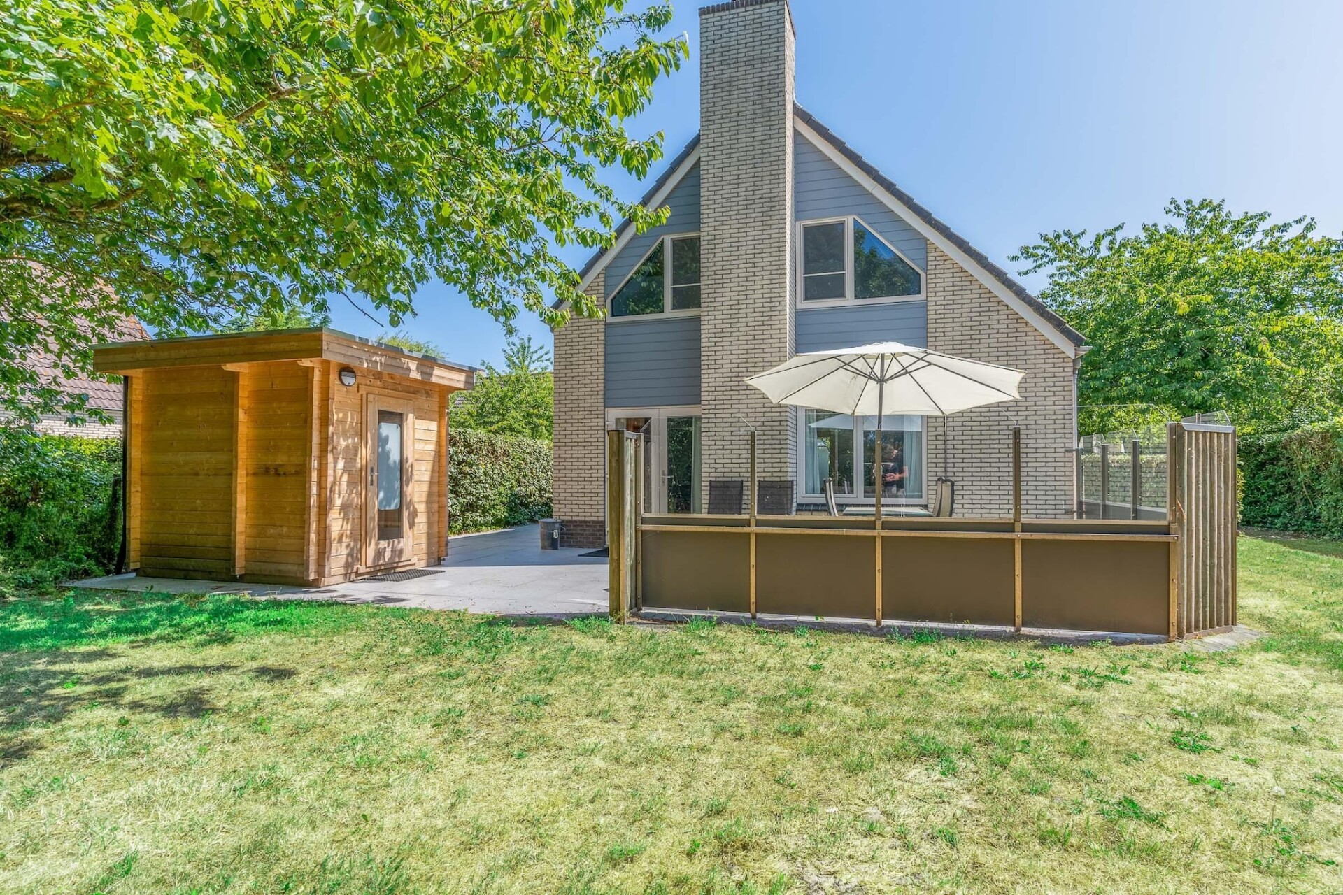 Vanuit de woonkamer kom je via de openslaande deuren op het terras en in de riante tuin, welke op het zuidwesten gelegen is. Het terras is voorzien van tuinmeubilair waaronder een loungeset.Voor kinderen is er een algemene speeltuin met een verschillende speeltoestellen nabij de villa. Er zijn twee privé parkeerplaatsen aanwezig,