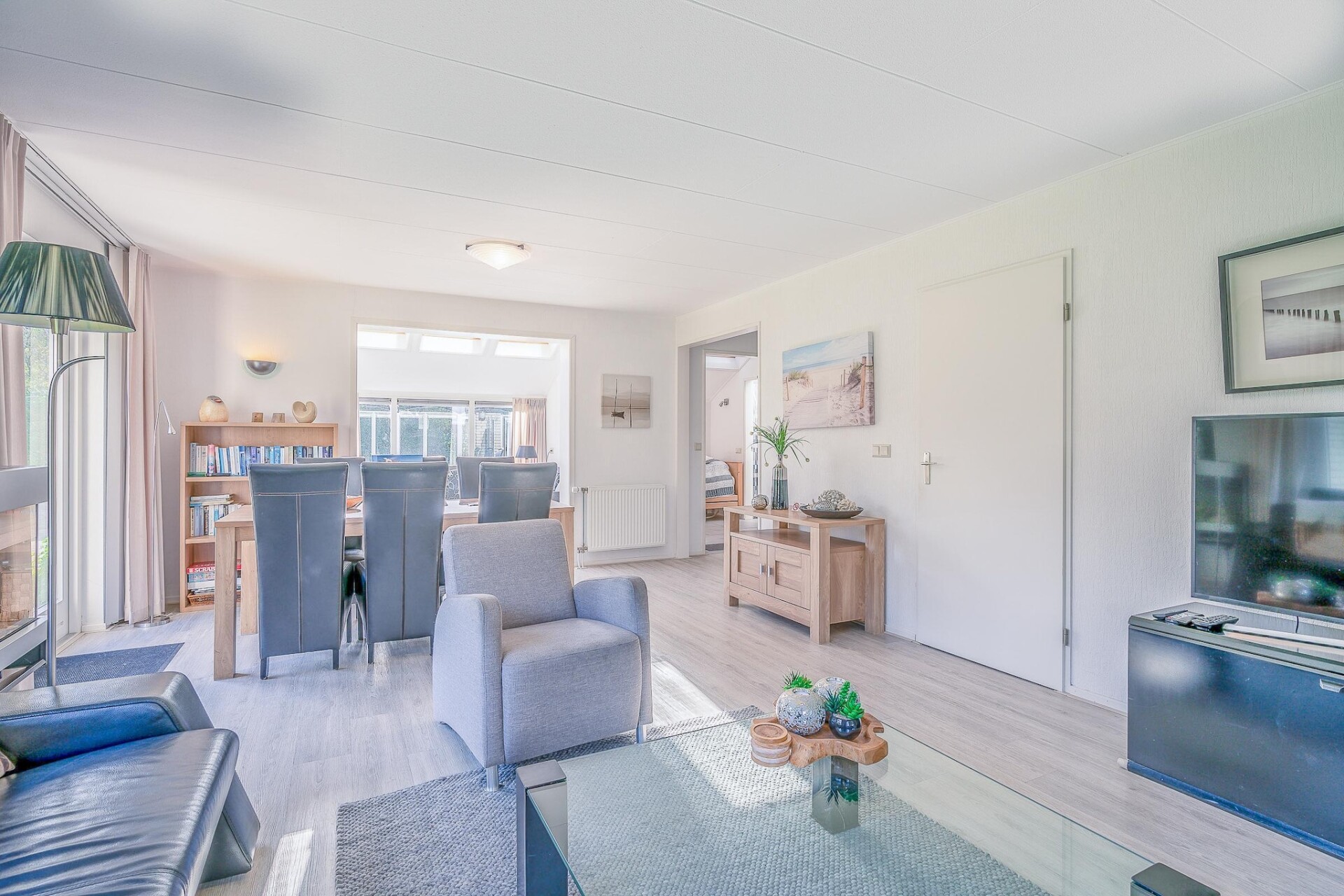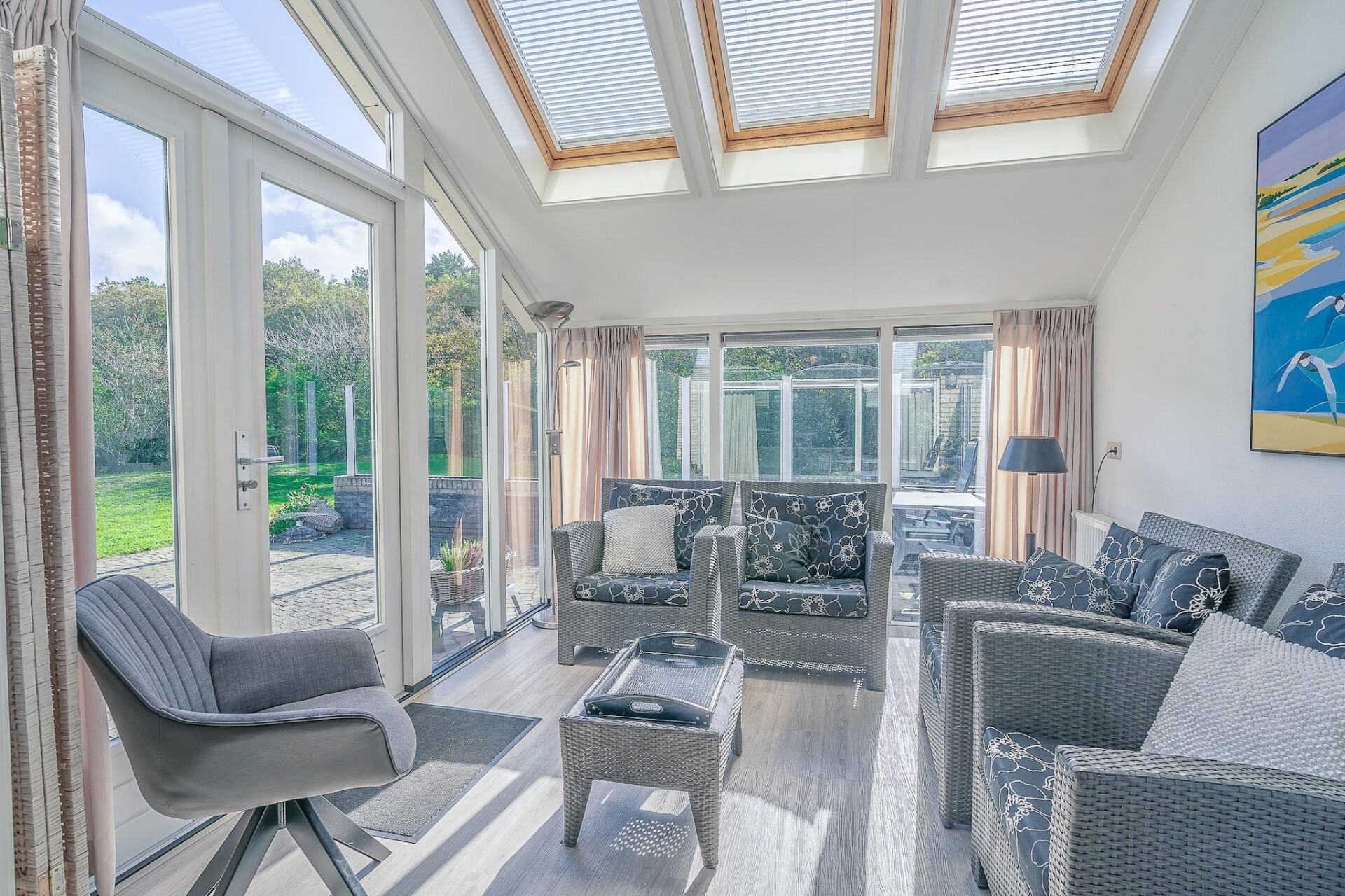 De lichte woonkamer is voorzien van zithoek met tv en een gashaard. De gezellige serre is voorzien van een zithoek en twee openslaande deuren die toegang geven tot de riante tuin. De luxe open keuken is uitgerust met alle moderne inbouwapparatuur.