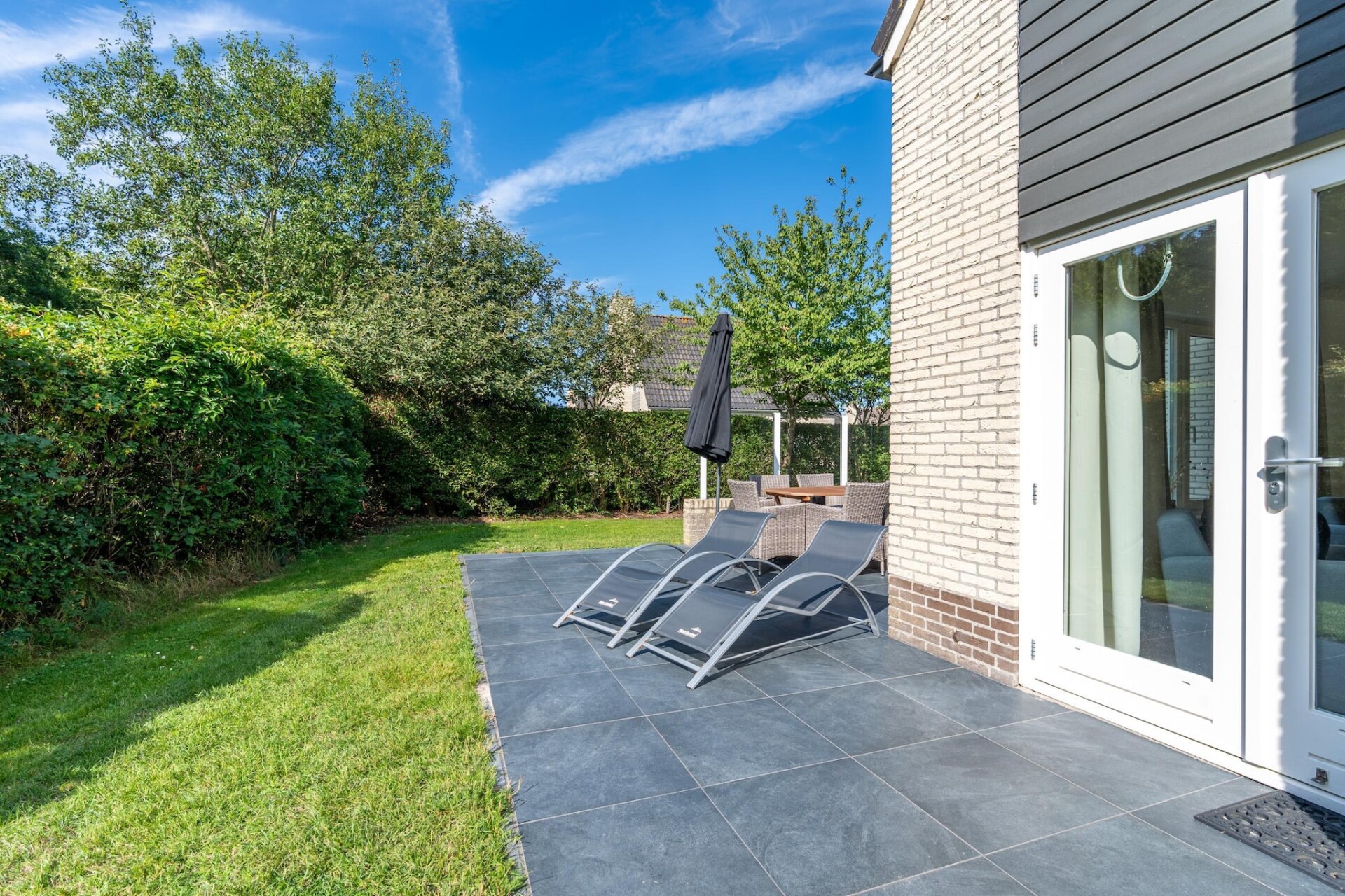 Vanuit de woonkamer kom je via de openslaande deuren op het terras en in de riante tuin, welke op het zuidwesten gelegen is. Het terras is voorzien van tuinmeubilair waaronder een loungeset. Voor kinderen is er een algemene speeltuin met een verschillende speeltoestellen nabij de villa. Er zijn twee privé parkeerplaatsen aanwezig.