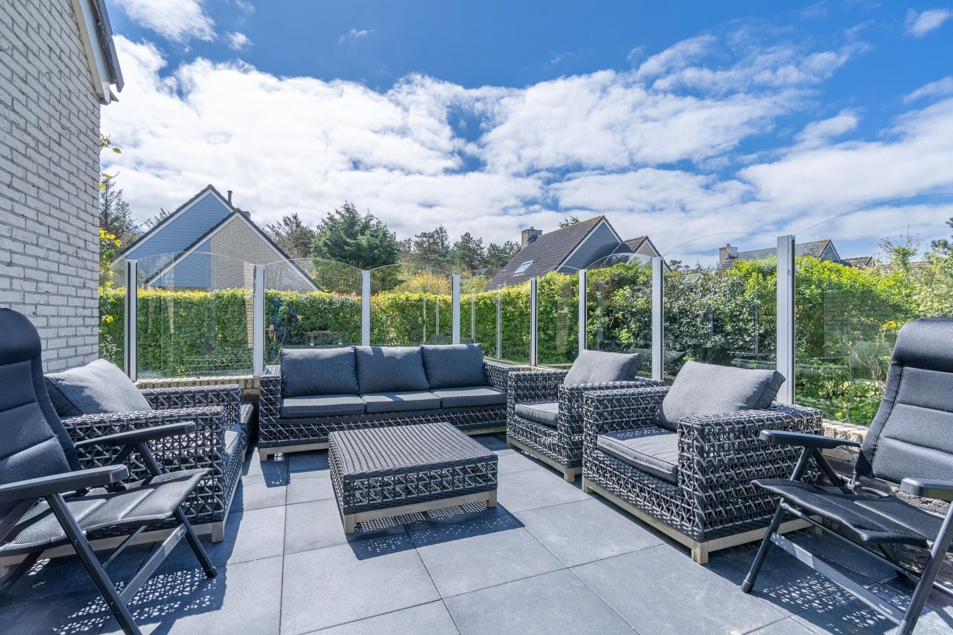 Vanuit de woonkamer kom je via de openslaande deuren op het terras en in de fijne tuin. Het terras is voorzien van tuinmeubilair. Voor kinderen is er een algemene speeltuin met een verschillende speeltoestellen nabij de villa. Er zijn twee privé parkeerplaatsen aanwezig,