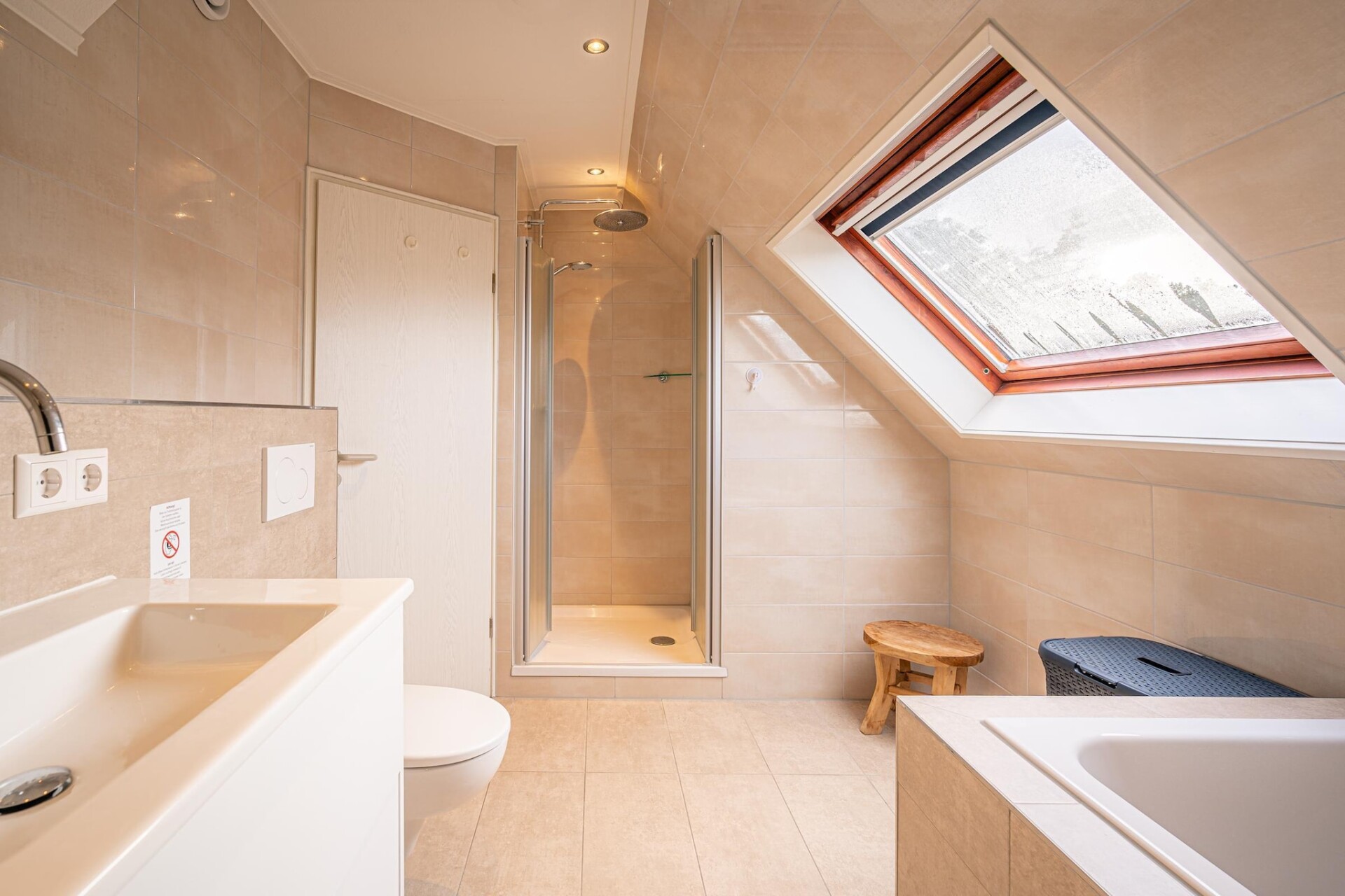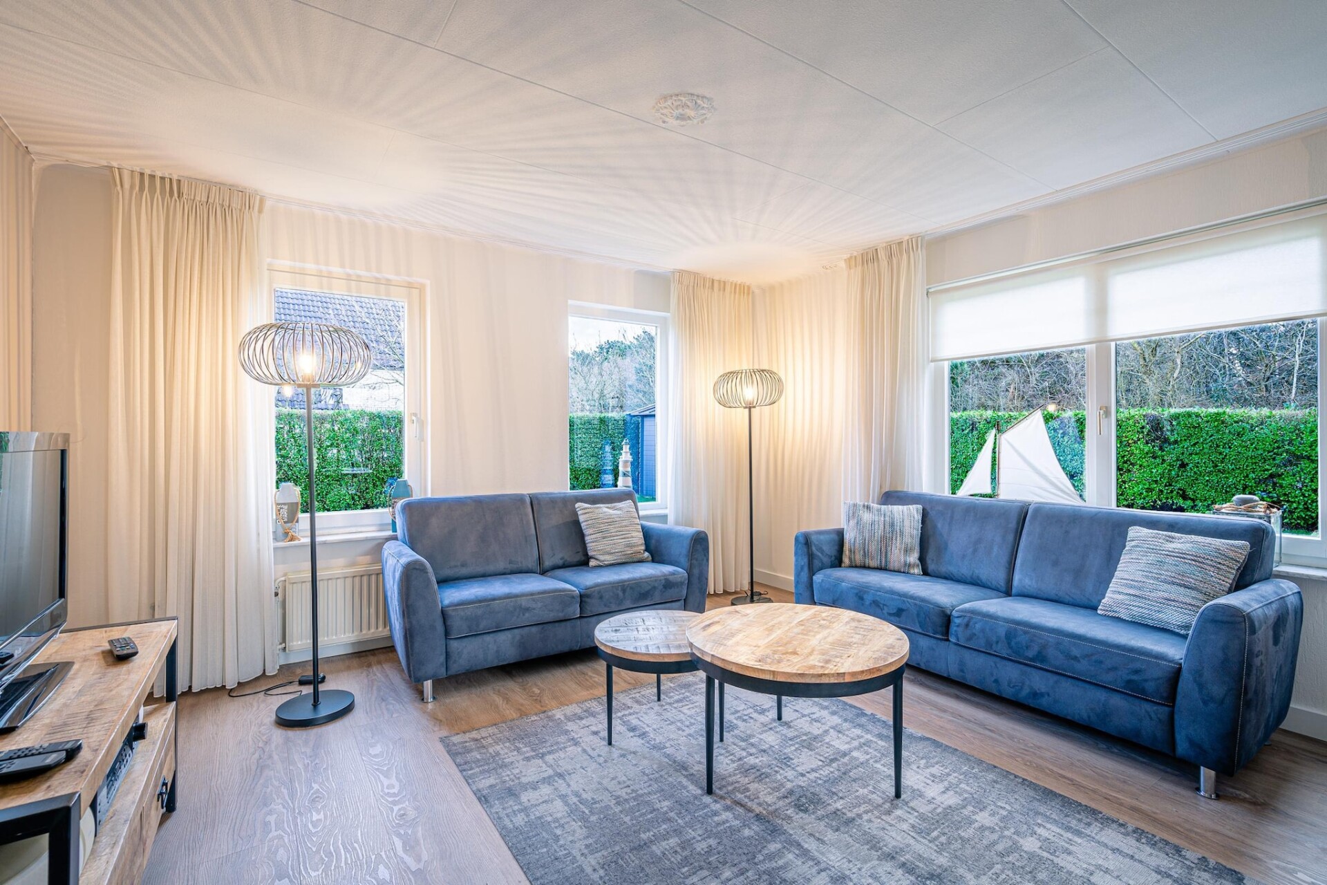 De ruime lichte woonkamer is voorzien van een zithoek, TV, muziekinstallatie en leeshoek. De ruime open keuken is van alle gemakken voorzien. Er zijn in totaal twee slaapkamers aanwezig. Beide bevinden zich op de eerste verdieping en zijn voorzien van een twee eenpersoons boxspringbedden en uitgerust met een TV. De badkamer is voorzien van een douche, whirlpool, dubbele wastafel en een toilet. Op de begane grond bevindt zich tevens een apart toilet.