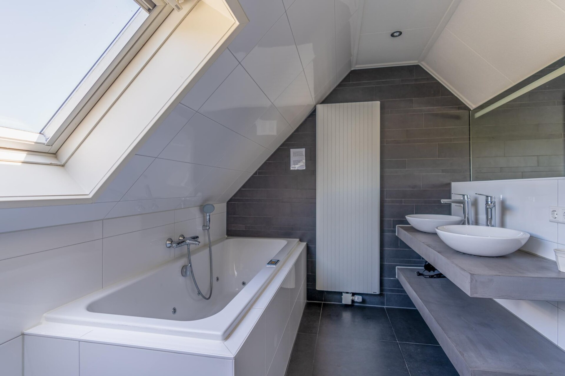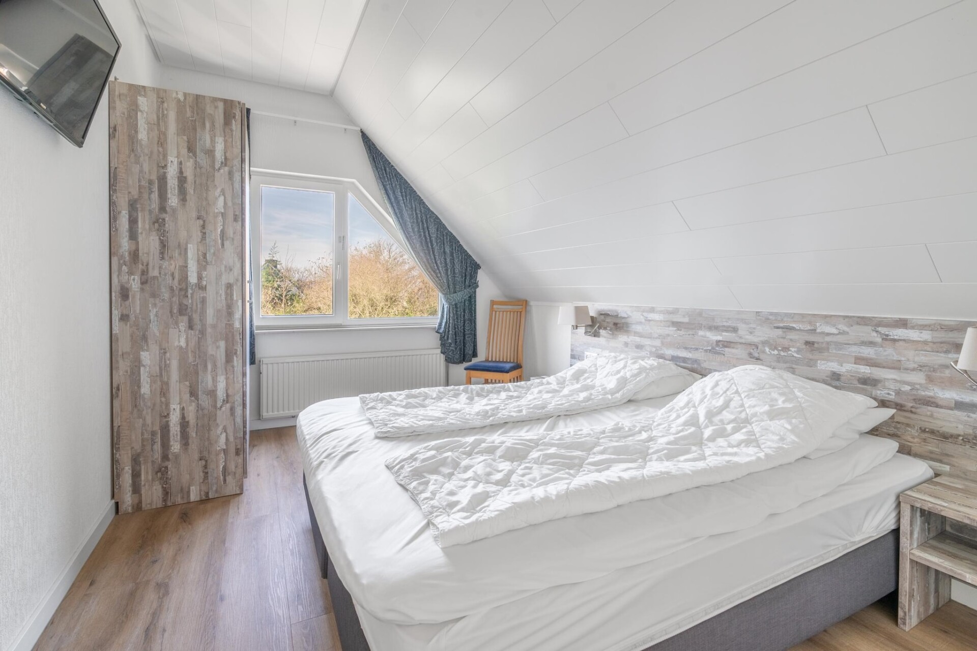 De ruime lichte woonkamer is voorzien van een zithoek, TV, muziekinstallatie en leeshoek. De ruime open keuken is van alle gemakken voorzien. Er zijn in totaal twee slaapkamers aanwezig. Beide bevinden zich op de eerste verdieping. Een is voorzien van een tweepersoons boxspring bed en de ander van 2 1-persoons boxspring bedden. Beide zijn uitgerust met een TV. De badkamer is voorzien van een douche, bad met whirlpool, dubbele wastafel en een toilet. Op de begane grond bevindt zich tevens een apart toilet.