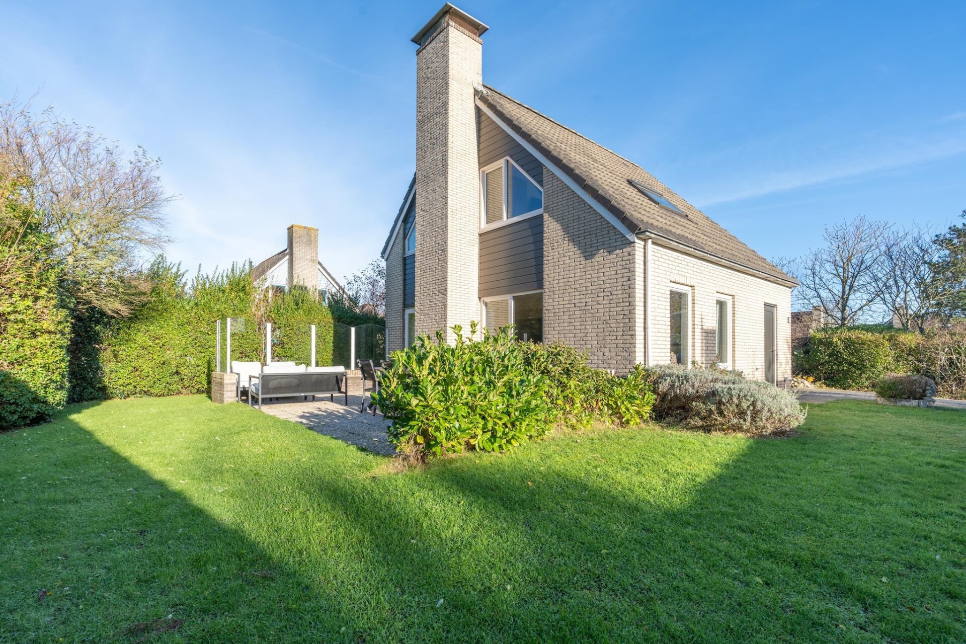 Vanuit de woonkamer kom je via de openslaande deuren op het terras en in de tuin. Het terras is voorzien van tuinmeubilair. Voor kinderen is er een algemene speeltuin met een verschillende speeltoestellen nabij de villa. Er zijn twee privé parkeerplaatsen aanwezig,