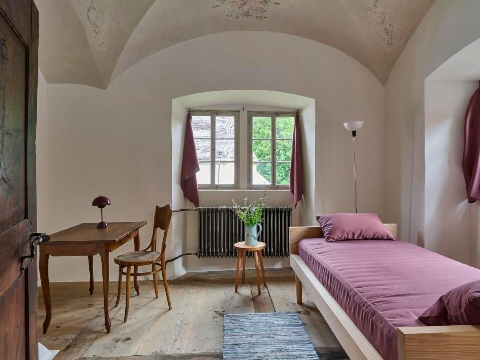 Maximaal 2 huisdieren/honden toegestaan. Vacation in architectural monument combines heritage conservation and tourism. Historically valuable buildings are taken over, gently renovated and rented out as holiday flats. The model provides a double benefit: the monuments are given a revitalised future and the holiday guests experience a stay in an exceptional building. The idea is being realised by the ‘Vacation in architectural monument’ foundation, which was set up by the Swiss Heritage Society in 2005.Public transport: From Brig, take the regional train in the direction of Andermatt to Fiesch. Change there to the Postbus in the direction of Ernen, Dorfplatz to Ernen, Dorfplatz.Car: From Brig, follow route 19 to Niedernen. In Lax turn off to Ernen.Parking: In the public car park at the entrance to the village or at the Volg supermarketNumber of persons 7: The house can accommodate seven guests in four bedrooms (1 double room, a room with two single beds (trapped), a sofa bed in the music room on the ground floor, a single bed in the chapel and 1 double bed (160x200) in the summer room (can only be used in the summer months). The house has three entrances. The main entrance is on the side facing the church, where the garden seating area is also located. One entrance leads directly to the music room, which can also be used as a room, and the third entrance can be reached via the stairs and leads from the village side into the stairwell.Season: All year roundShort holidays: Possible in the low season. Outdoor space: Furnished garden seating area. The garden is not secured towards the church.Heating: The house is heated by two Giltstein stoves. Please refer to the detailed instructions in the house folder and the introduction by the caretaker. There is underfloor heating on the ground floor (music room and bathroom) and radiators in the chapel and kitchen to ensure a basic temperature.Stove / fireplace: Giltstein stove in the ground floor and first floor parlours, firing from the Träche in the kitchen and from the first floor staircase.WLAN: Is available.Open: The house can be rented all year round.Pets: Pets are allowed.Altitude: 1200 m above sea level.Kitchen: Electric cooker with oven. Dishwasher available.Washing machine and tumble dryer: available.Extras: The floors are made of wood and stone, which is why we recommend good slippers. As not all rooms in historic houses can be heated evenly, we recommend that you bring enough warm clothing. When the stoves are heated, please close the doors to the rooms, otherwise the heat will dissipate in the cold stairwell. The firing up of both stoves is described in detail on site in the house folder. The stove on the upper floor has a wooden vestibule - this must not come into contact with the fire in the firebox under any circumstances. Please read the instructions in the house folder carefully.Important additions and dangers:The Kaplanei Ernen is a historic building, a listed building. Although it is equipped with modern technology, we would like to point out that certain functional details such as window and door openers, stair handrails and step heights do not comply with current standards and may be a potential source of danger. Use at your own risk. The tenant is aware of these circumstances. The Vacation in architectural monument foundation and e-domizil decline any liability.Further information on the website of the Vacation in architectural monument foundation . 3134717
