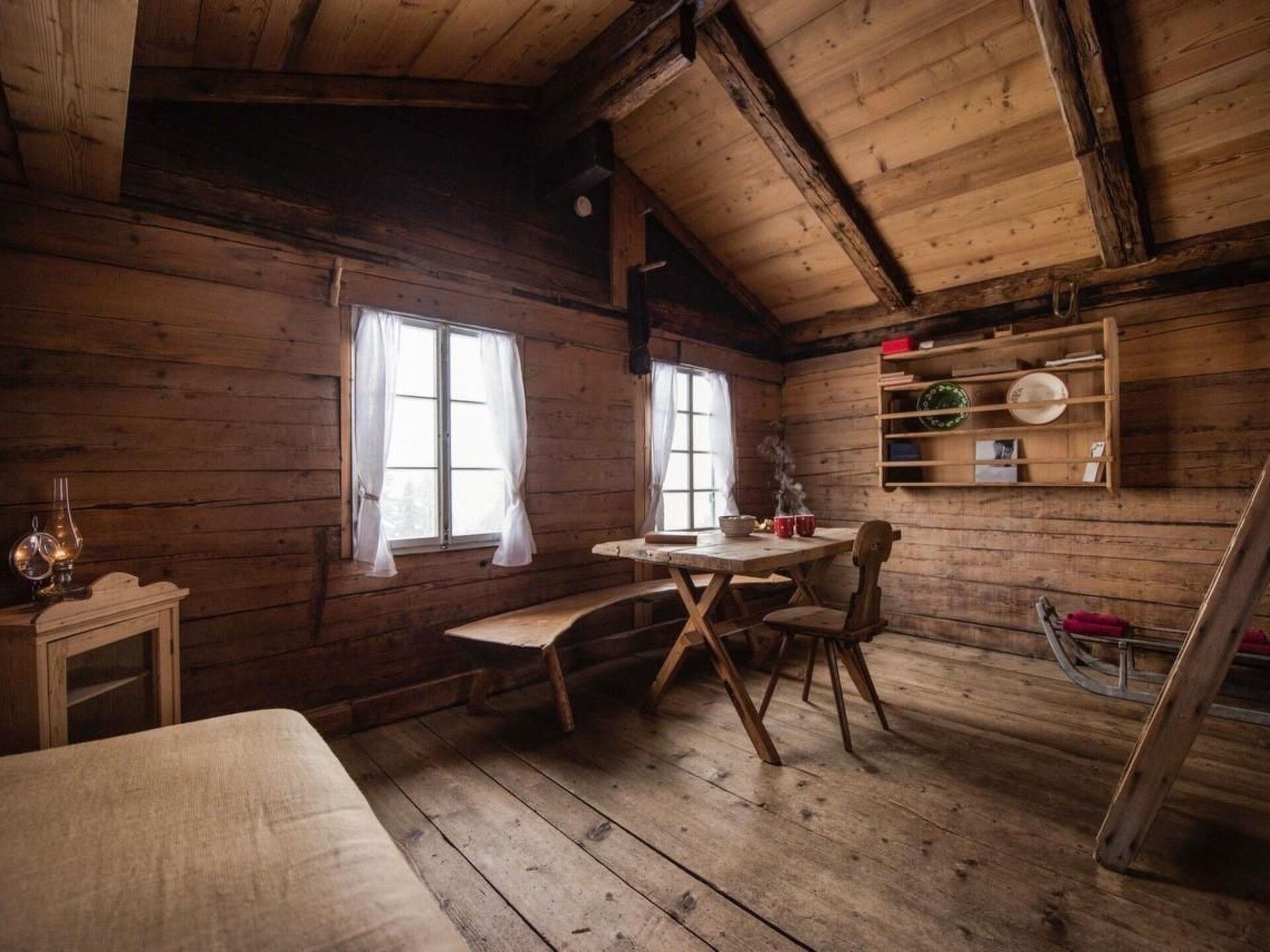 Small alpine hut on a secluded large forest meadow.Cherry tree hut, tranquil mountain hut for 2 / Easter to October The archaic alpine hut has been carefully restored using used wood and traditional building materials to create a place of relaxation. The authentic furnishings have been consistently retained, as if Heidi & Geissenpeter still lived here. The simplicity puts the essentials centre stage: the imposing mountain backdrop of the Swiss Alps. Life in the cherry tree hut is tranquil, the mills grind more slowly here: Until the coffee is brewed, you have time to occupy yourself with making a fire, listening to the natural soundscape around the house, marvelling at the sunset or refreshing yourself by the leisurely rippling fountain trough. The hut is brimming with cultural history: the parlour table was the front door decades ago, and you will also find a few books that tell you about past ways of life and wisdom. The upholstered sledge is also a retired piece of equipment. It was used to transport the bulky cheese wheels or to cultivate the surrounding slopes.Other sports and leisure activities: The exceptional hut is situated on a large mountain pasture, quite isolated from the villages. There are no hiking trails in the area and hardly anyone passes by. Above all, you will find peace and relaxation here. Short hikes are of course possible, but if you want to tackle a longer tour, the extensive network of hiking trails in the Jungfrau region is well connected from Zweilütschinen.Excursion possibilities: Despite its remoteness, the infrastructure of the world-famous Jungfrau region is easily accessible and the mountain guide recommends a hike to the Lobhorn hut and a dip in the Sulssee, one of the most attractive mountain lakes in Switzerland... Round trip: 4-5h / Mountain trail: easy / Mountain railway: Isenfluh-SulwaldOther living room facilities (living room1): The authentic hut offers a very pleasant, quiet and open-plan living area. Cooking and living in the same room, with a cosy gallery above for sleeping.Other bedroom furnishings (bedroom 1): As in many cabins, the cosy bed can be reached via a small ladder.From this gallery you have a cosy feeling of security and leave everyday life far behind you.Sports options in the surrounding area: mountaineering, climbing, mountain biking, paragliding, cycling tours, rafting