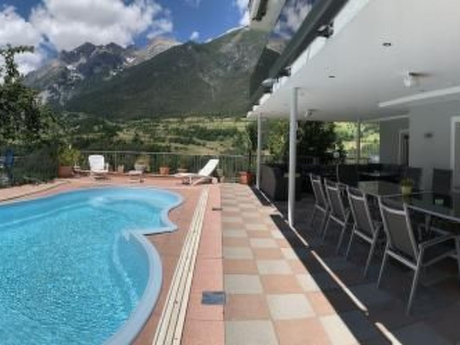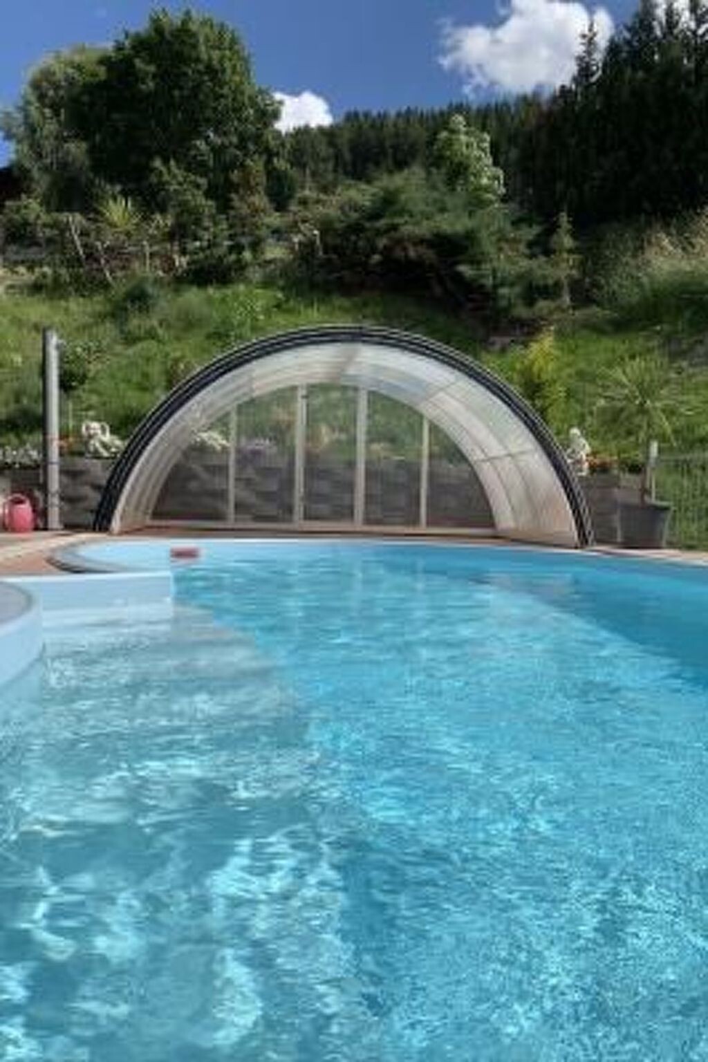 Op het bovenste terras ligt het overdekte zomerzwembad (geopend van mei tot september) voor exclusief gebruik. Dit bereikt in de zomer temperaturen tot 35 °C dankzij de zonnedakverwarming. In de overgangsperiode wordt het zwembad verwarmd tot ongeveer 25 °C met behulp van een warmtewisselaar. Als de zon schijnt, kan de watertemperatuur nog verder worden verhoogd door zonnepanelen. Hierdoor kunnen de verhuurders het zwemseizoen voor je verlengen. De aanwezige houtskoolbarbecue nodigt uit tot een gezellige barbecueavond. Er is ook een speeltuin en een andere zithoek in de bovenste buitenruimte. In de lagere buitenruimte is er een gedeeltelijk overdekt panoramisch terras met tafeltennis, tafelvoetbal en openluchtschaak. De buitenruimte biedt een fantastisch bergpanorama, dat zowel in zomers groen als in winters wit een indrukwekkend gezicht is. Achter het huis zijn in totaal vier parkeerplaatsen beschikbaar. Optioneel kunnen twee auto's, een grote en een kleine, geparkeerd worden op de parkeerplaats bij het huis aan de hoofdweg.