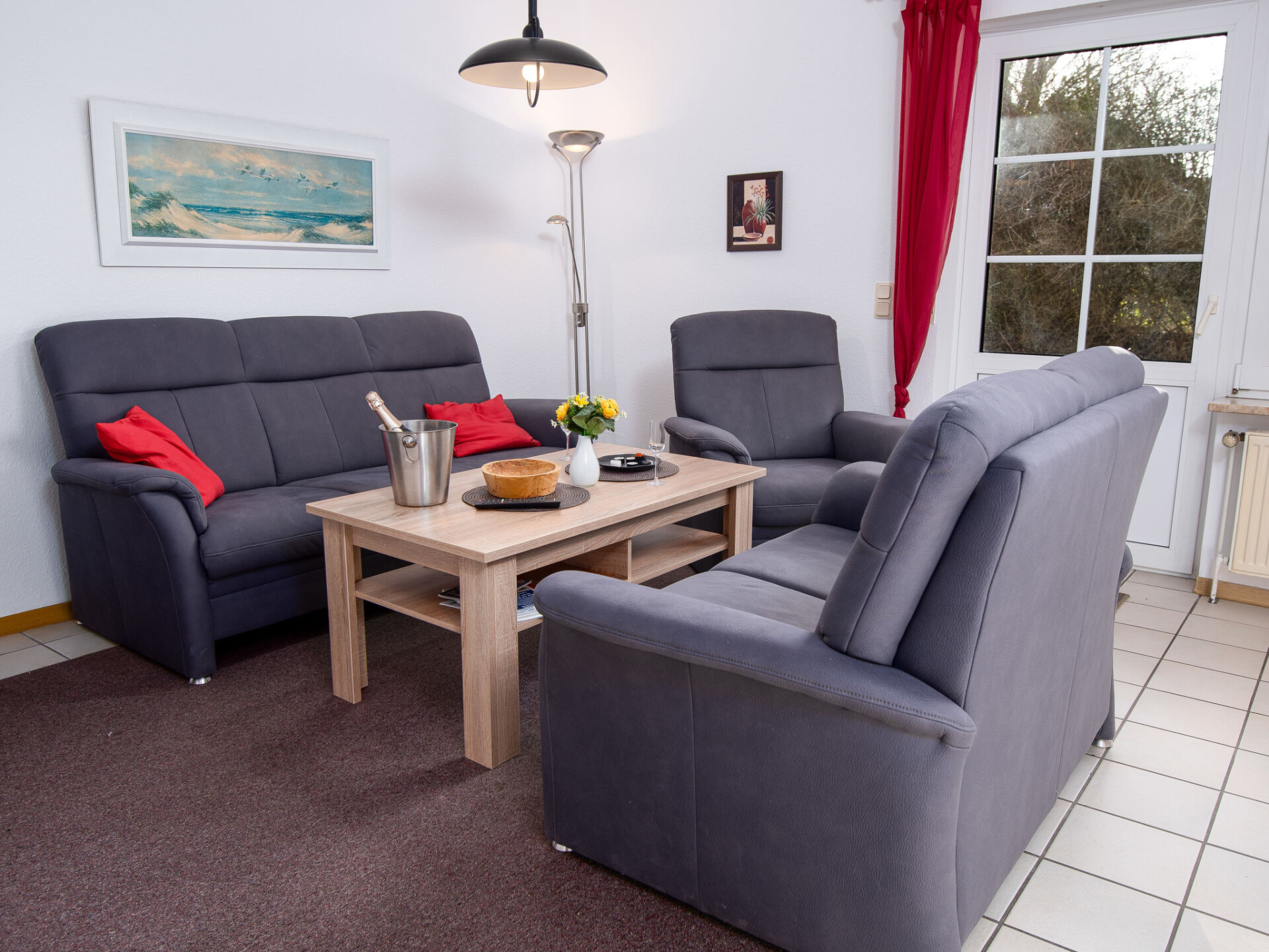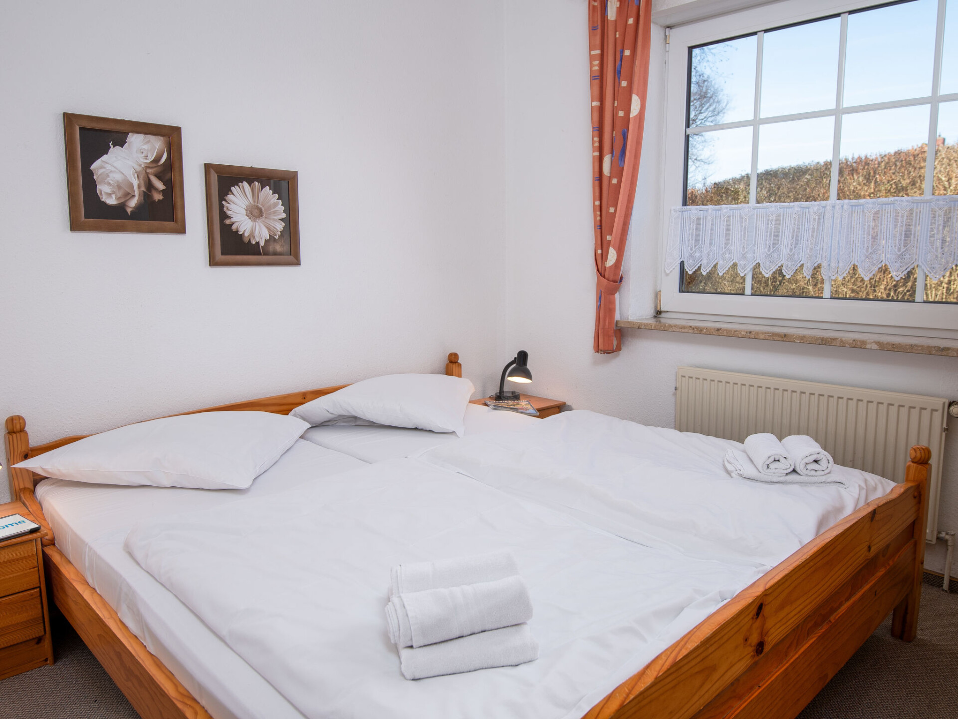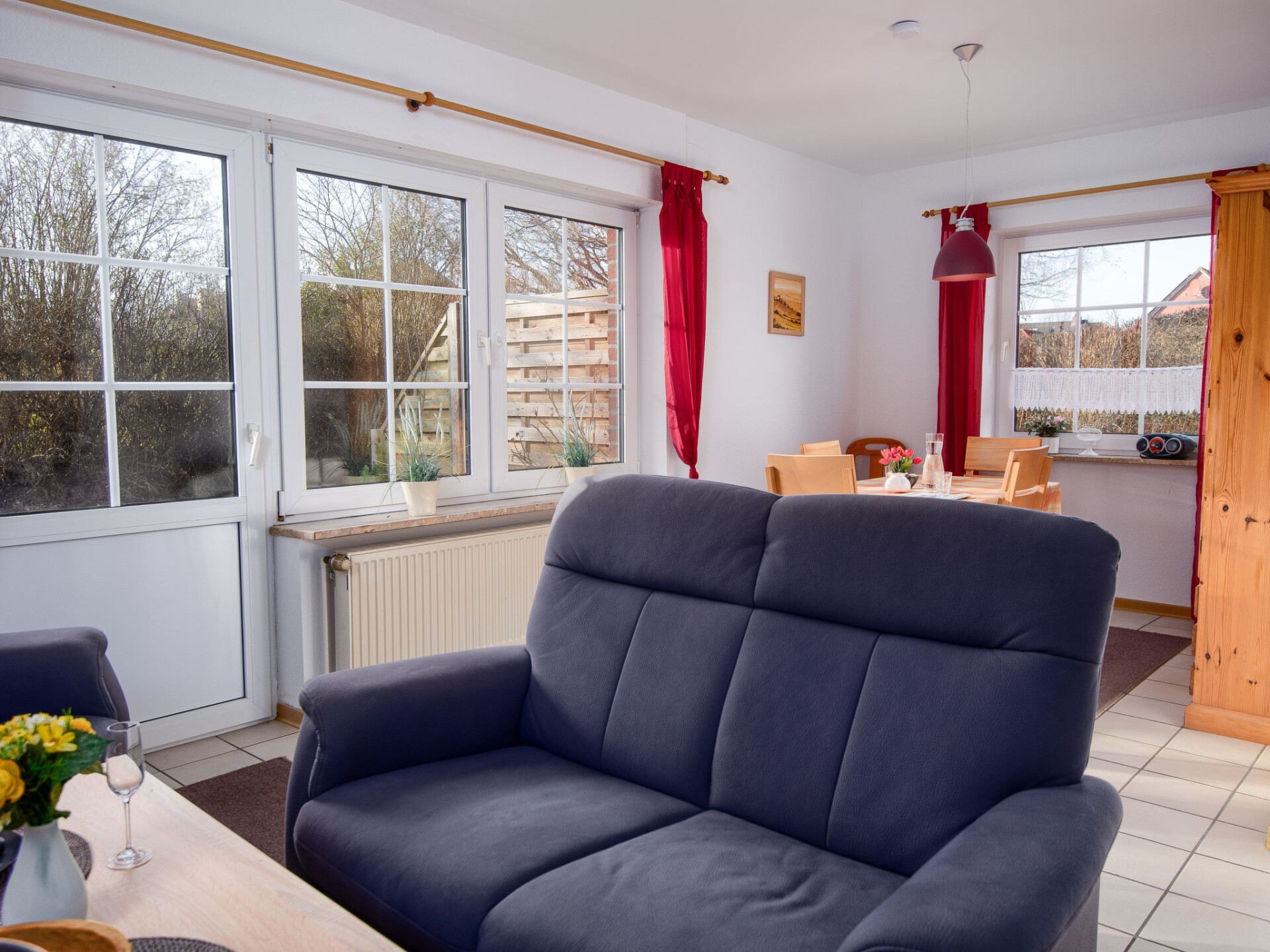 "Küstennebel", appartement 3-kamers 56 m2, op de begane grond. Woon-/eetkamer 23 m2 met Sat-TV (Flatscreen TV), CD-speler. 2 kamers 8 m2, elke kamer heeft 1 2-pers bed (2 x 90 cm, lengte 200 cm). Keuken (4-pits kookplaat, broodrooster, waterkoker, magnetron, elektrische koffiemachine) met doorgeefluik. Douche/WC. Terras 12 m2. Terrasmeubelen. Ter beschikking: kinderstoel (extra). Internet (Internet (WiFi), gratis). Niet rokers woning. Rookmelders.