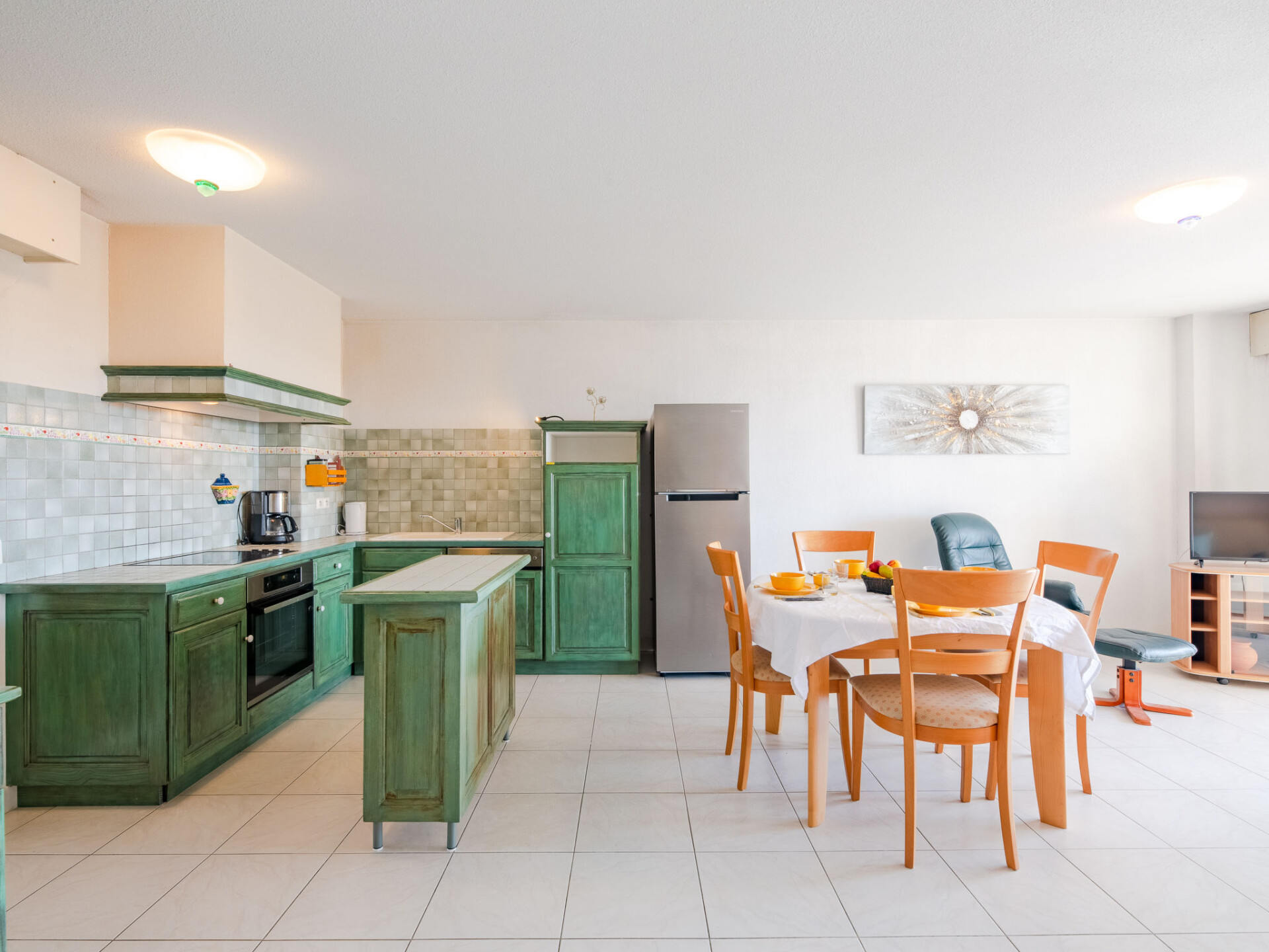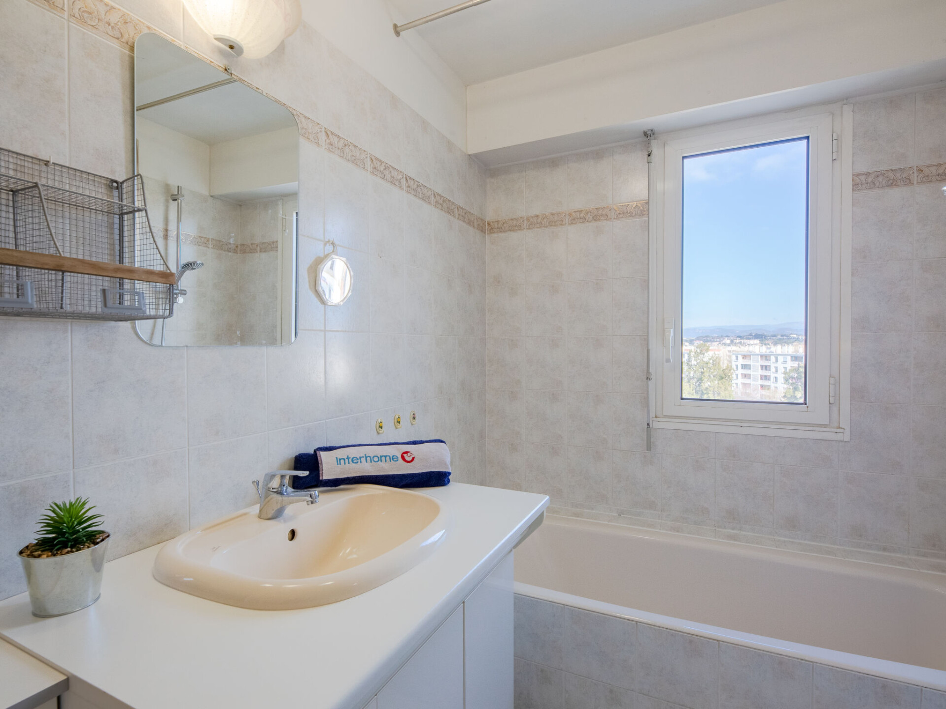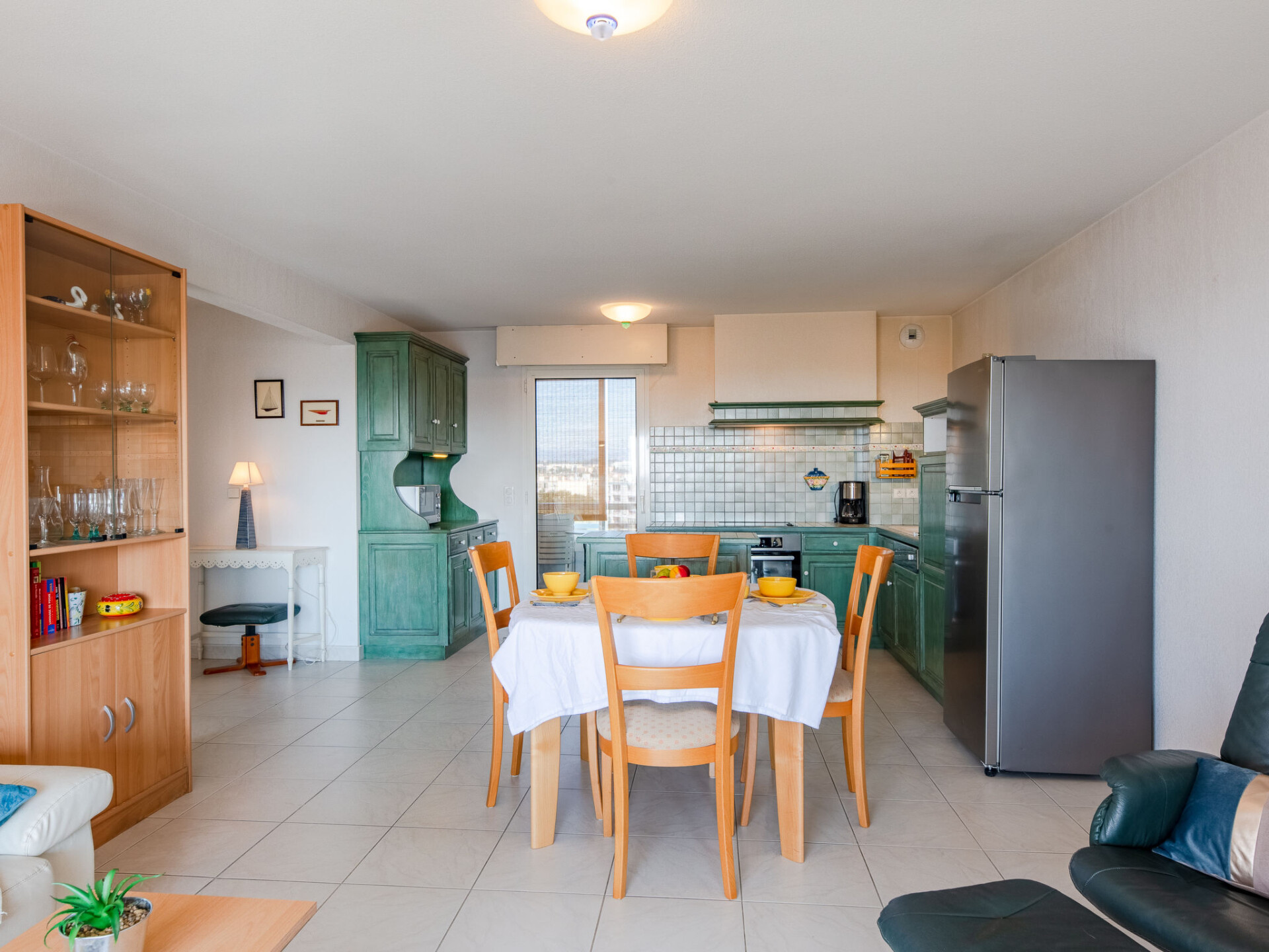 Appartement 3-kamers 73 m2 op de 5e verdieping. Comfortabel ingericht: woon-/eetkamer met 1 2-pers divanbed (1 x 140 cm, lengte 190 cm), TV, elektrische verwarming en air-conditioning. Uitgang naar het terras. 1 kamer met 1 2-pers divanbed (1 x 140 cm, lengte 190 cm). 1 kamer met 1 2-pers bed (1 x 160 cm, lengte 190 cm), TV, elektrische verwarming en air-conditioning. Uitgang naar het terras. Open keuken (oven, afwasmachine, 4 keramische glas kookplaten, magnetron, diepvriezer, elektrische koffiemachine) met eettafel. Uitgang naar de loggia. Badkamer, aparte WC. Groot terras 17 m2. Terrasmeubelen. Uitzicht op zee. Ter beschikking: wasmachine, droger, strijkijzer, haardroger. Internet (Internet (WiFi), extra). Garage nr. 6/7, hoogte 190 cm, breedte 340 cm. TV alleen FR. Rookmelders.