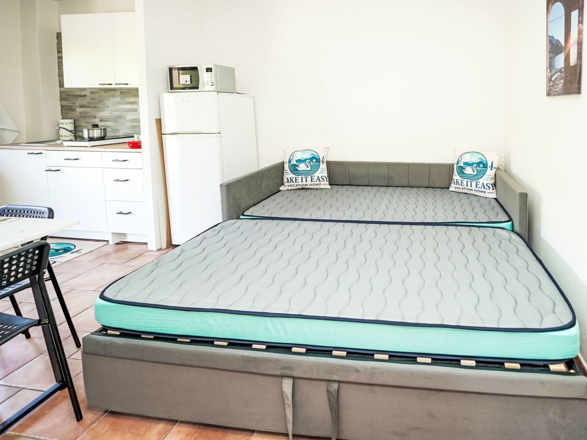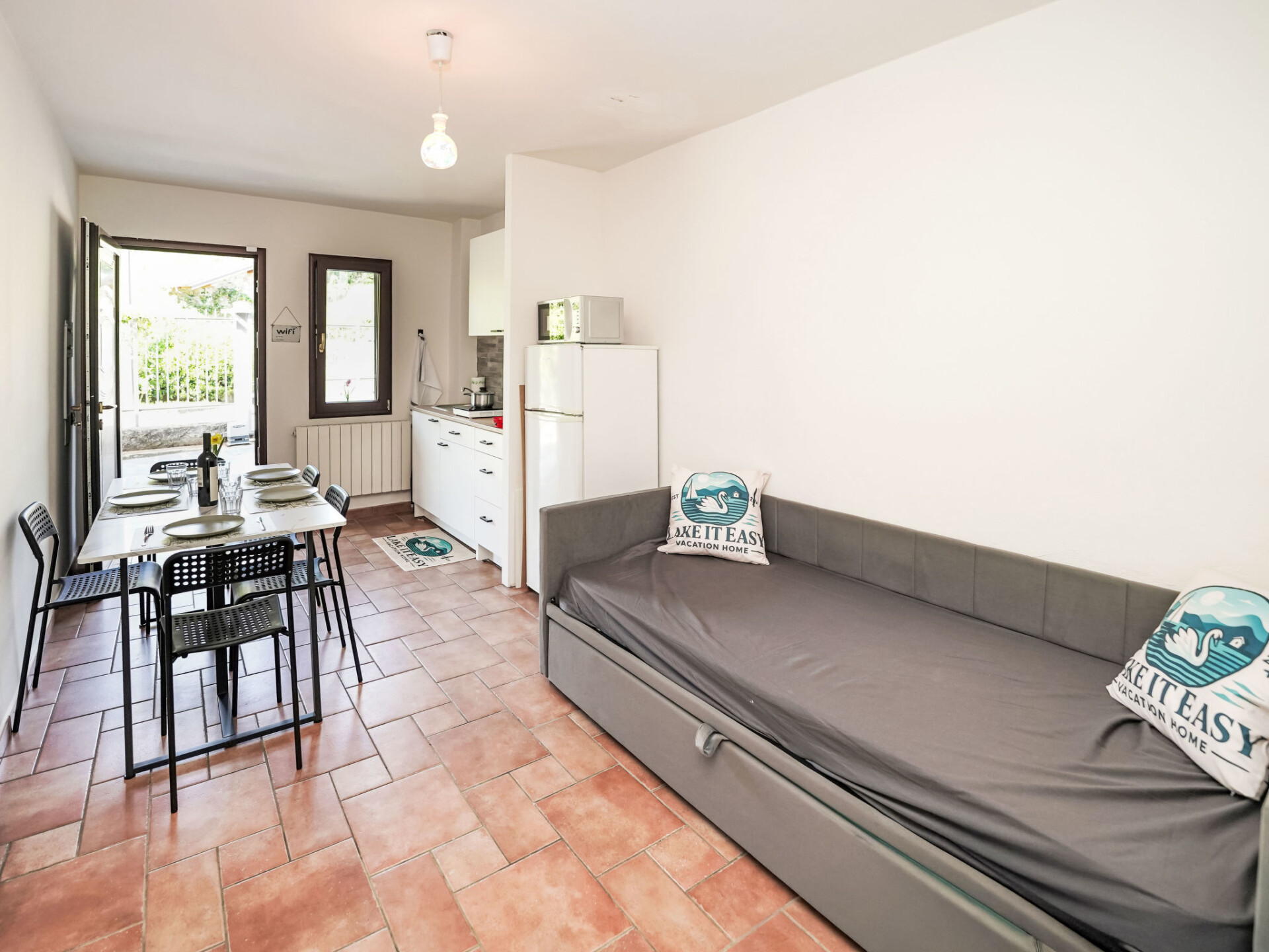 "Lake It Easy", appartement 2-kamers 45 m2, op de begane grond. Gerenoveerd in 2025, doelmatig en gezellig ingericht: woon-/eetkamer met 1 2-pers divanbed. 1 kamer met 1 bed, 1 2-pers bed en TV. Kookhoek (2 inductiekookplaten, waterkoker, magnetron, elektrische koffiemachine). Douche/bidet/WC. Gas-verwarming. Verwarming alleen beschikbaar van 01.10. tot 30.04. Ter beschikking: wasmachine, kinderstoel, haardroger. Internet (WiFi, gratis). Parkeerplaats (1 Auto). Privé ingang, rookmelders, brandblusser. IT012045C29SHRUI4O