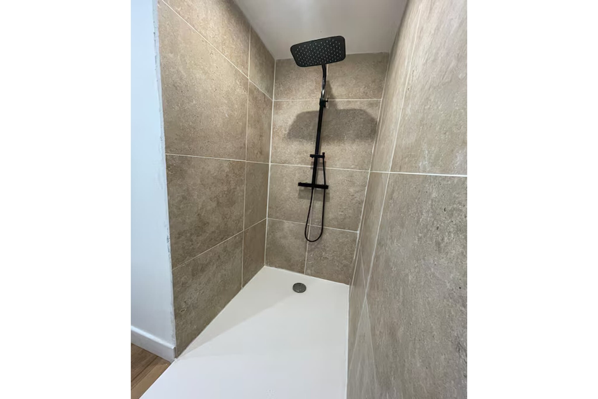 Het interieur is ingericht als een gecombineerde woon- en slaapruimte, zorgvuldig ingedeeld om maximaal comfort te bieden zonder dat het benauwd aanvoelt. Een tweepersoonsbed vormt het middelpunt van de kamer, terwijl een eenpersoons slaapbank extra flexibiliteit biedt. Een aparte zithoek met tv creëert een ontspannen hoekje om 's avonds tot rust te komen. De volledig uitgeruste, moderne badkamer zorgt voor extra gemak, waardoor de dagelijkse routine moeiteloos verloopt. Natuurlijk licht stroomt naar binnen en onthult een rustgevend uitzicht op de tuin, wat de serene sfeer in het hele vakantiehuis versterkt.