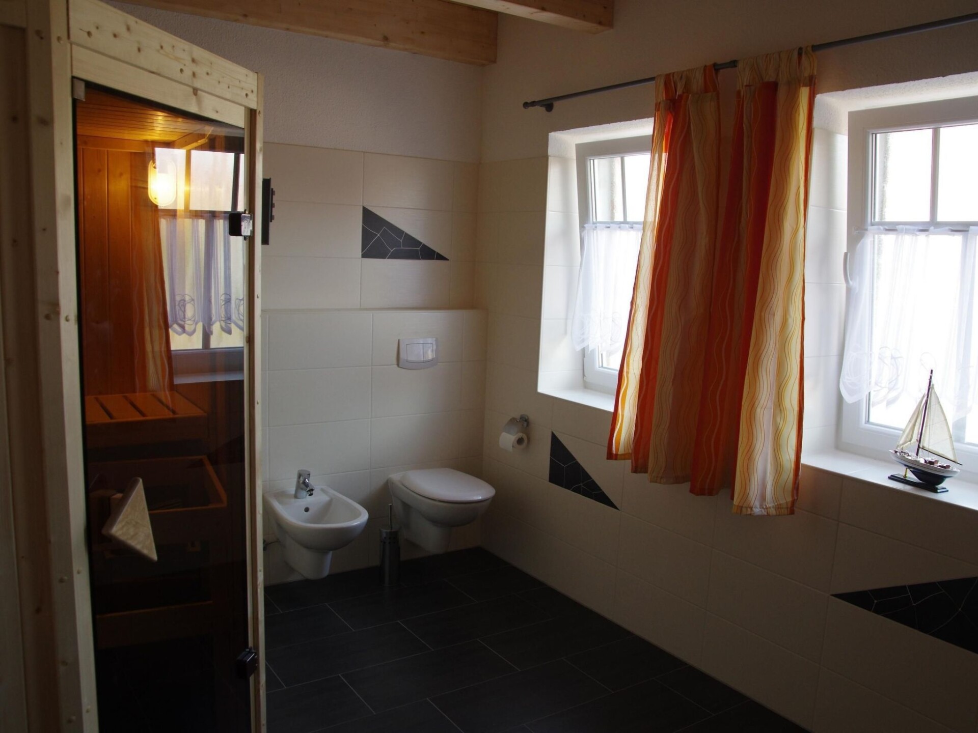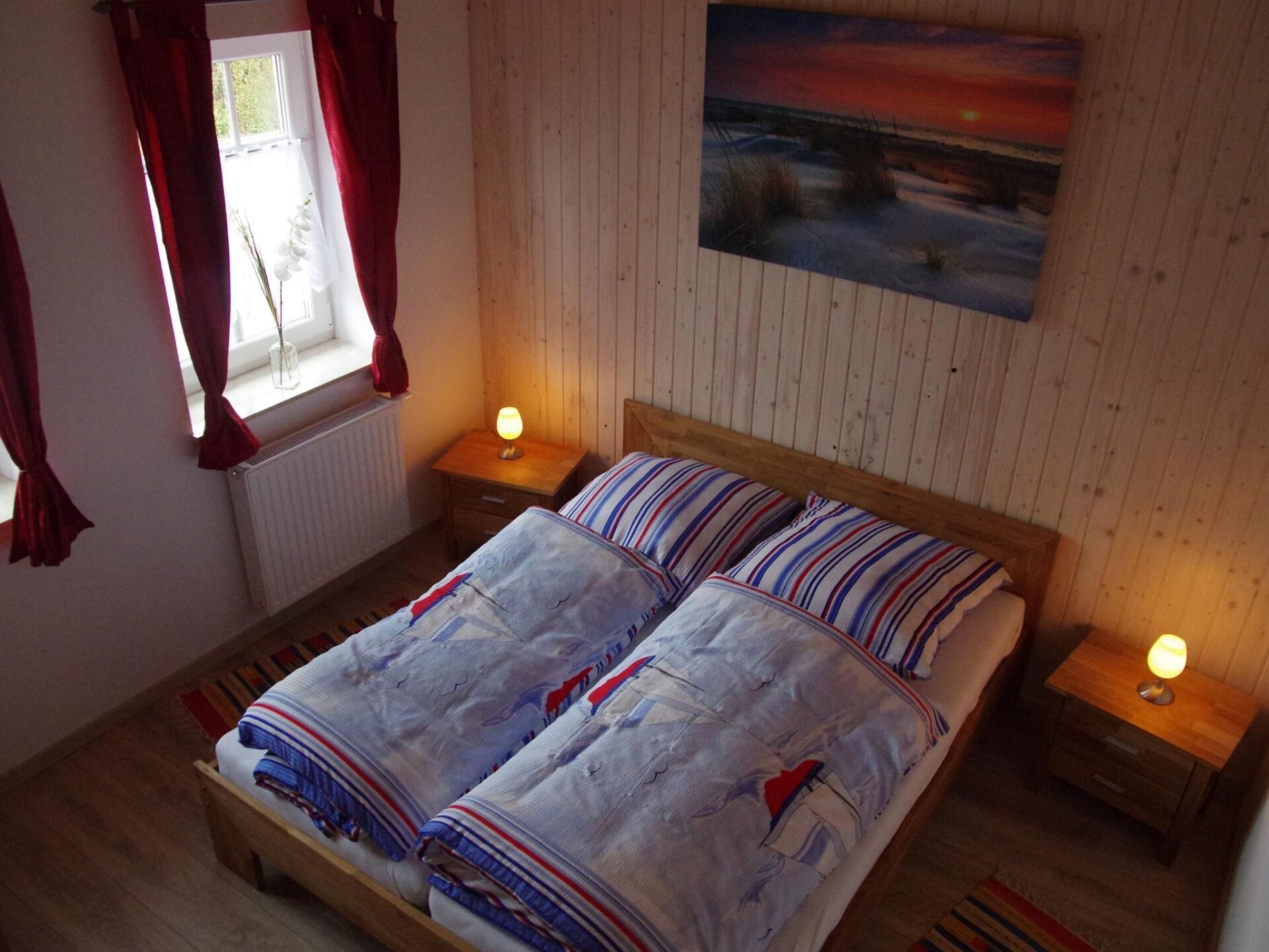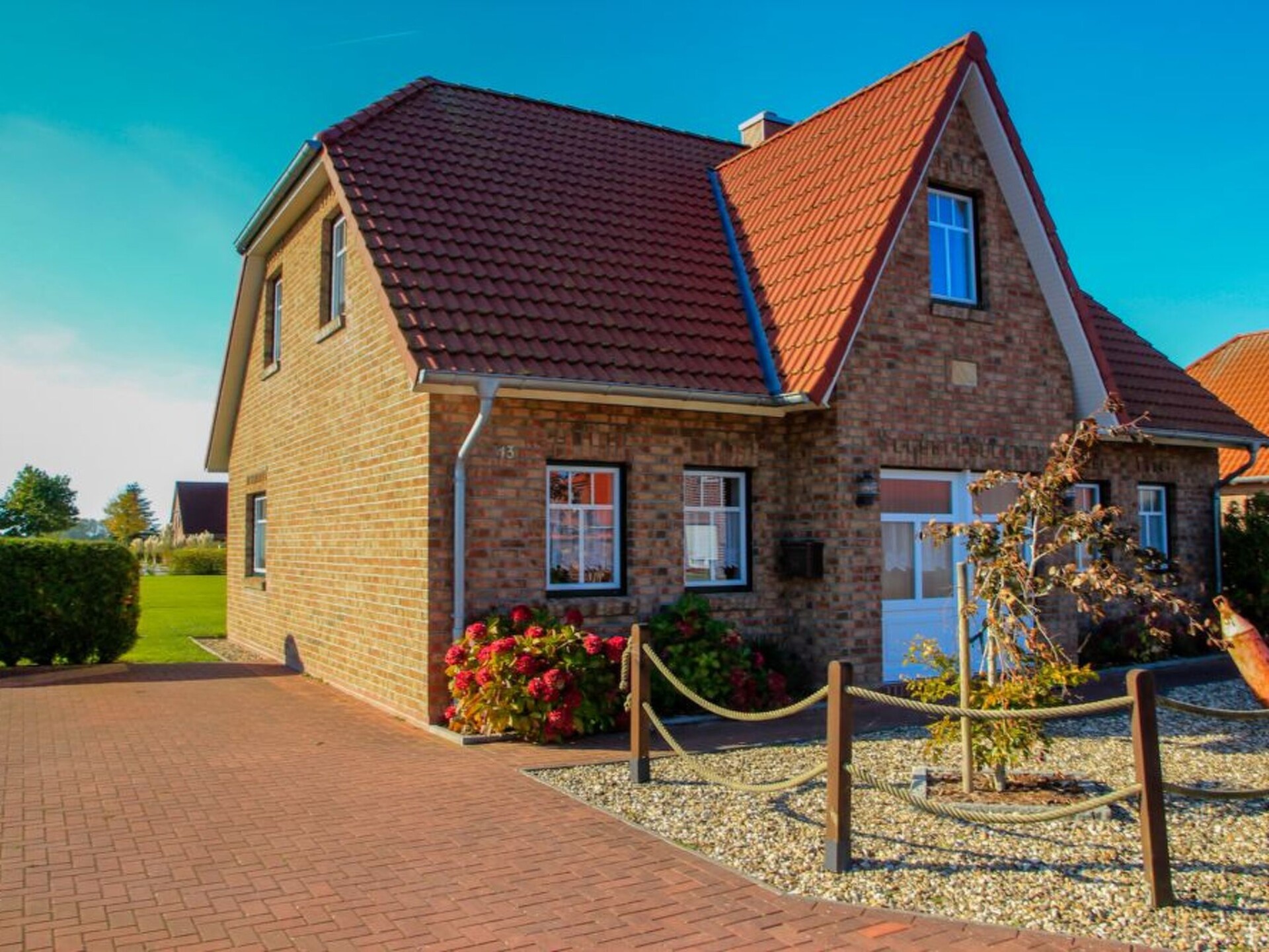 Spacious wellness holiday home with sauna, wood-burning stove and south-facing terrace for the whole familyYour holiday accommodation offers four bedrooms, one of which is on the ground floor, and two shower rooms. The house is therefore equipped for eight people, ideal for two families. The sauna and the wood-burning stove in the living room are ideal for a holiday not only in summer. The beautiful wooden beamed ceiling and the maritime furnishings give the house a very special character. On the ground floor is the spacious living/dining area with large doors leading onto the south-facing terrace. The kitchen is fully equipped with an oven, microwave, dishwasher and much more. A washing machine and tumble dryer are housed in the directly adjoining utility room. The ground floor bathroom has a shower, WC, bidet and private sauna. One of the (parents') bedrooms with a double bed (1.60 m x 2.00 m) is located on the ground floor and is therefore ideal for bringing the grandparents. There are three further bedrooms on the upper floor, one with a double bed (1.80 m x 2.00 m) and two with two single beds (each 0.90 m x 2.00 m). There is also another bathroom with shower. Note on WLAN: Unfortunately, the providers only allow a maximum Internet speed of UMTS. Instead of WLAN, you can refuel for a few days.The holiday home is located in Grimersum (approx. five km to Greetsiel). It is located in a quiet residential area with other holiday and private houses in a cul-de-sac.The boat harbour is only 60 m away. The canal there has a connection to Greetsiel and Emden; in summer by (paddle) boat, in winter partly by skate. A nice public playground is only a few steps away, so you can leave the children alone. A restaurant and shopping facilities are approx. 3 km away.Two car parking spaces belong to the property. The garden shed contains garden furniture and a barbecue. Enjoy sunbathing or marvellous barbecue evenings on the south-facing terrace.
