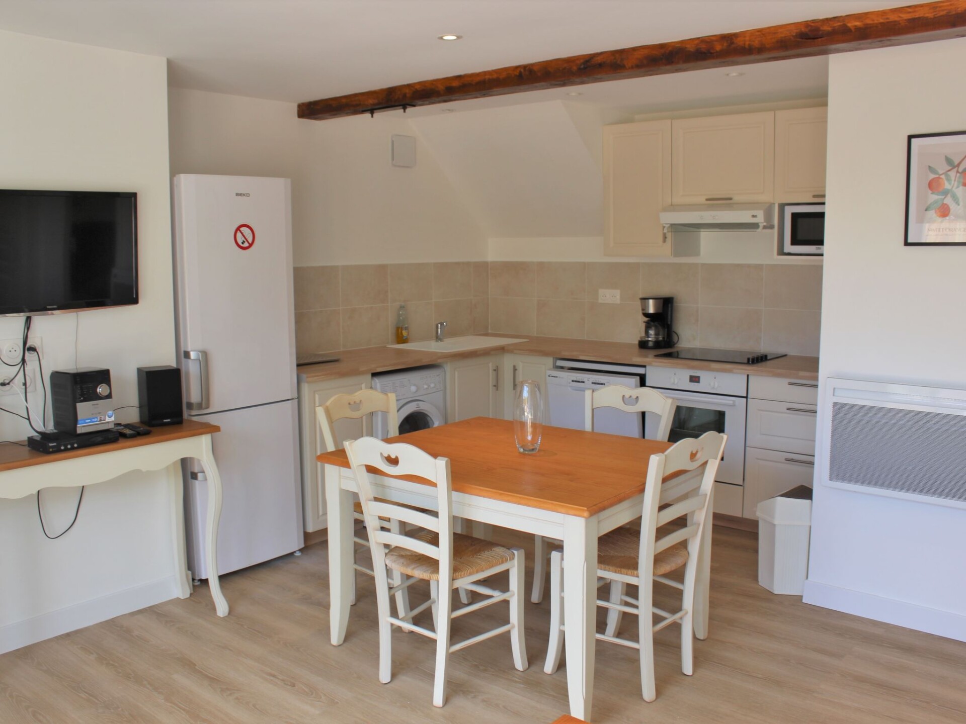 "Le Clos des Rives (T2 bis)", appartement 2-kamers 54 m2, op de begane grond. Het objekt is geschikt voor 2 volwassenen + 1 kinderen. Mooi en gezellig ingericht: woon-/slaapkamer met 1 2-pers divanbed (140 cm, lengte 190 cm), eettafel, Sat-TV, Flatscreen TV, stereo-installatie en DVD. Uitgang naar het terras. 1 kamer met 1 2-pers bed (160 cm, lengte 200 cm). Cabine met 1 bed (90 cm, lengte 190 cm). Open keuken (oven, afwasmachine, 4 keramische glas kookplaten, broodrooster, waterkoker, magnetron, diepvriezer, elektrische koffiemachine, pads voor de koffiemachine (Tassimo) extra). Douche, aparte WC, dubbele wastafels. Elektrische verwarming. Terras. Terrasmeubelen. Ter beschikking: wasmachine, kluis, strijkijzer, kinderstoel, kinderbed (extra). Internet (WiFi, gratis). Niet rokers woning. Maximaal 2 huisdieren/honden toegestaan. Rookmelders. In plaats van een afgesloten slaapkamer bevinden sommige slaapgedeeltes zich in een open ruimte (galerij, nis, etc.).