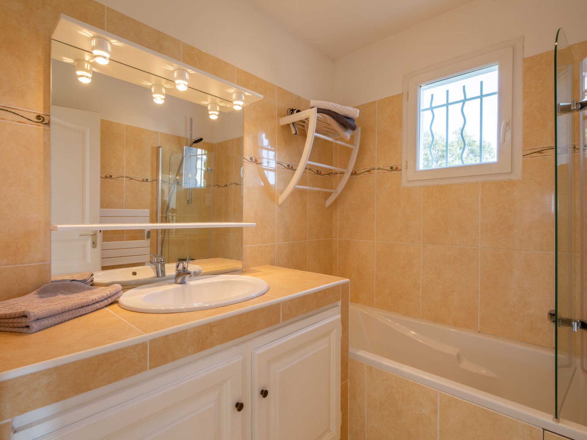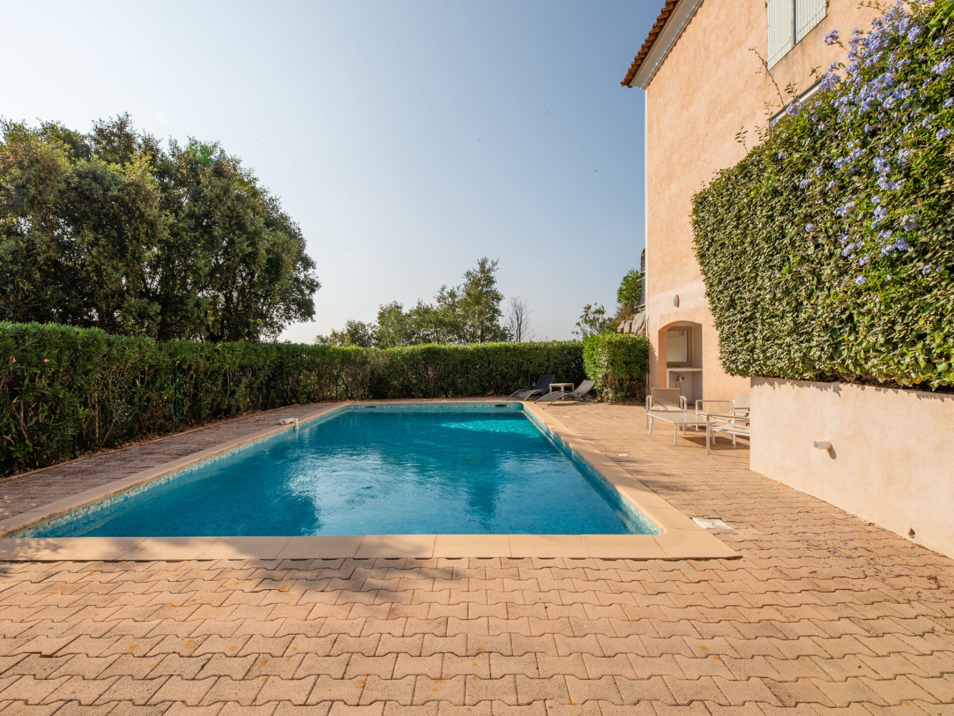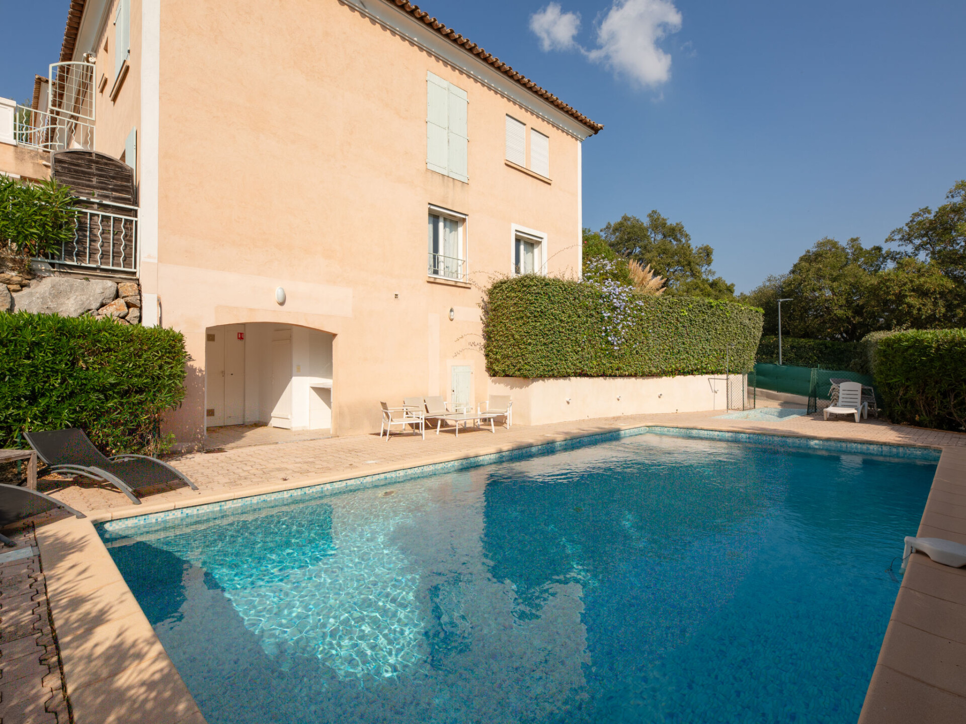 Flatgebouw "Le Green", van 2 verdiepingen. 4 appartementen in de woning. In de wijk Du Golf de Sainte Maxime, aan de rand van de plaats, 5 km van het centrum van Sainte-Maxime, rustige, zonnige ligging op een heuvel, in een woonwijk, gebied met weinig verkeer, 5 km van zee, direct aan het strand, aan een doodlopende weg, aan de golfbaan, op het zuiden. Voor medegebruik: openluchtzwembad hoekig (10 x 5 m, 170 - 170 cm diepte, seizoensgebonden beschikbaarheid: 01.Jun. - 30.Sep.) met trap en alarminstallatie. Winkel 5 km, supermarkt 6.5 km, bushalte 4 km, treinstation "TGV Saint-Raphael" 25 km, zandstrand "La Nartelle" 4.5 km, thermaalbad "Thalasso Spa Les Issambres" 8 km. Jachthaven 4.5 km, golfterrein (18 holes) 30 m, fietspad 2 km. Attracties in de buurt: Aqualand waterpark 6.5 km, Navette / shuttle boat St-Tropez 15min 4.5 km, Saint-Tropez Ramatuelle 18 km, Port-Grimaud 15 km, Gorges du Verdon 90 km. Wandelgebied Massif des Maures 5 km, Massif de l'Esterel 23 km. Auto noodzakelijk. De sleuteloverdracht vindt plaats bij het agentschap Interhome in Sainte-Maxime, 4 km.
