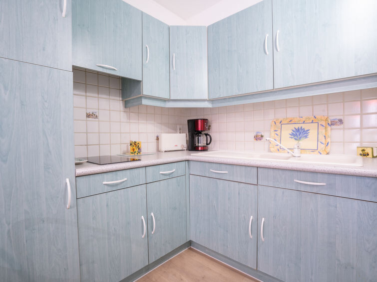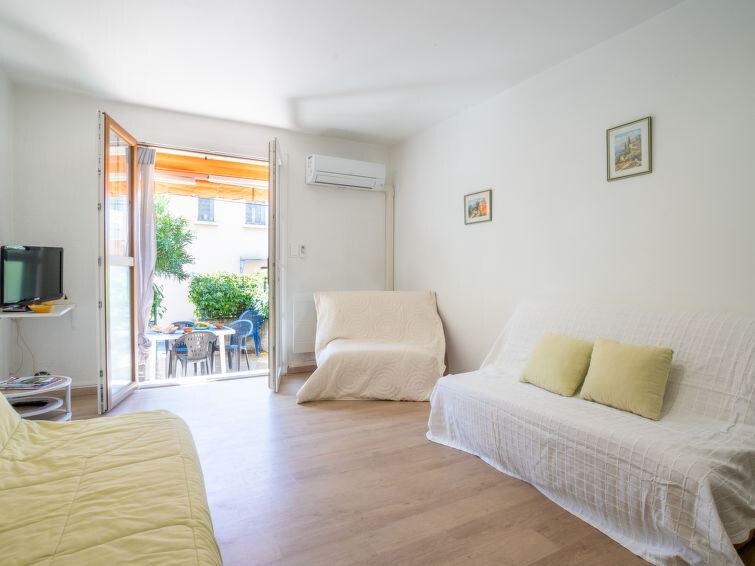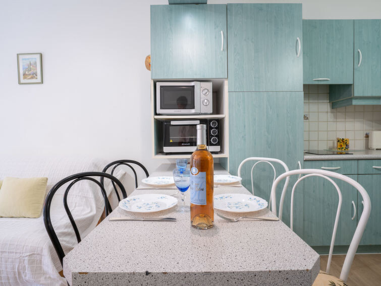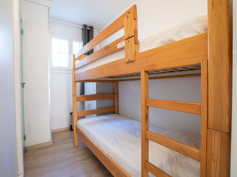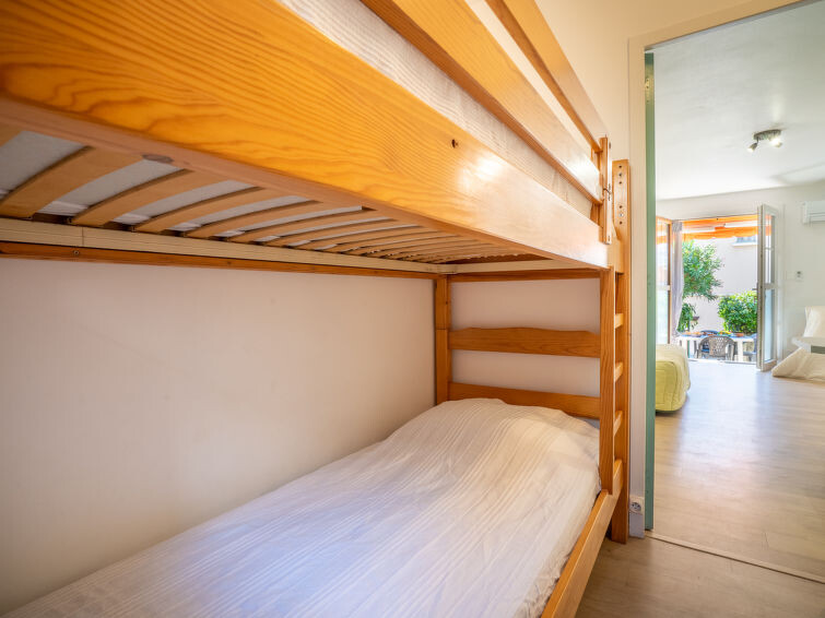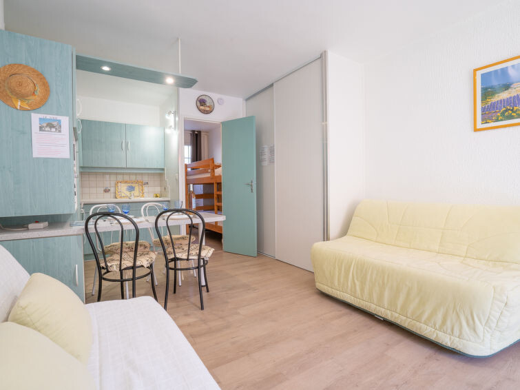Appartement 1-kamer 30 m2, op verhoogde begane grond. Woon-/eetkamer met 1 2-pers divanbed (140 cm, lengte 190 cm), TV (Flatscreen TV), air-conditioning. Uitgang naar het terras. Cabine met 1 x 2 stapelbedden (80 cm, lengte 190 cm). Open keuken (mini-oven, 2 keramische glas kookplaten, broodrooster, waterkoker, magnetron, diepvriezer, elektrische koffiemachine). Bad/WC. Heteluchtverwarming. Terras 13 m2, op het zuidoosten gelegen. Terrasmeubelen. Ter beschikking: wasmachine. Internet (Internet (WiFi), extra). Parkeerplaats nr. 3. Geschikt voor families. TV alleen FR. Rookmelders. In plaats van een afgesloten slaapkamer bevinden sommige slaapgedeeltes zich in een open ruimte (galerij, nis, etc.). 83112 000189 09