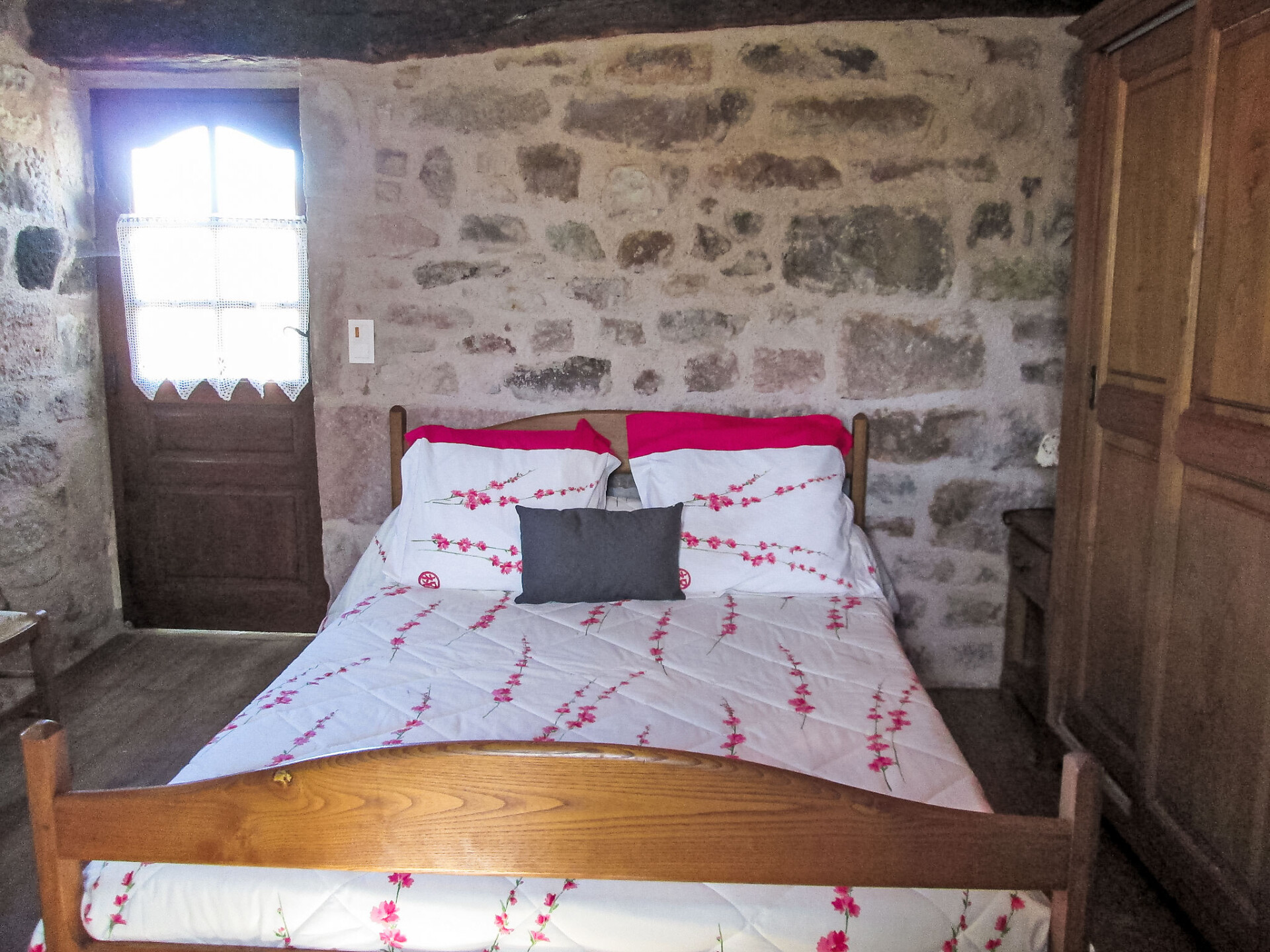 "Le Pigeonnier", huis 2-kamers 40 m2 op 3 verdiepingen. Het objekt is geschikt voor 2 volwassenen + 2 kinderen. Rustiek ingericht: woonkeuken 12 m2 (2-pits kookplaat, oven, 2 kookpitten (vlammen), broodrooster, waterkoker, magnetron, elektrische koffiemachine). Douche/WC. Houtverwarming. Bovenverdieping: (steile trap) doorgangskamer met 1 2-pers bed (140 cm, lengte 190 cm). Uitgang naar het balkon. 2e Verdieping: (ladder), 1 kamer met afgeschuinde daken met 2 bedden (90 cm, lengte 190 cm). Terras 15 m2, overdekt. Terrasmeubelen, barbecue (verrijdbaar). Ter beschikking: wasmachine, strijkijzer, haardhout (gratis). Rookvrij huis. Maximaal 1 huisdier/hond toegestaan. Rookmelders.