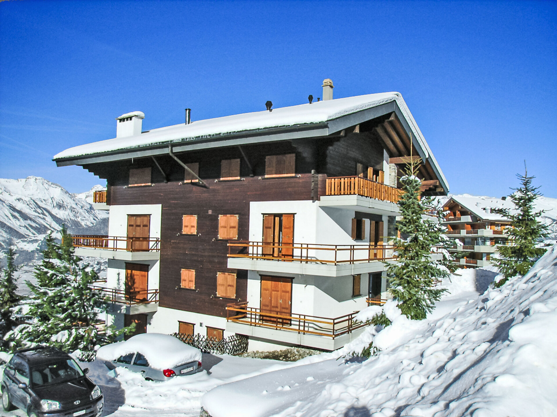 Flatgebouw "Les Crêtes 1", 1.350 m boven zeeniveau. In de plaats, 290 m van het centrum, rustige ligging. In het huis: lift, centrale verwarming, wasmachine, droger (voor medegebruik, extra). Openbare parkeergarage op 750 m, extra. Levensmiddelenwinkel 150 m, restaurant 100 m, bakkerij 300 m, bushalte "Principal Veysonnaz" 500 m, treinstation "Gare de Sion" 16 km, overdekt zwembad 200 m. Kabelbaan op 700 m, skibushalte 100 m. De eigenaar accepteert geen groepen. Gratis skibus. Vergelijkbare accommodaties kunnen worden geboekt.