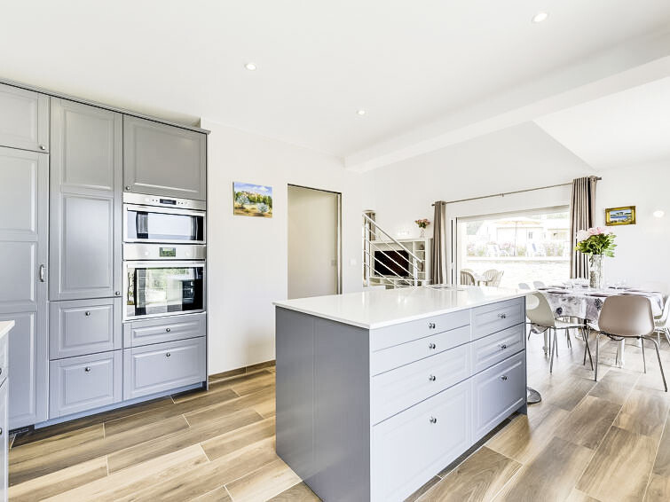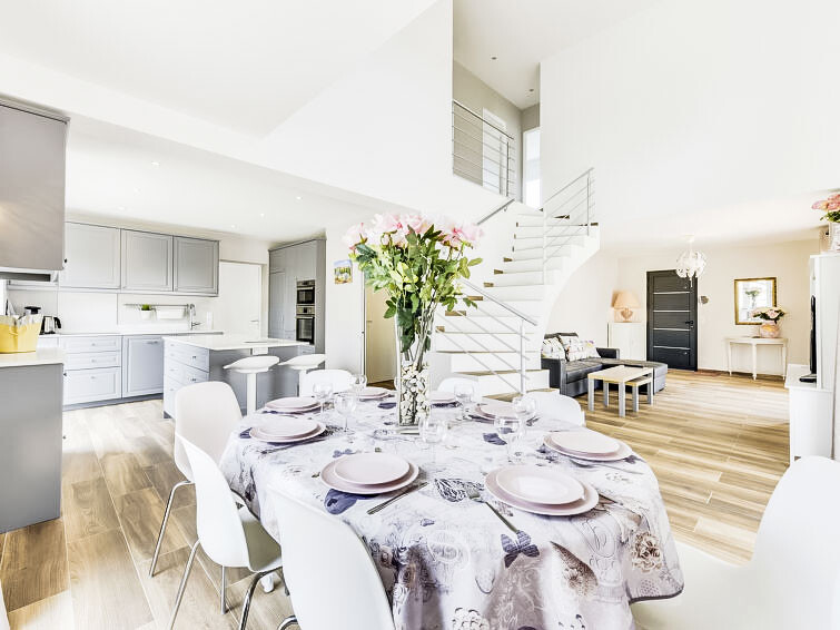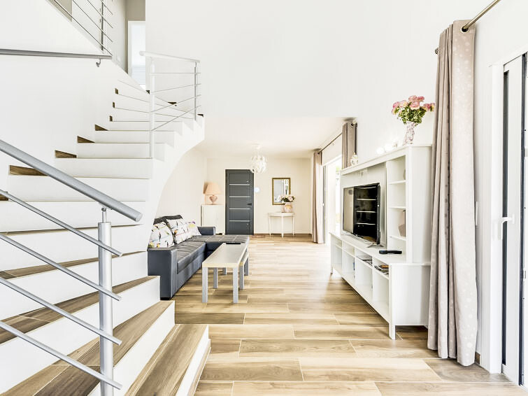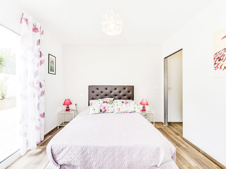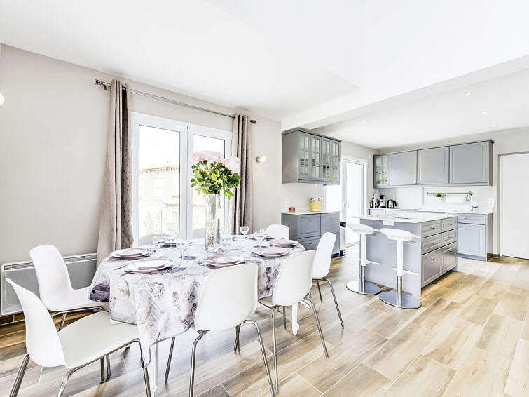 Huis 5-kamers 120 m2 op 2 verdiepingen. Comfortabel en modern ingericht: woon-/eetkamer met TV (Flatscreen TV). Uitgang naar het terras. 1 groot kamer met 1 2-pers bed (140 cm, lengte 190 cm), douche en air-conditioning. Open keuken (oven, afwasmachine, 4 inductiekookplaten, magnetron, diepvriezer, elektrische koffiemachine, pads voor de koffiemachine (L'or barista) extra, kookeiland). Aparte WC. Bovenverdieping: 1 kamer met 2 bedden (90 cm, lengte 190 cm). Uitgang naar het terras. 1 kamer met 1 2-pers bed (140 cm, lengte 190 cm). 1 kamer met 1 2-pers bed (140 cm, lengte 190 cm). Uitgang naar het terras. Douche/WC, aparte WC, dubbele wastafels. Elektrische verwarming, air-conditioning. Balkon 10 m2, terras 40 m2. Barbecue, ligstoelen (6). Ter beschikking: wasmachine, kinderstoel, kinderbed. Internet (WiFi, gratis). Rookvrij huis. Rookmelders.