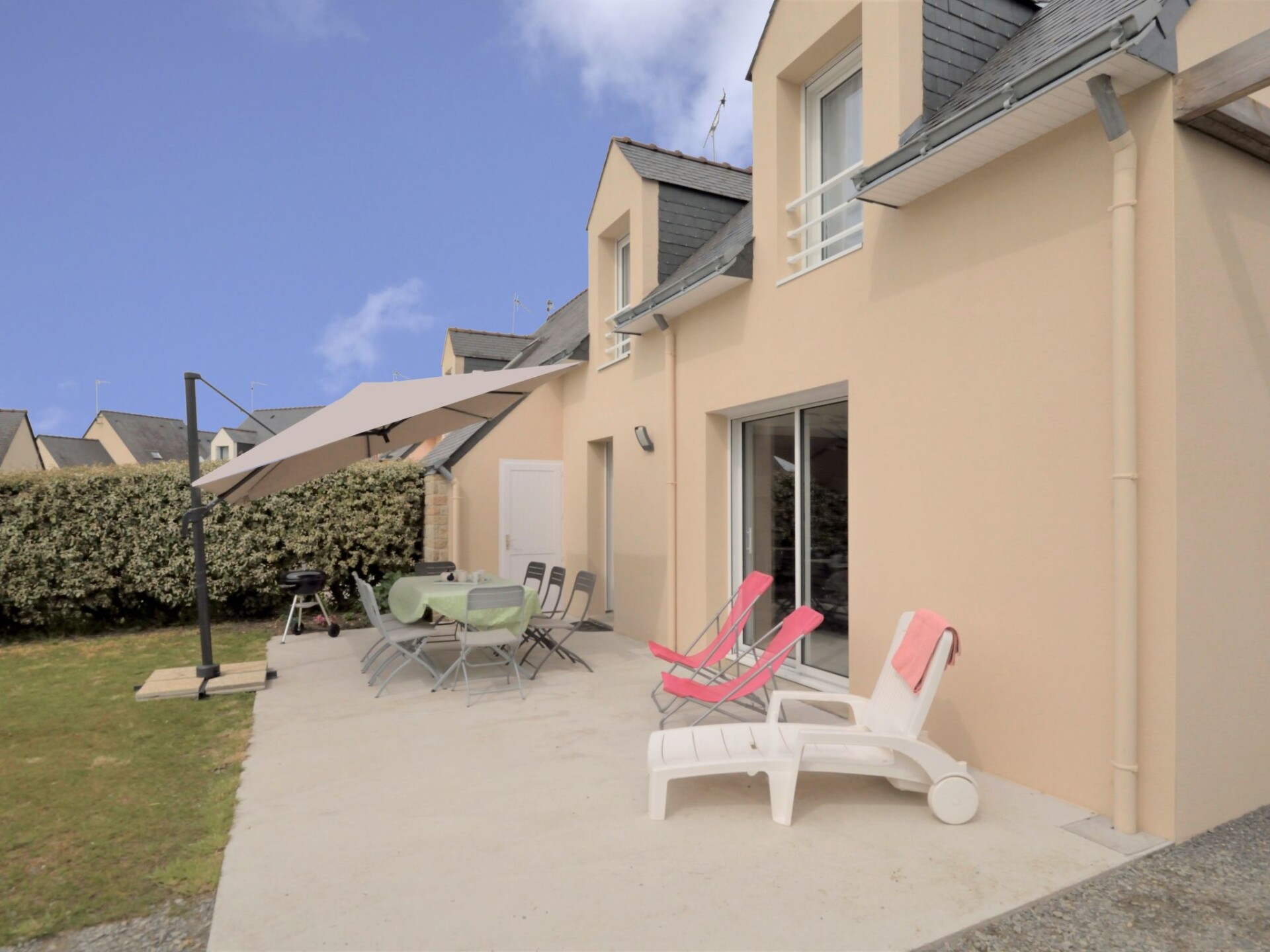 "Les Volets Bleus", huis in een rij 5-kamers 98 m2 op 2 verdiepingen. Gerenoveerd in 2021, mooi ingericht: woon-/eetkamer met eettafel en TV (Flatscreen TV). Uitgang naar het terras. 1 kamer met 1 2-pers bed (140 cm, lengte 190 cm), TV (Flatscreen TV). Open keuken (oven, afwasmachine, 3 inductiekookplaten, broodrooster, waterkoker, magnetron, elektrische koffiemachine). Douche/WC. Bovenverdieping: 1 kamer met afgeschuinde daken met 1 2-pers bed (140 cm, lengte 190 cm). Kleine doorgangskamer met afgeschuinde daken met 1 2-pers bed (140 cm, lengte 190 cm). 1 kamer met afgeschuinde daken met 2 bedden (80 cm, lengte 200 cm). Douche, aparte WC. Elektrische verwarming. Terras. Terrasmeubelen, barbecue. Ter beschikking: wasmachine, strijkijzer, kinderstoel, kinderbed. Internet (WiFi, gratis). Rookvrij huis. Maximaal 1 huisdier/hond toegestaan. Rookmelders.