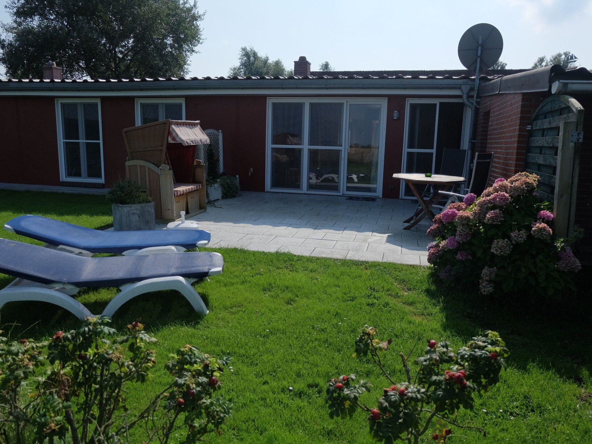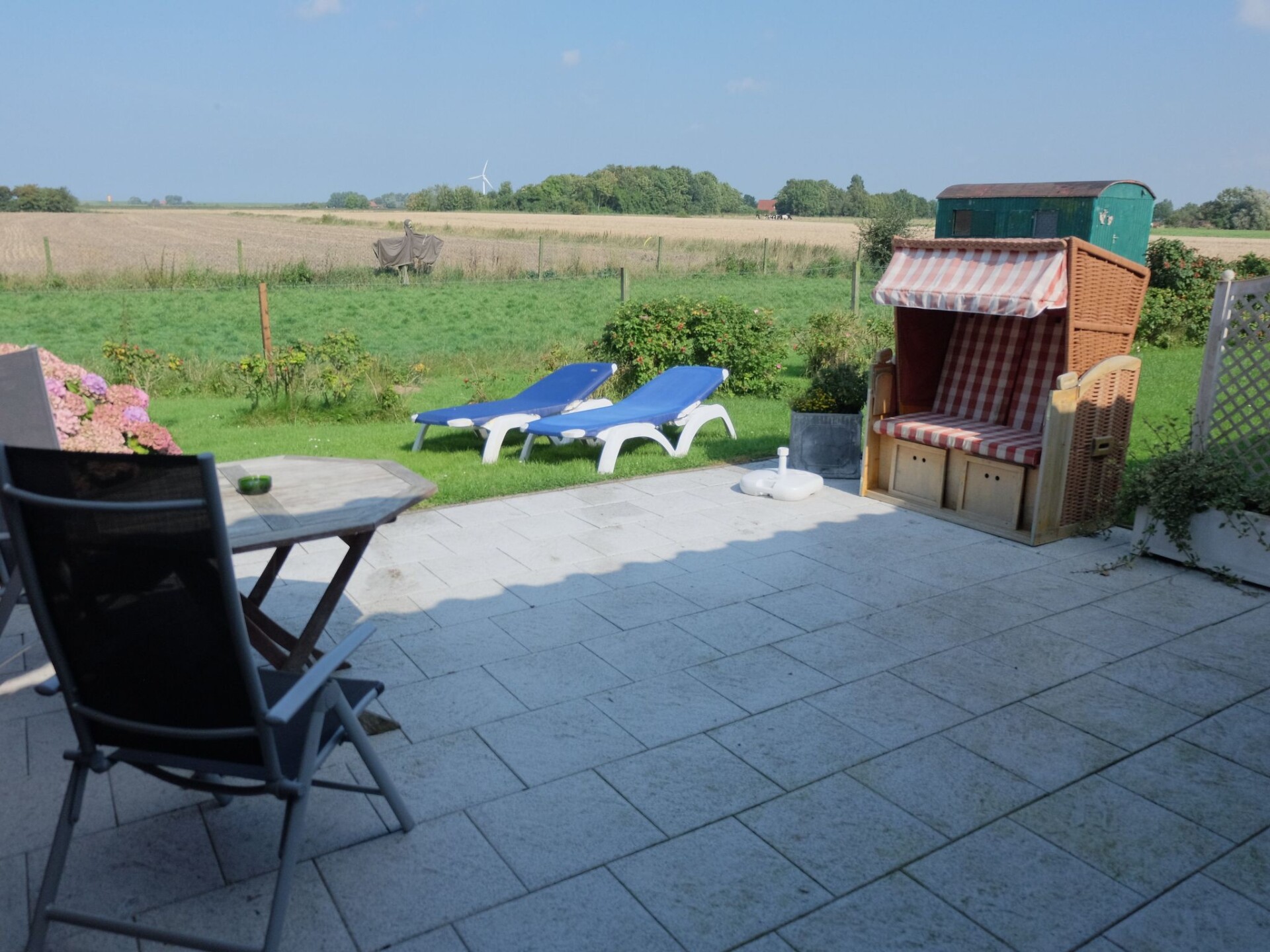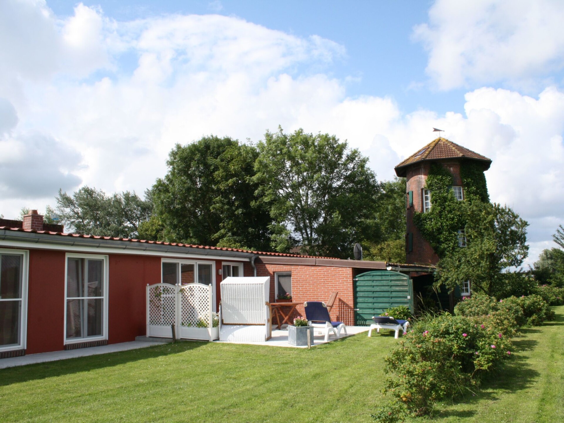 The holiday flat "Leuchtturm" is an accommodation suitable for wheelchair users, which is also very comfortable for everyone else. It is barrier-free and very spacious, especially in the bathroom, and offers you a wonderful view of the dyke and our famous red and yellow Pilsum lighthouse, views over the countryside, large private terrace, all barrier-free and at ground level on the property and the nearby private car park of our guesthouse.Generously equipped, suitable for wheelchair users according to DIN standard, bright and friendly, "furniture moving" on request. Kitchenette with wheelchair access, fully equipped with dishwasher, combined small oven/microwave, flat screen TV, small stereo system, washing machine. Use of tumble dryer in the main house for a fee. WLAN in the main house, barrier-free access with a little help. Additional underfloor heating in the living/kitchen area and bathroom. Bedroom double bed 2.00 x 2.00 m, sliding door wardrobe, small seating area, living room sofa and 2 armchairs and table, open area to the kitchen with large dining table and chairs.Private terrace with deckchairs, beach chair, garden table and chairs, parasol. Lockable communal bicycle room with charging facilities for e-bikes and wheelchairs. E - bikes and wheelchair. At ground level. Large garden and large shared playground.Suitable for wheelchair users. Free internet access in the main house. Cot free of charge on request.Our Hof am Turm is detached with an all-round view of the dyke and countryside and is situated on a low-traffic path directly to the dyke, ideal for long walks or bicycle tours. 500 metres away is the picturesque village of Pilsum.