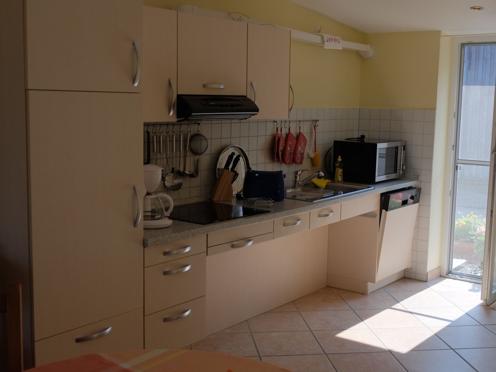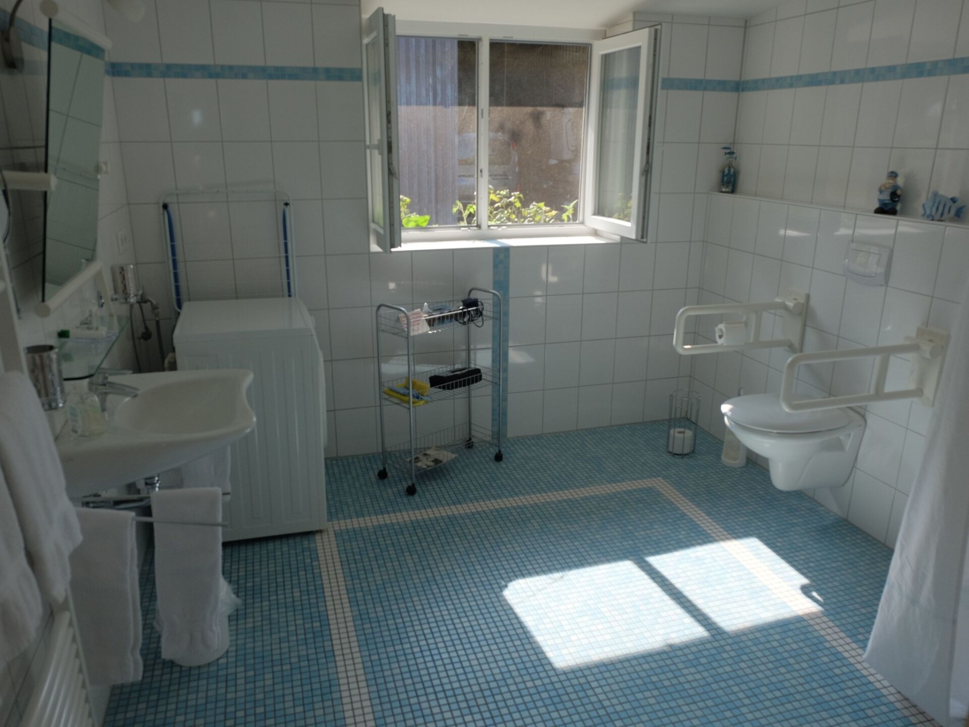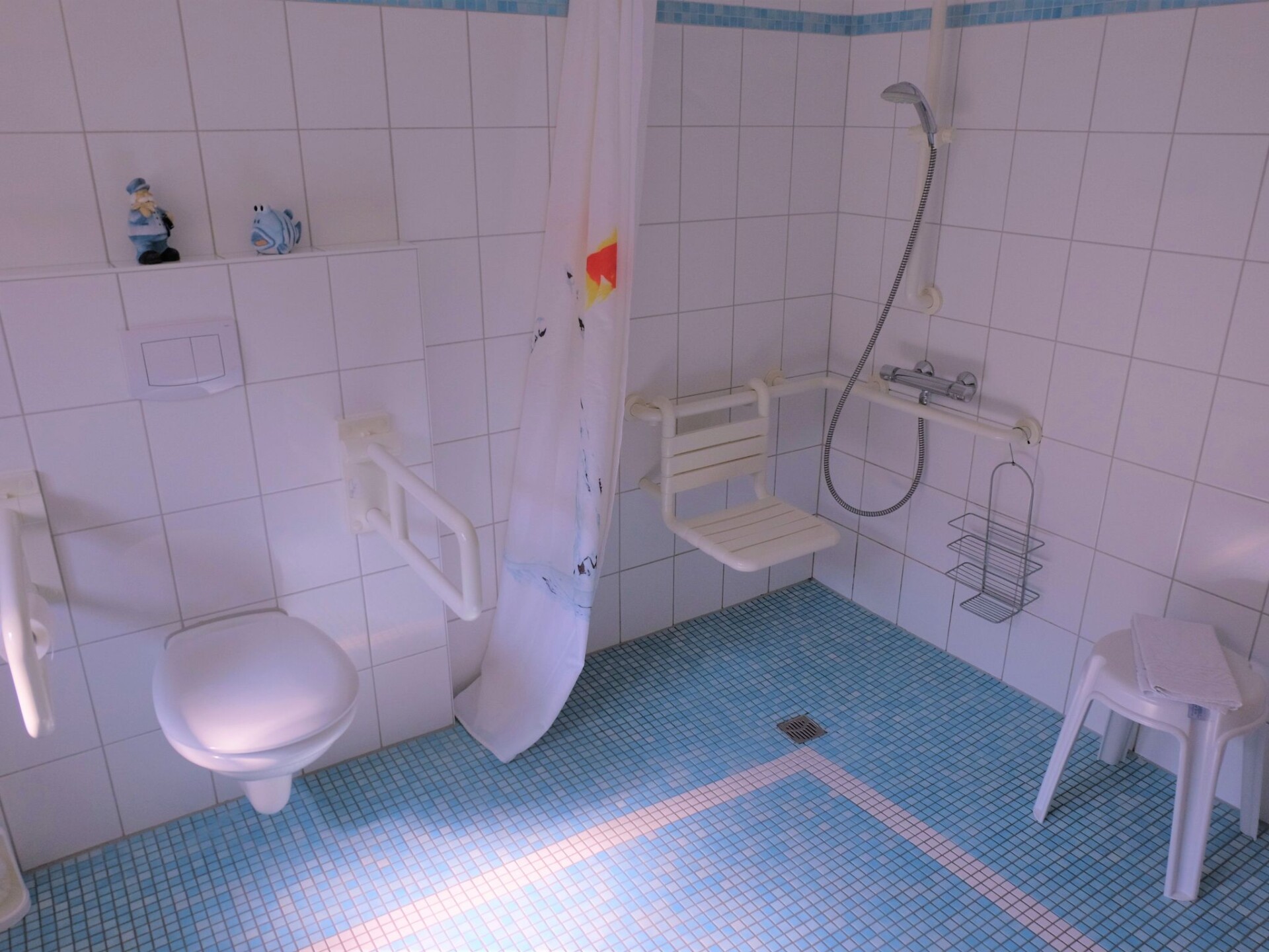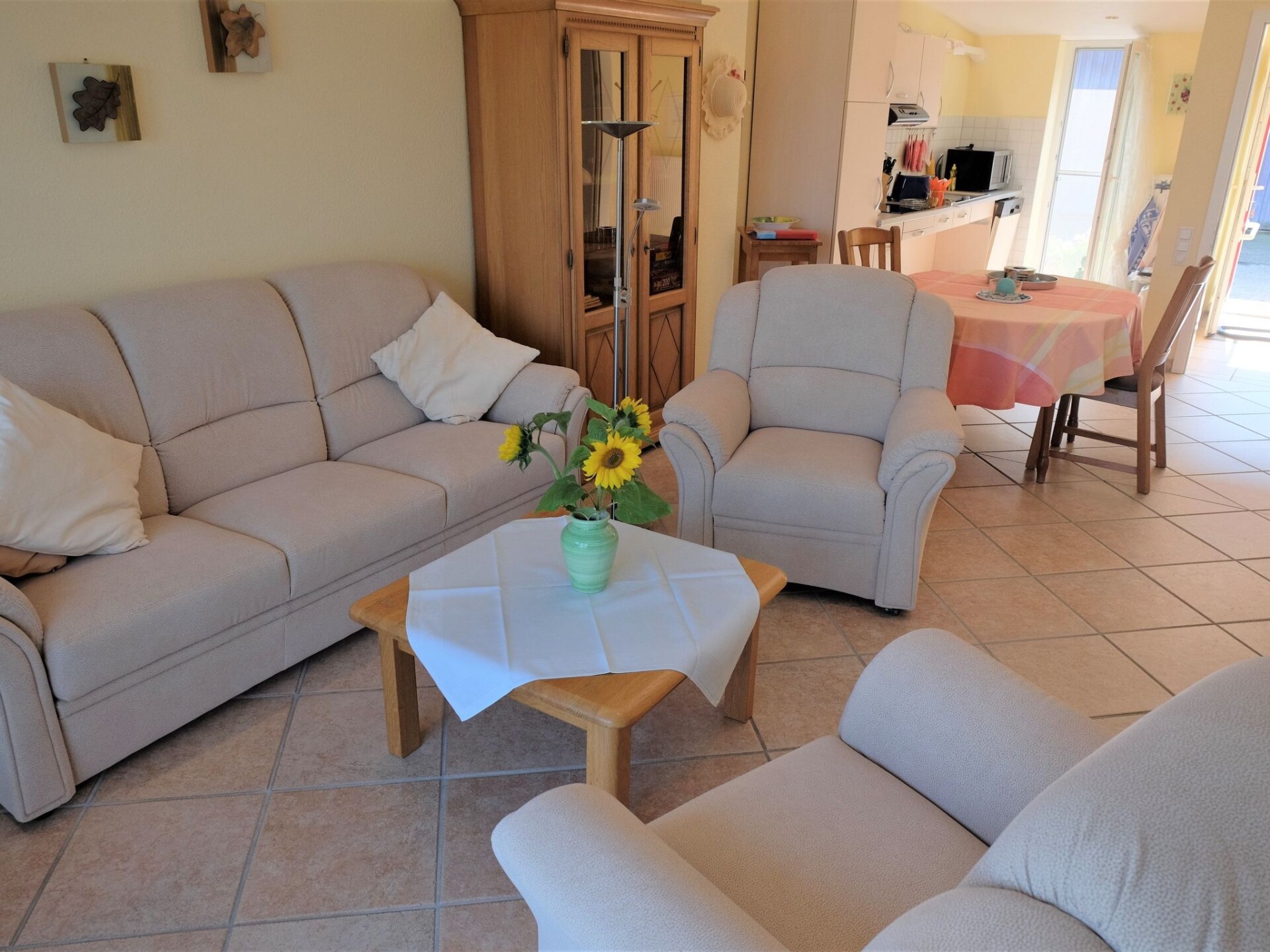 The holiday flat "Leuchtturm" is an accommodation suitable for wheelchair users, which is also very comfortable for everyone else. It is barrier-free and very spacious, especially in the bathroom, and offers you a wonderful view of the dyke and our famous red and yellow Pilsum lighthouse, views over the countryside, large private terrace, all barrier-free and at ground level on the property and the nearby private car park of our guesthouse.Generously equipped, suitable for wheelchair users according to DIN standard, bright and friendly, "furniture moving" on request. Kitchenette with wheelchair access, fully equipped with dishwasher, combined small oven/microwave, flat screen TV, small stereo system, washing machine. Use of tumble dryer in the main house for a fee. WLAN in the main house, barrier-free access with a little help. Additional underfloor heating in the living/kitchen area and bathroom. Bedroom double bed 2.00 x 2.00 m, sliding door wardrobe, small seating area, living room sofa and 2 armchairs and table, open area to the kitchen with large dining table and chairs.Private terrace with deckchairs, beach chair, garden table and chairs, parasol. Lockable communal bicycle room with charging facilities for e-bikes and wheelchairs. E - bikes and wheelchair. At ground level. Large garden and large shared playground.Suitable for wheelchair users. Free internet access in the main house. Cot free of charge on request.Our Hof am Turm is detached with an all-round view of the dyke and countryside and is situated on a low-traffic path directly to the dyke, ideal for long walks or bicycle tours. 500 metres away is the picturesque village of Pilsum.