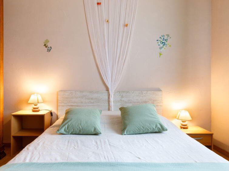 "L'Horizon", huis in een rij 4-kamers 70 m2, op het noordwesten gelegen. Ruim en licht: woon-/eetkamer met TV (Flatscreen TV). Uitgang naar het terras. 3 kamers, elke kamer heeft 1 2-pers bed (1 x 140 cm, lengte 190 cm). Open keuken (1 kookplaat, oven, afwasmachine, 4 kookpitten (vlammen), broodrooster, waterkoker, magnetron, diepvriezer, elektrische koffiemachine). Badkamer, aparte WC. Elektrische verwarming. Terras 35 m2, prieel. Terrasmeubelen, barbecue. Ter beschikking: wasmachine, strijkijzer, haardroger. Internet (WiFi, extra). Parkeerplaats (omheind, 3 Auto's). Rookvrij huis. 1 klein huisdier/hond toegestaan. Rookmelders. Aanbod door een particulier volgens art. 155, IV van CGI. 44012000030D8