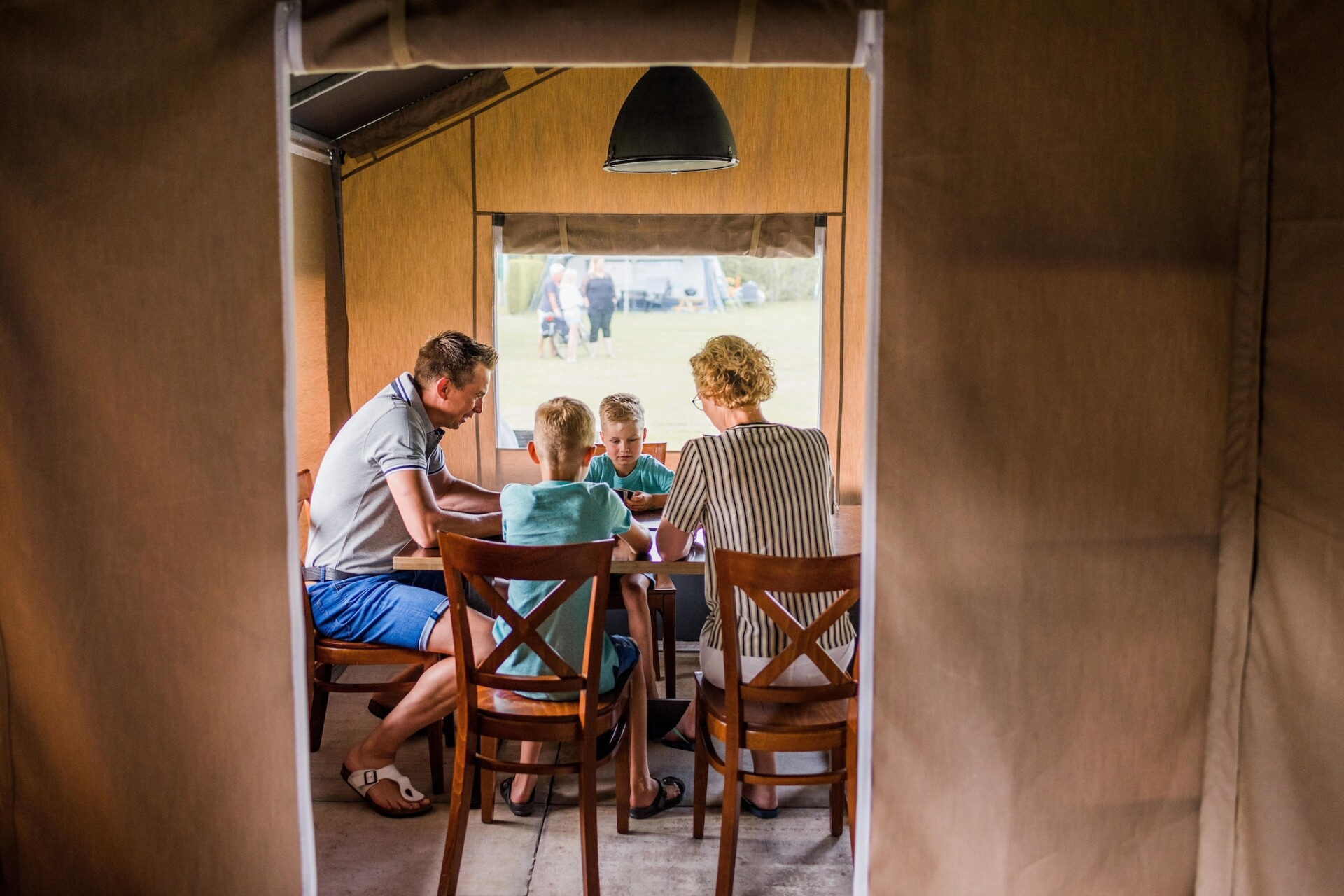 De safaritent is comfortabel, gezellig en compleet ingericht. Hier ervaart u het echte kampeergevoel, maar dan wel met net even wat meer comfort. Er is een woonvertrek met open keuken met onder andere een koel-/vriescombinatie en een kookplaat. Er zijn drie slaapvertrekken, waarvan één met een 2-pers. boxspringbed, één met twee 1-pers. bedden, al dan niet in een 2-pers. opstelling en één slaapvertrek met een 1-pers. bed. De safaritent heeft geen eigen badkamer. Voor de douche en het toilet maakt u gebruik van de centrale sanitairvoorzieningen op de camping.
