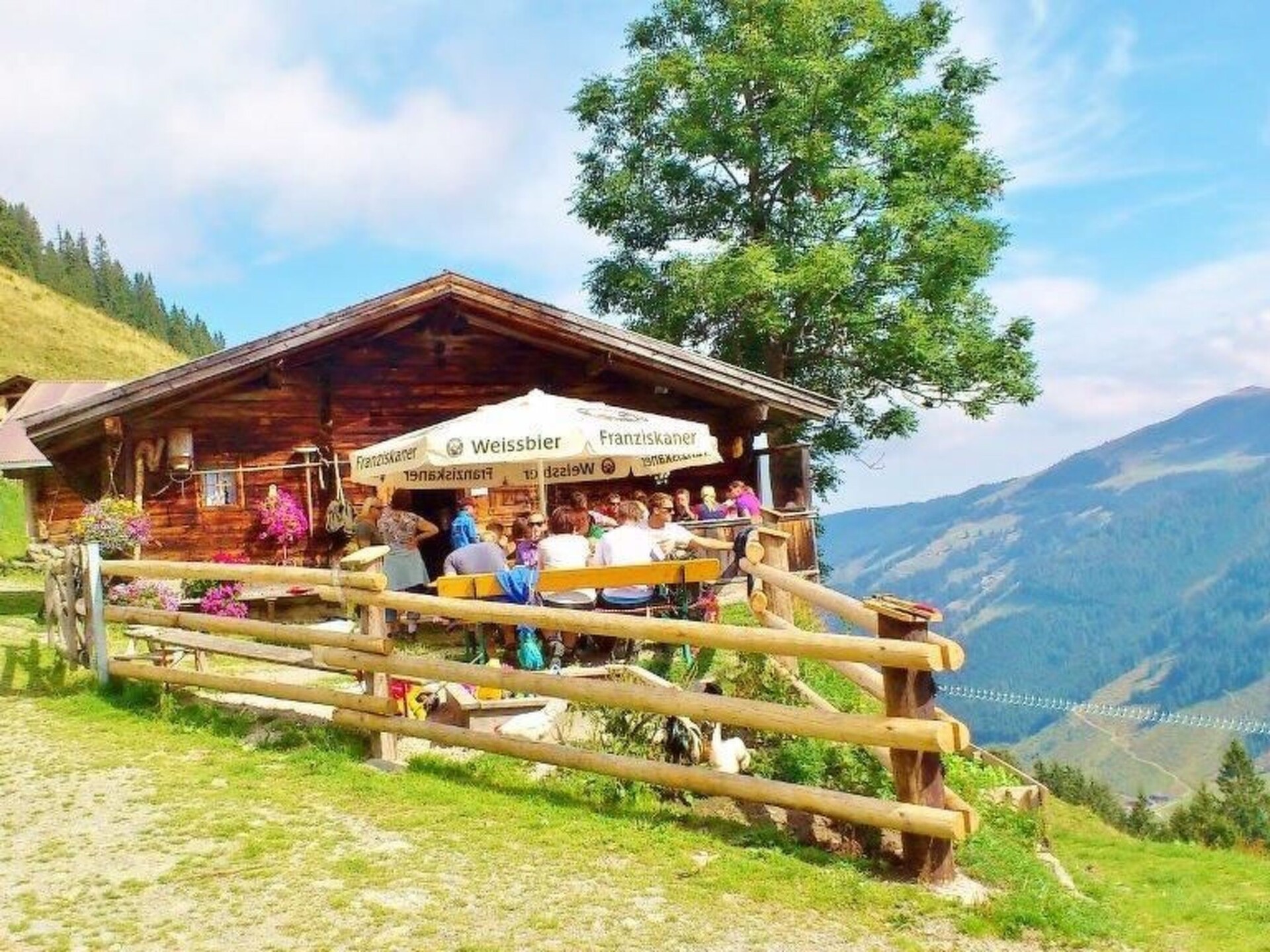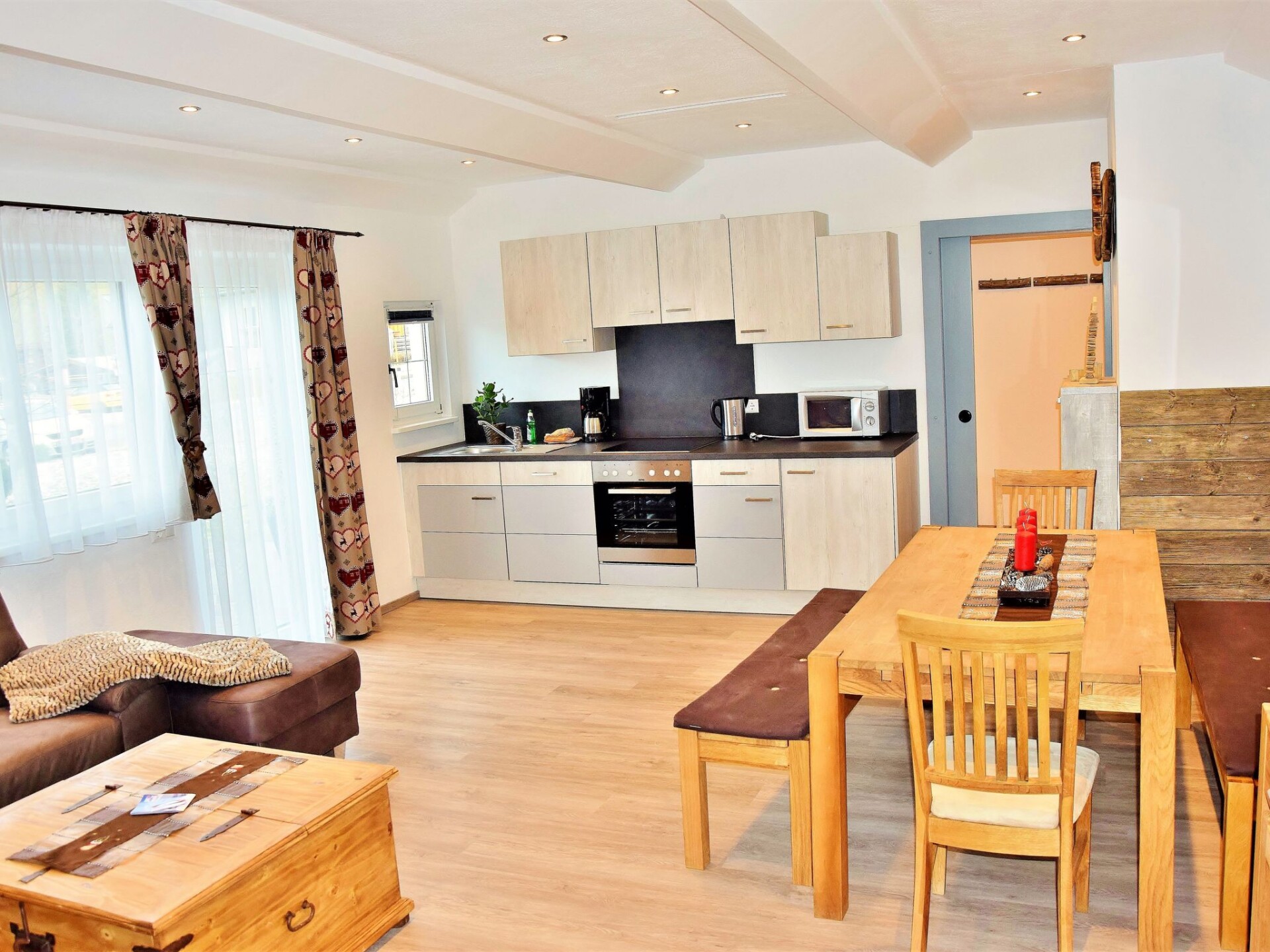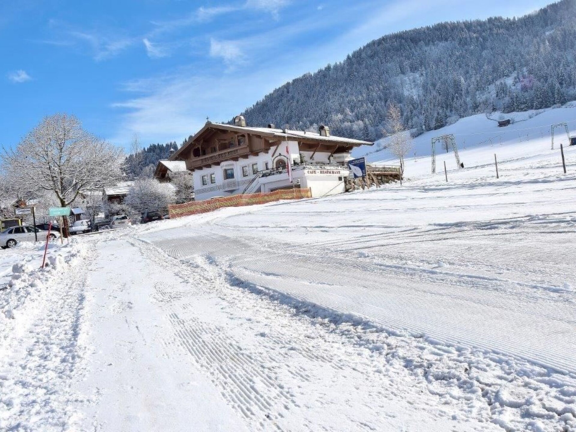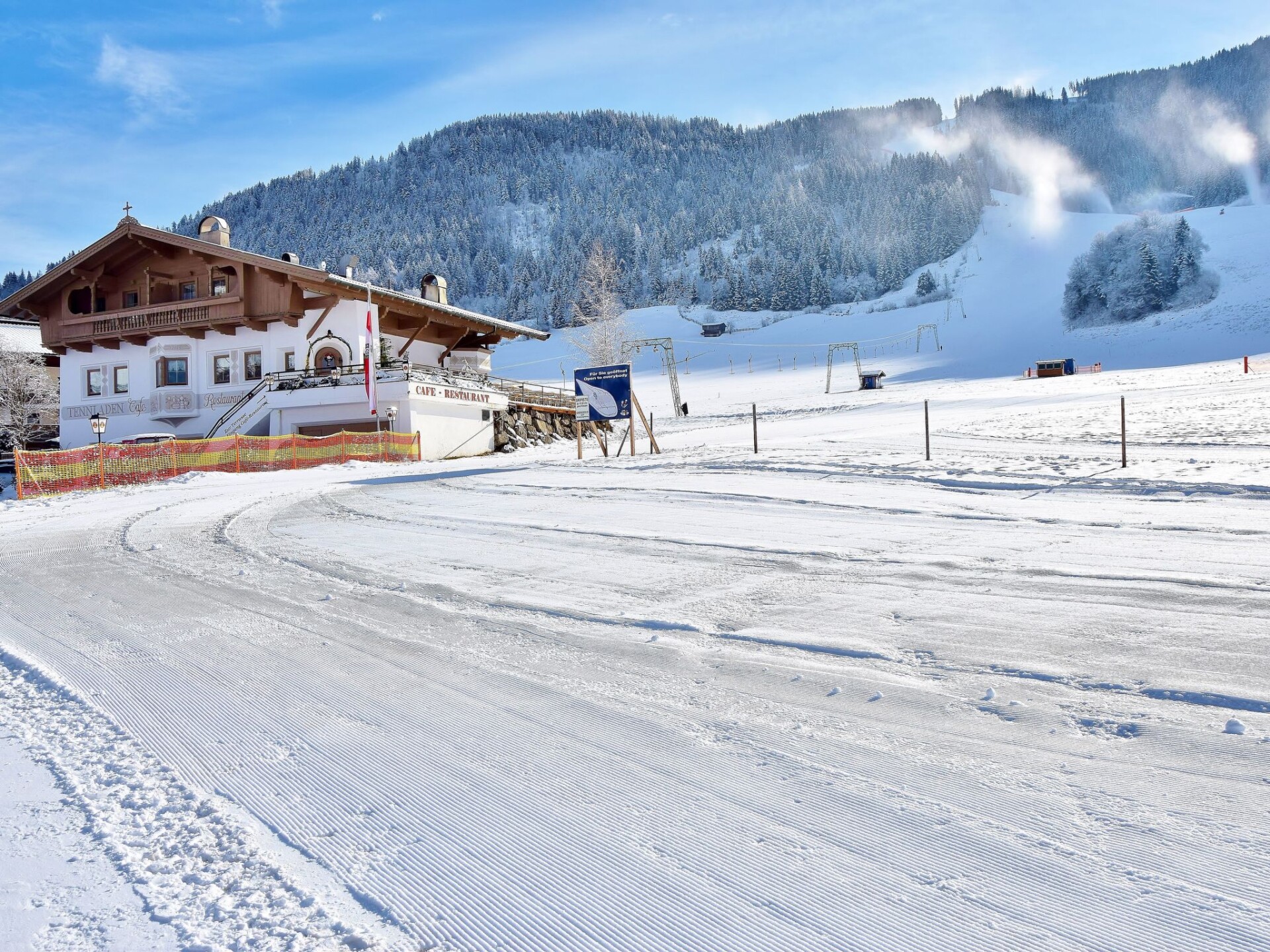 The AUSTRIA DELUXE flat is located on the ground floor!The brand new holiday flat has a size of 65 m²!The AUSTRIA DELUXE flat offers luxury for 6 people and is equipped as follows: 2 x bathrooms with shower and WC (hairdryer) 1 very large living room with very large sofa bed and fully equipped kitchen (dishwasher, electric cooker, microwave, oven, coffee machine, fridge with freezer compartment) with sitting area, flat screen satellite TV 2 x bedrooms with double bed 2 x small anteroom If you do not want to prepare your breakfast in the fully equipped kitchen, we are happy to offer you our flat with breakfast service!In the house is the restaurant Tennladenstüberl which is known for its delicious dishes. Enjoy our offer flat with half board! There are plenty of parking spaces and a large garden right outside the front door. Bed linen and towels are available. FREE W-LAN! We are happy to provide you with an extra bed, a baby travel cot, a hire pushchair and a high chair at any time.ski cellar directly on the ski slope! With ski boot heating.