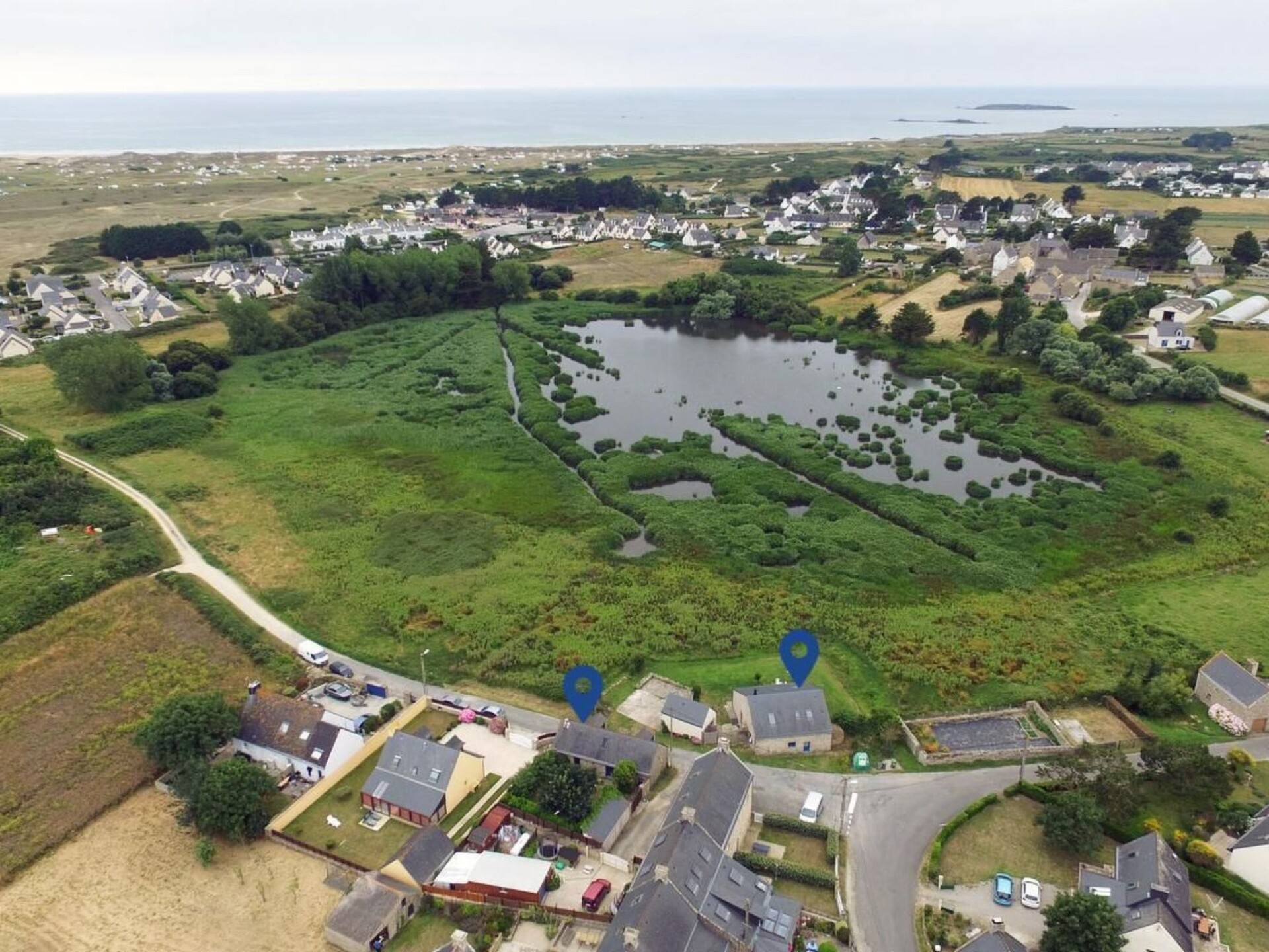 This holiday accommodation is located in a small village (approx. 30 houses) opposite a small pond (nature reserve) where various bird species can be observed. The house is situated on a very quiet road which can only be used by residents. Otherwise this is the cycle and footpath to the 10 km long sandy beach of Erdeven, which is 800 metres away.In the completely enclosed and secluded garden, you can enjoy your aperitif while listening to the sound of the sea and cooking fish and seafood on the barbecue. The garden is for the exclusive use of the guests and does not have to be shared with anyone else. From all rooms you have an unobstructed view over a 4 hectare nature reserve, where many rare bird species can be observed (don't forget your binoculars). The granite walls inside and outside are not only typical of the country, they also provide the necessary freshness on hot summer days. When the wind blows in from the Atlantic in autumn or spring, you feel really safe behind these walls. There is a car park right next to the house, so nothing stands in the way of arriving by car.The living/dining area is on the ground floor, with windows facing both south-west towards the pond and glass doors facing south-east towards the garden. Also on the ground floor are the open-plan kitchen, a separate WC and the bathroom with bathtub. The kitchen is equipped with all the necessary appliances for cooking and baking. After cooking, the dishwasher does the rest of the work so that nothing stands in the way of a relaxed meal. But breakfast can also get off to a good start, thanks to the coffee machine, toaster and kettle. As the fridge also has a freezer compartment, food can be stored perfectly during your stay. The two bedrooms are located on the upper floor. One with a double bed (160 cm x 200 cm - with 2 mattresses 80 x 200) and the other with two single beds (90 cm x 200 cm). There is also a children's extra bed (60 cm x 150 cm) in the anteroom. There is heating in all rooms. Parents with small children can also be provided with the following equipment: a folding cot, a high chair, a baby bath, a buggy for walking and a gate to block the stairs (stair gate).You can explore the menhirs and dolmens by bike. There is a bike hire shop, a pizzeria and a bistro/café with W-LAN connection about 400 - 500 metres away. In the high season, there is also a small grocery shop offering fresh croissants and baguettes. All other shopping facilities can be found in Erdeven, approx. 4 km away. There are also two supermarkets and restaurants as well as an ATM, petrol station, butcher and bakery. Most of these are also open on Sunday mornings.A note for dog owners: the fully enclosed garden and the path in front of the house to the beach are ideal for travelling with your four-legged friend and taking long walks. However, the municipality of Erdeven has decided to no longer accept dogs on the beach during the high season. To avoid any problems, bookings with dogs will therefore no longer be accepted from the 2nd week of July until the last week of August. For a family holiday with friends, the holiday home opposite is also available. Energy costs are charged according to consumption. The first 50 kilowatt hours are included. However, the house is not suitable for people with restricted mobility, as there are several unsecured steps both in the garden and in the house. The last three steps also do not have a DIN-compliant handrail. If required, a transfer from the airport can be arranged or you can use the car hire service at Nantes airport. If you are travelling with a dog, we would like to point out that there is a leather sofa in the living room on which dogs are not permitted. Please also do not take your dog upstairs, especially not into the bedroom. FRBRE560542024