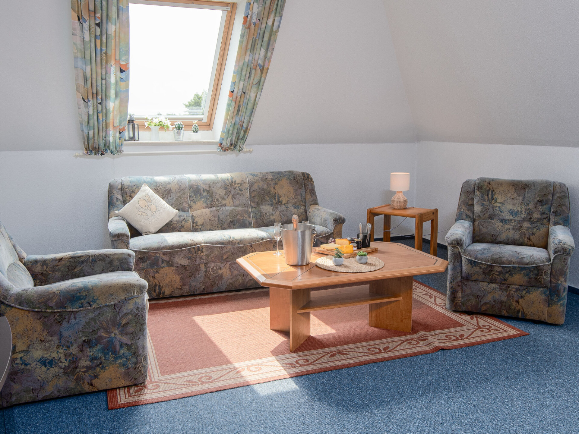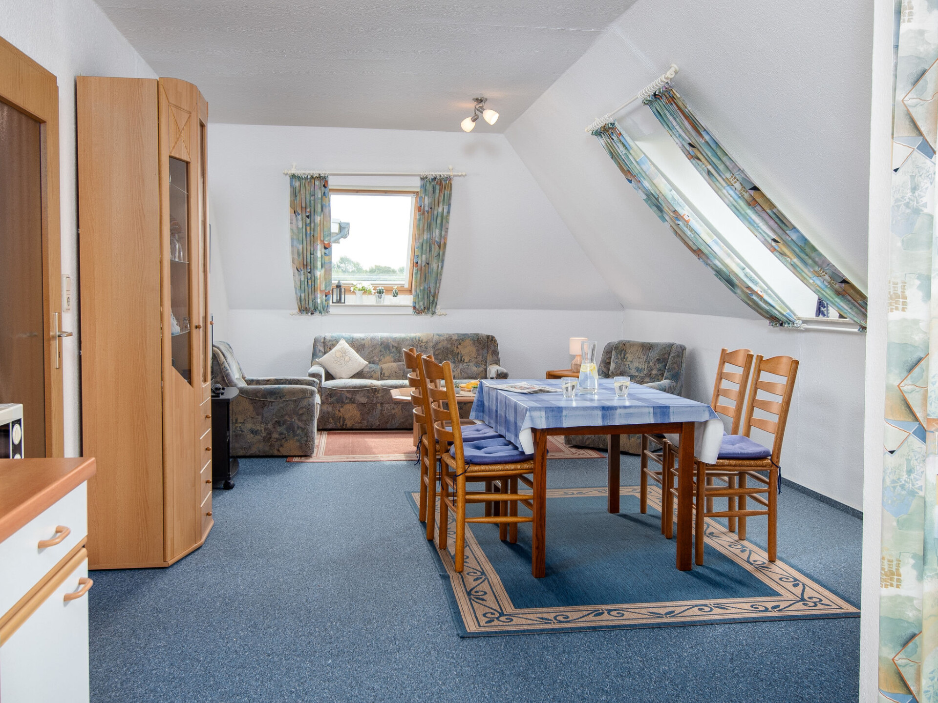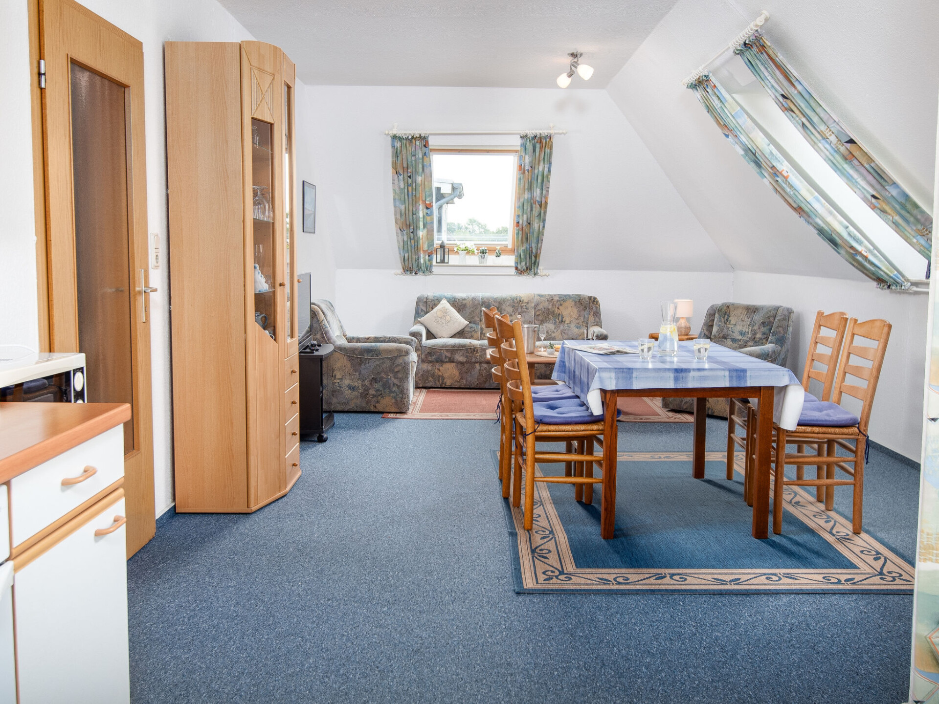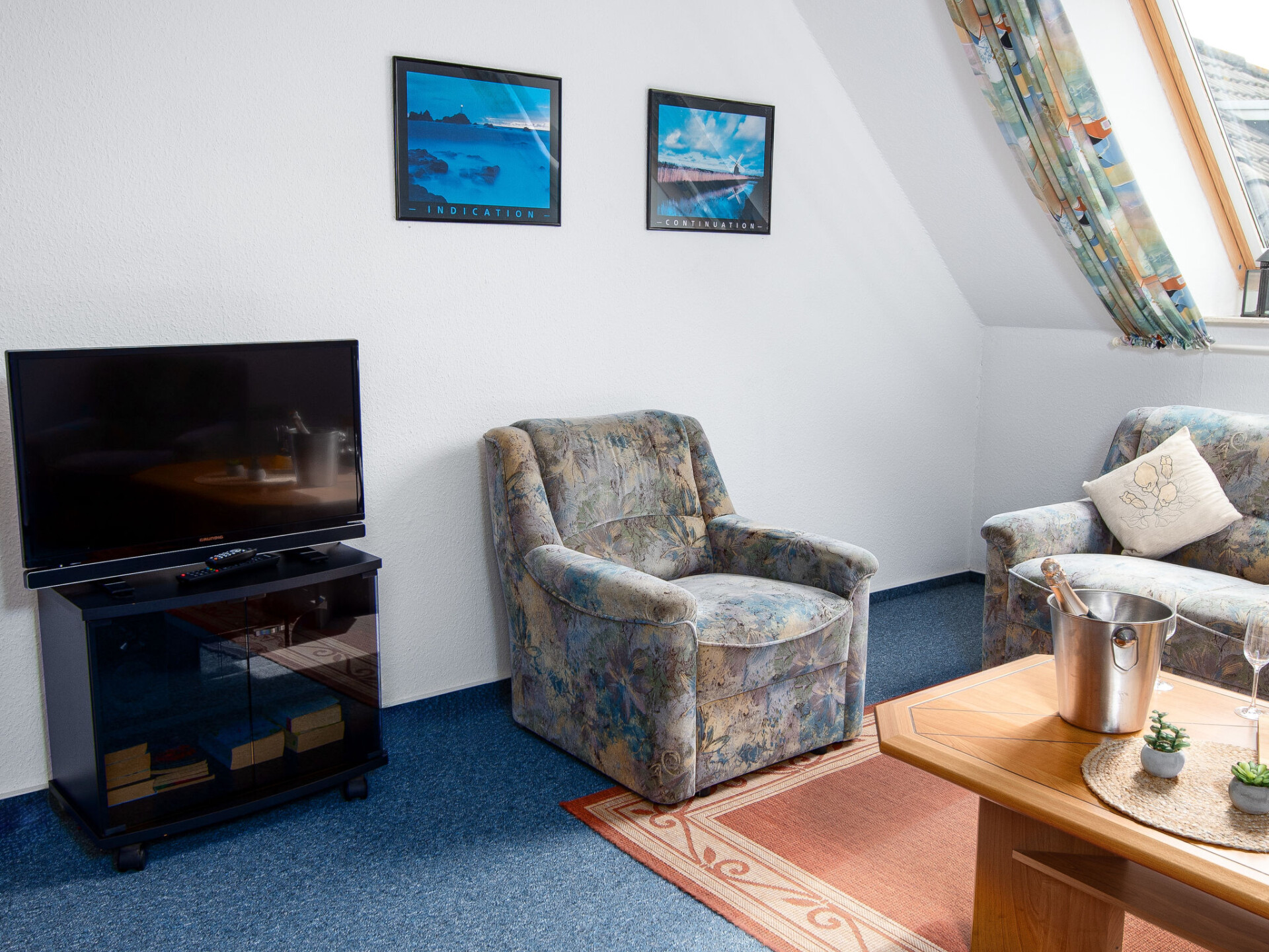 "Mantelmöwe", appartement 2-kamers 65 m2, op de bovenste verdieping. Afgeschuinde daken, gezellig ingericht: woon-/eetkamer 32 m2 met Kabel-TV (Flatscreen TV), stereo-installatie. Uitgang naar het balkon. 1 kamer 13 m2 met 1 2-pers bed (2 x 90 cm, lengte 200 cm). Kookhoek (4-pits kookplaat, oven, broodrooster, waterkoker, magnetron, elektrische koffiemachine). Douche/WC. Balkon 10 m2, op het noordwesten gelegen en op het westen gelegen. Balkonmeubilair. Ter beschikking: kinderstoel (extra), haardroger. Internet (Internet (WiFi), gratis). Niet rokers woning. Rookmelders.