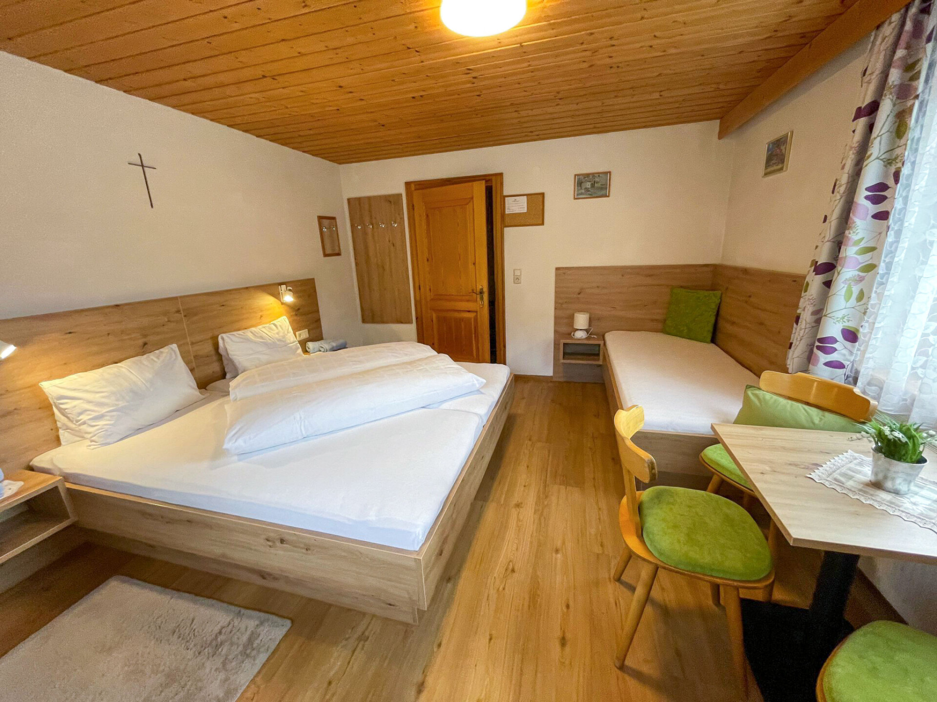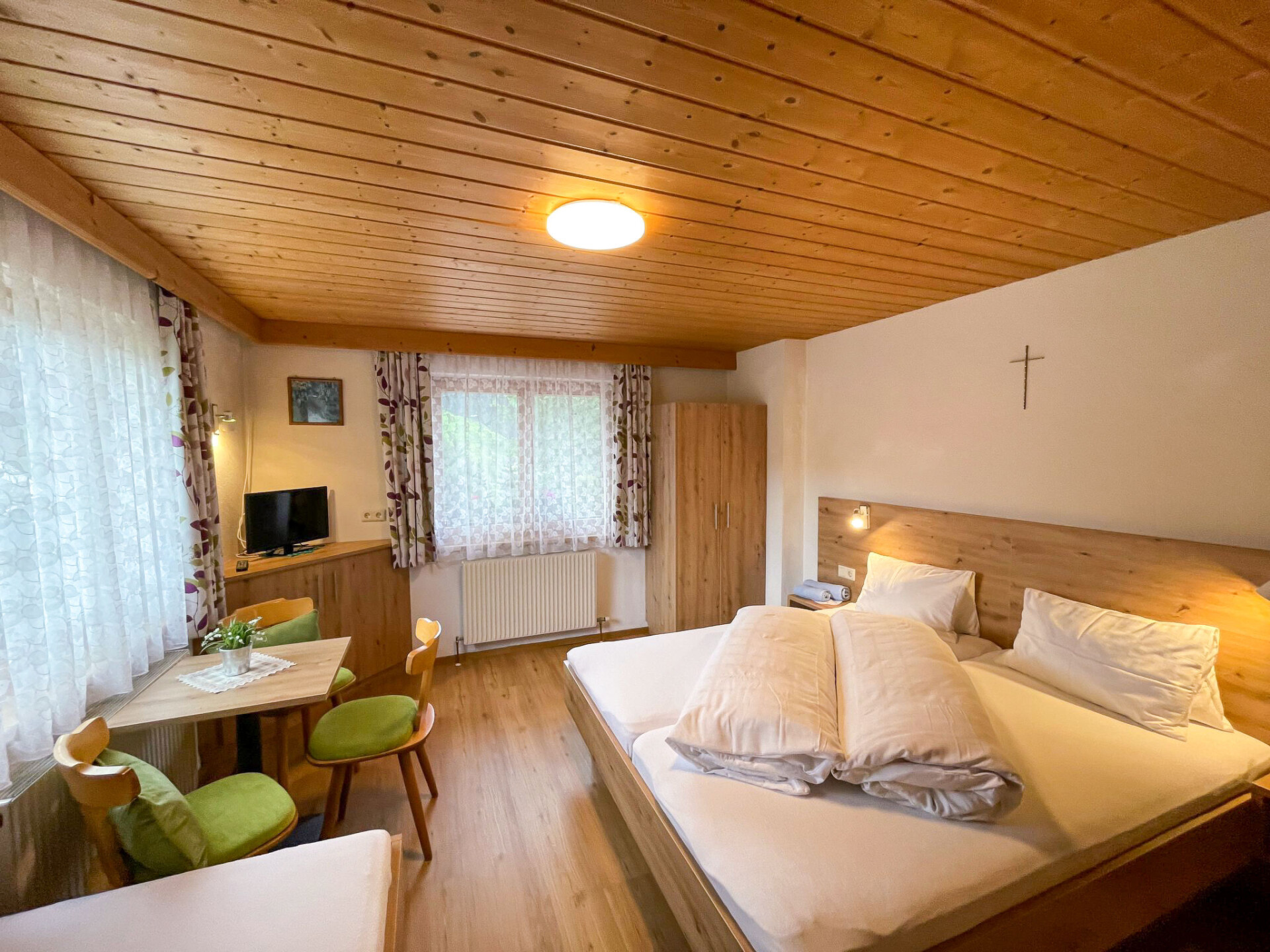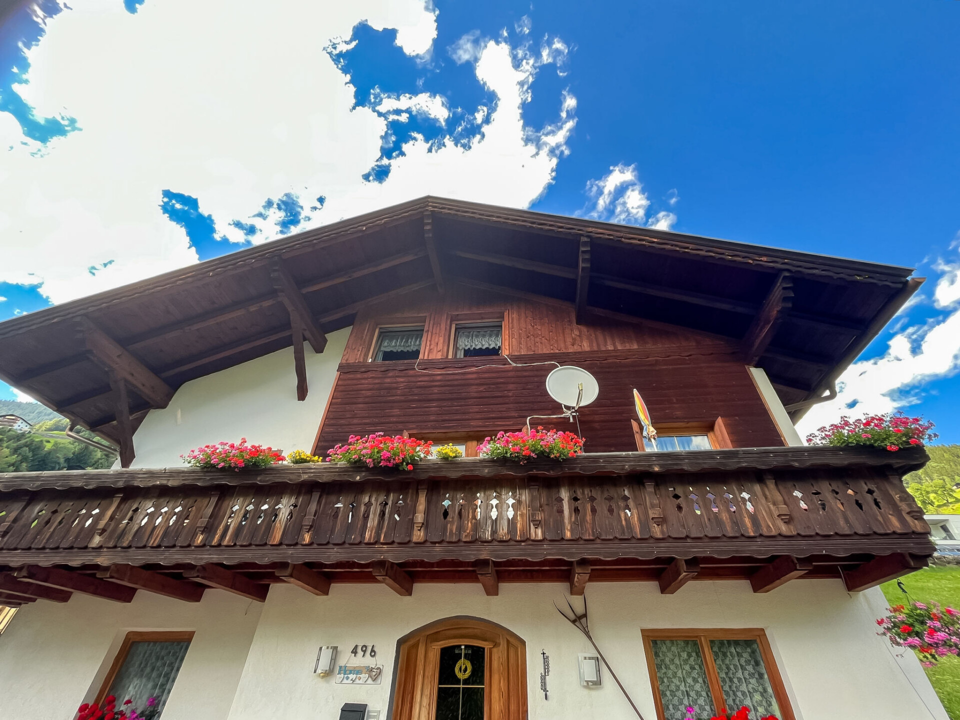 "Maria", appartement 3-kamers 50 m2, op de begane grond. Gezellig ingericht: 1 open 2-pers. kamer met Sat-TV. 1 kamer met 1 bed, 1 2-pers bed en Sat-TV. Kleine woonkeuken (4-pits kookplaat, oven, broodrooster, waterkoker, magnetron, elektrische koffiemachine) met eethoek. Douche/WC. Vloerbedekking. Zithoek in de tuin. Terrasmeubelen, ligstoelen. Mooi panoramazicht op de bergen en het dal. Ter beschikking: kinderbed. Eén tweepersoonskamer is buiten het appartement. Niet rokers woning. Rookmelders, brandblusser.