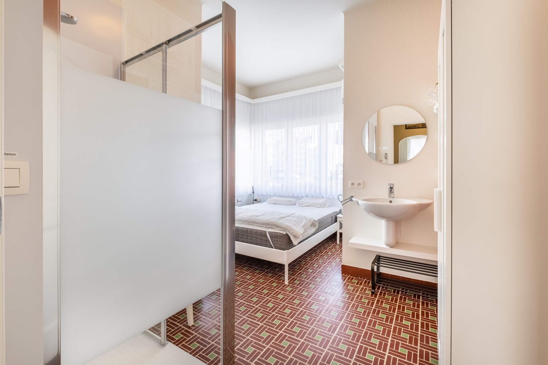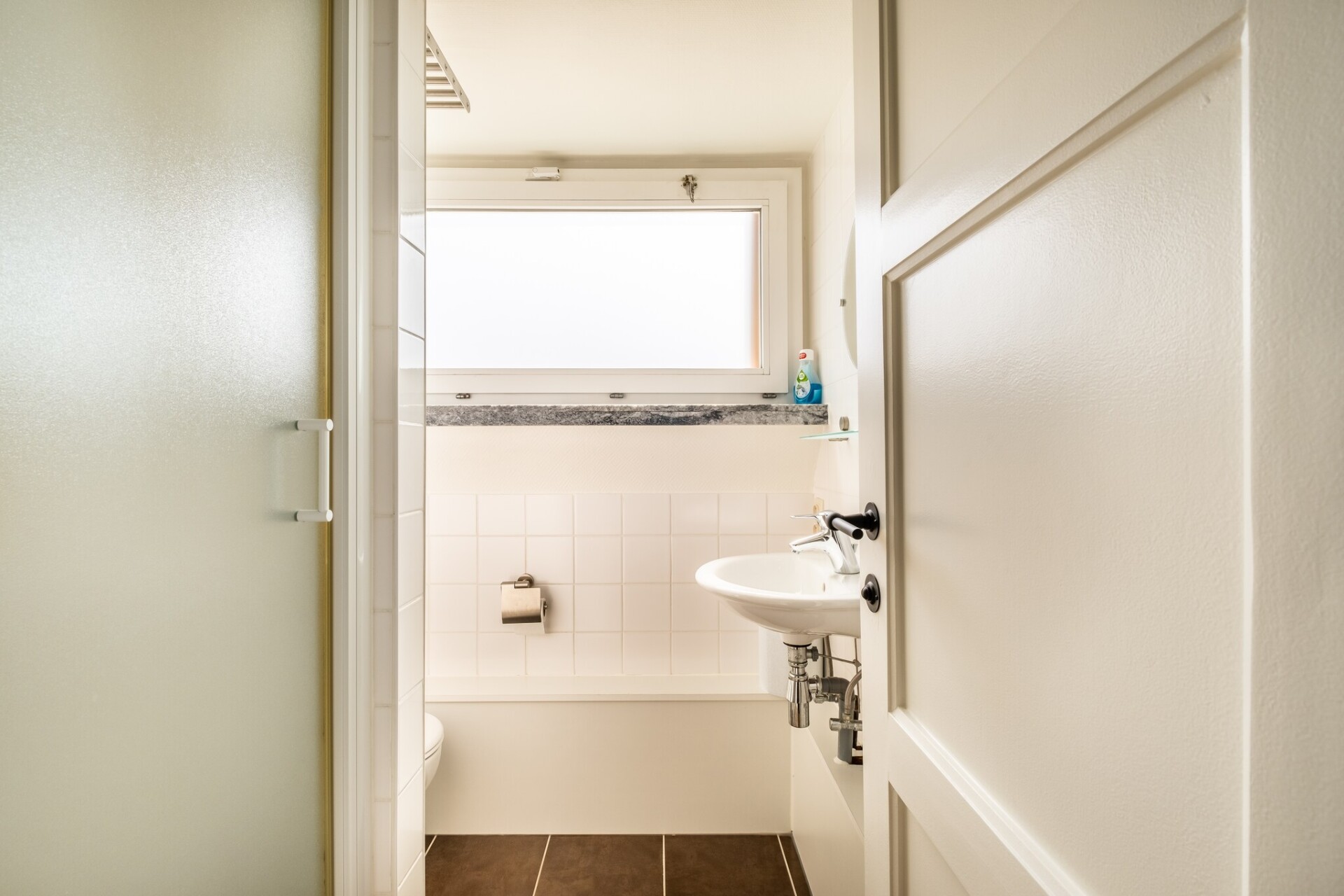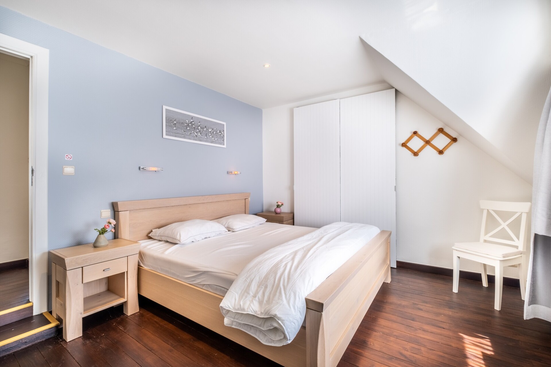 Op de gelijkvloers bevinden zich de inkomhall, een toilet, een slaapkamer met dubbel bed met wastafel en eigen douche, de keuken, de woonkamer/zitkamer met toegang tot het terras. Via de keldertrap heeft u toegang tot de garage (2 auto's).