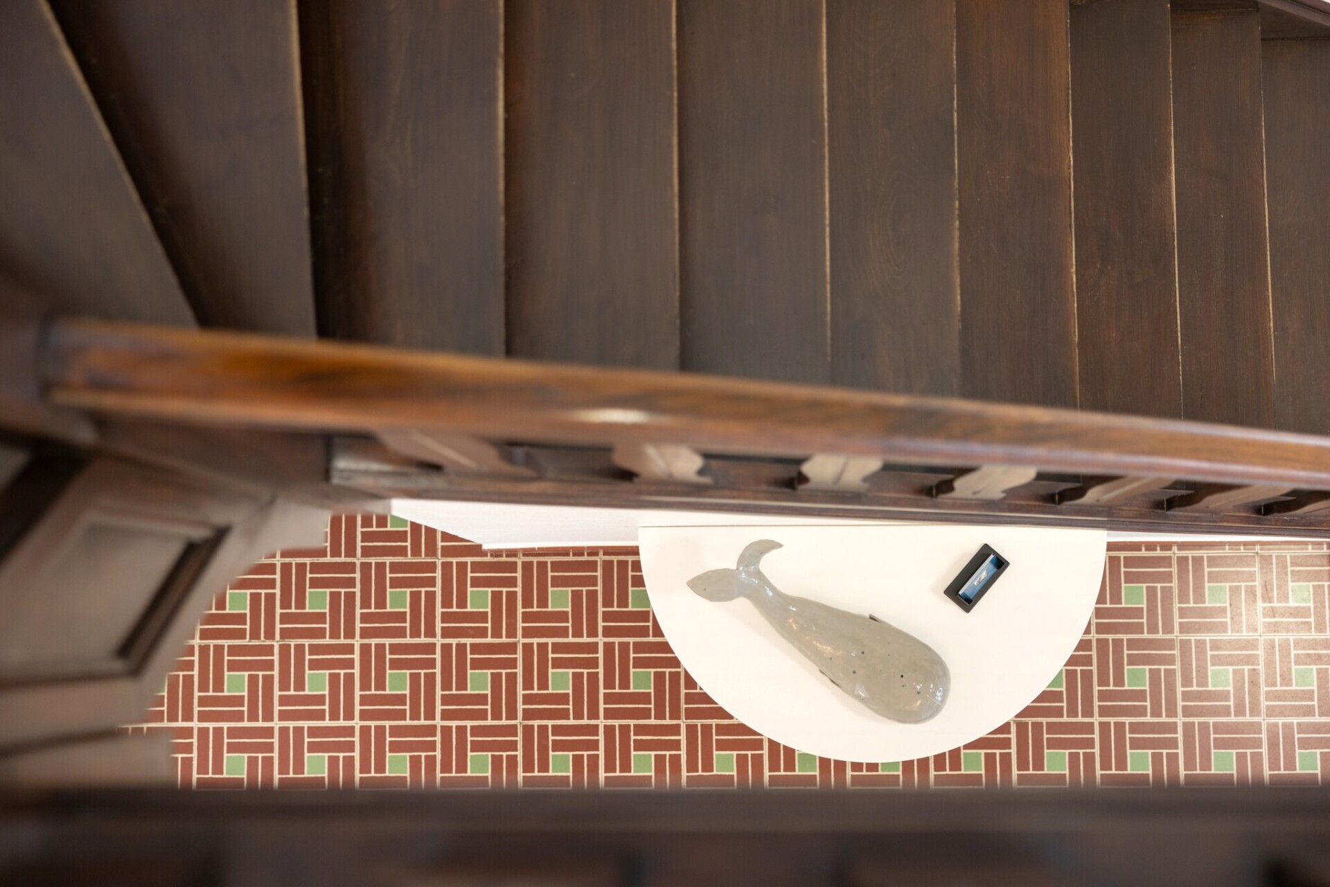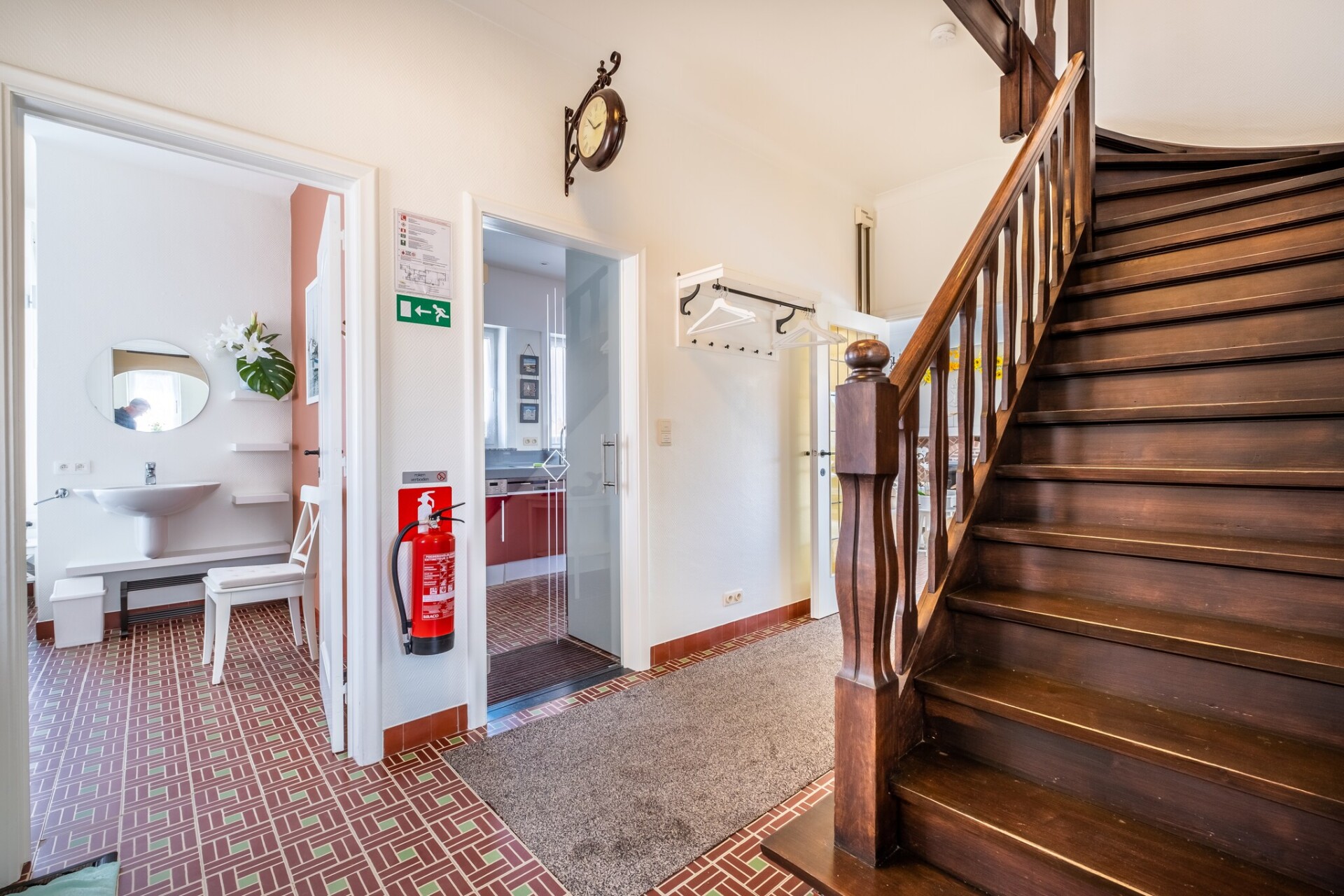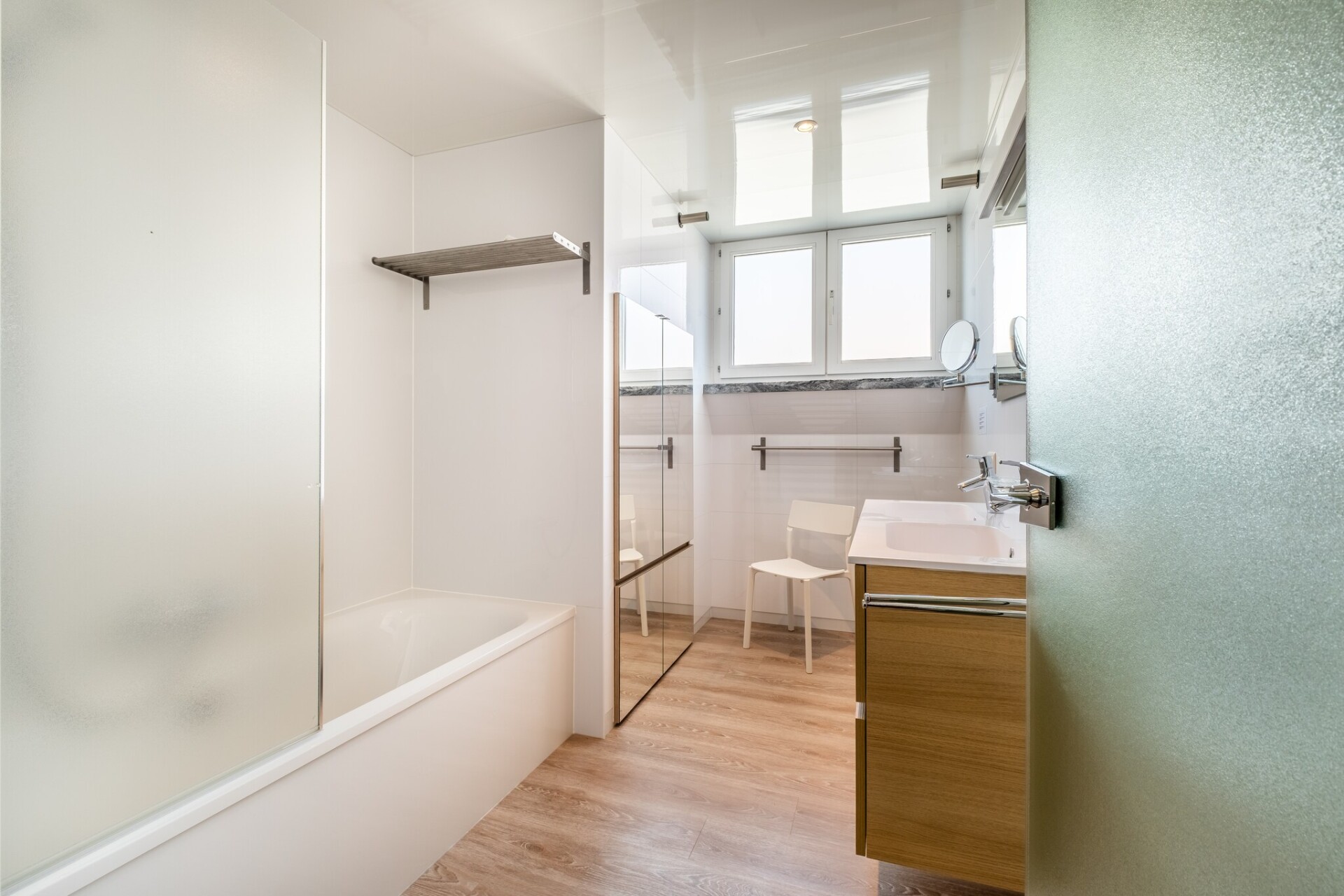 Op de gelijkvloers bevinden zich de inkomhall, een toilet, een slaapkamer met dubbel bed met wastafel en eigen douche, de keuken, de woonkamer/zitkamer met toegang tot het terras. Via de keldertrap heeft u toegang tot de garage (2 auto's).