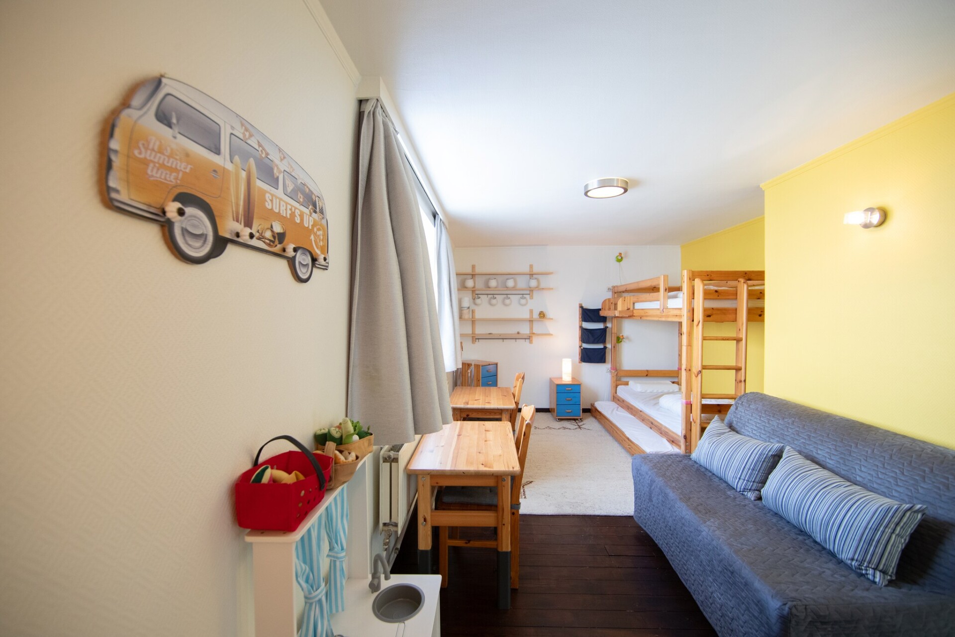 Op de eerste verdieping bevinden zich 3 slaapkamers waarvan 2 met een dubbel bed en 1 met een stapelbed voor 3 personen. Er zijn 2 badkamers waarvan één met douche lavabo en toilet, één met bad met douchewand en lavabo. Er is ook nog een afzonderlijk toilet op de 1ste verdieping.