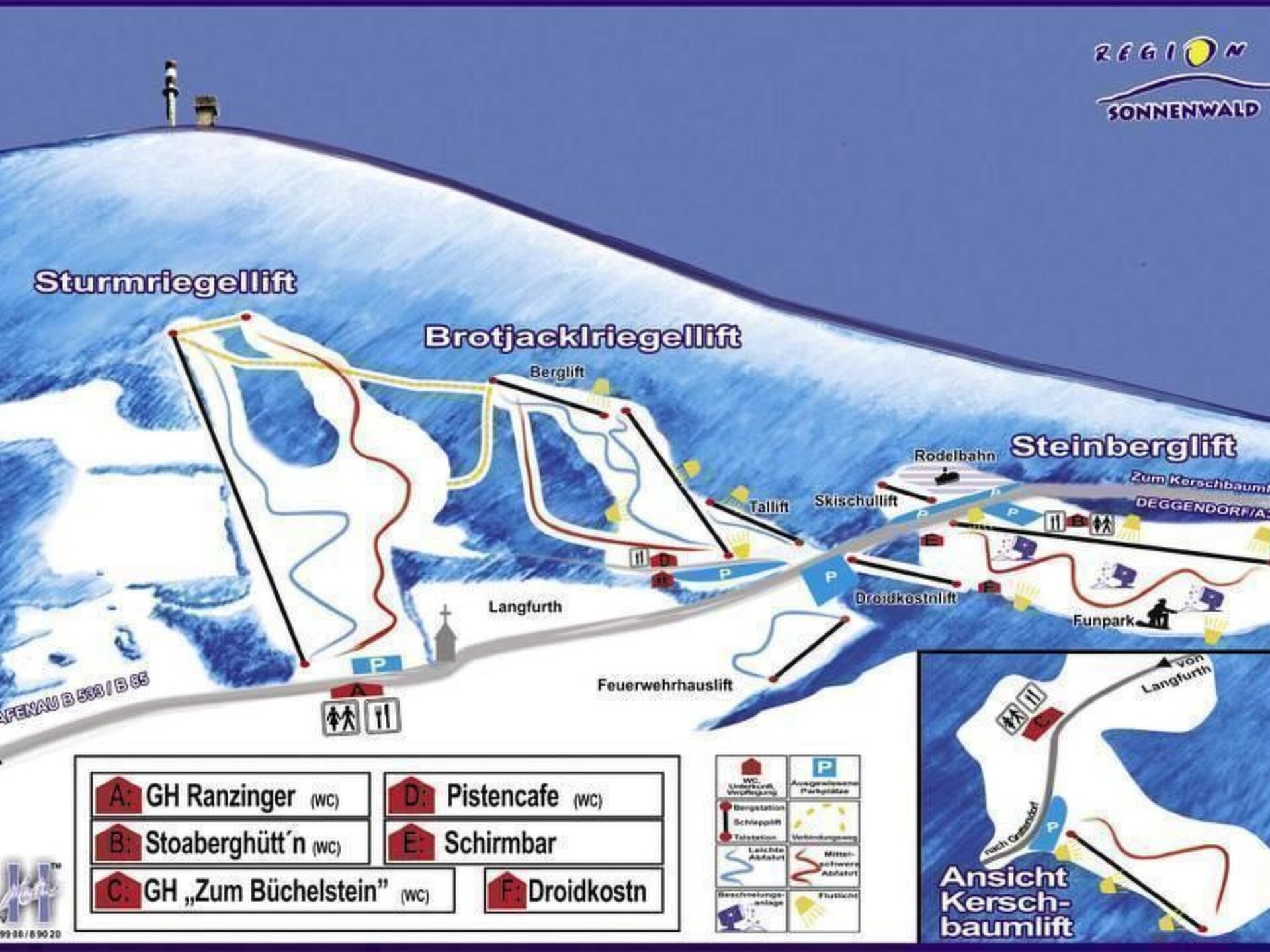 This renovated holiday apartment welcomes you with a lovely view into the distance at an altitude of 800 metres. It is in Schöfweg-Langfurth, by the Brotjacklriegel (1016m), which is also a landmark of the Sonnenwald region in the Bavarian Forest. The two-room apartment is on the first floor of the building and has about 44m² of living space. It has a bedroom with a double bed (160 x 200cm) and a spacious bathroom with a skylight, bath with a shower attachment, washbasin, hairdryer and WC. There is also a living and dining room with a kitchen unit and a dining table for meals together. The living room provides a sofa bed (160 x 200cm) and satellite TV. The little kitchen unit is equipped with a ceramic hob with two rings, a microwave and a fridge with a freezer compartment. Wireless Internet access is available.There is a good restaurant above the residential house. It is only 100 metres to shops. The village pond invites you to go swimming in summer. There are seven lifts, of which two with floodlights within walking distance. There are 23km of cross-country skiing trails nearby. Snow is almost guaranteed in this region. For those who love peace and quiet and nature, without being far from places of interest, towns and hiking possibilities, this is just the right place. There are hiking trails right from the house.You can enjoy a beautiful view from the balcony, often as far as the Großer Arber. The shared garden provides a grill, sun loungers and a playground for children. The basement of the house has a washing machine and dryer for shared use, both for a fee, a ski storage cellar and a little fitness room.